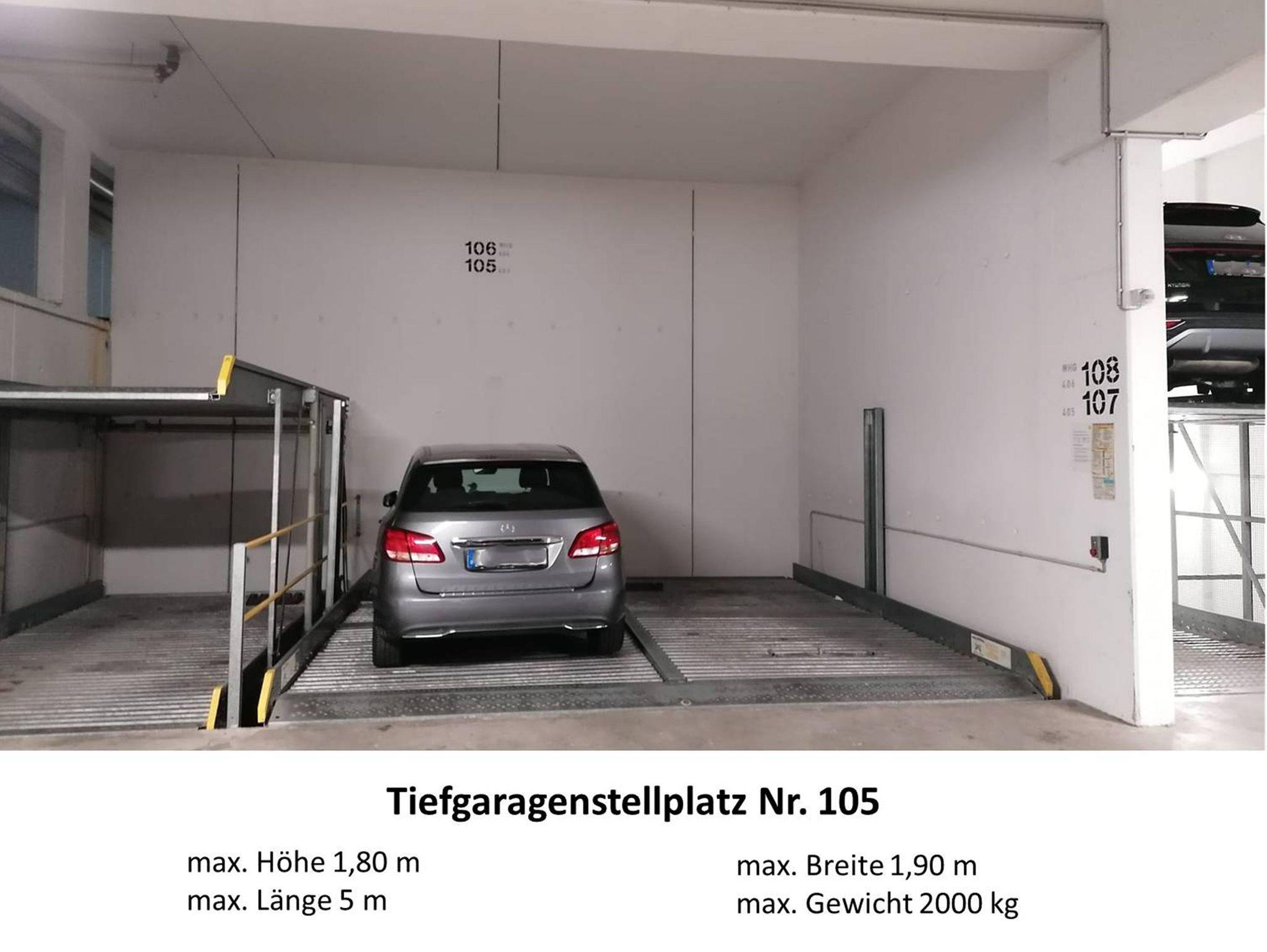 Zur Wohnung gehört ein Tiefgaragenstellplatz mit der Stellplatznummer 105. Dabei handelt es sich um eine Doppelparkeranlage (Standardanlage bei Stellplatzbreite 2,30 m, untere Plattform). Bitte beachten Sie, dass Ihr Pkw folgende Angaben nicht überschreitet: