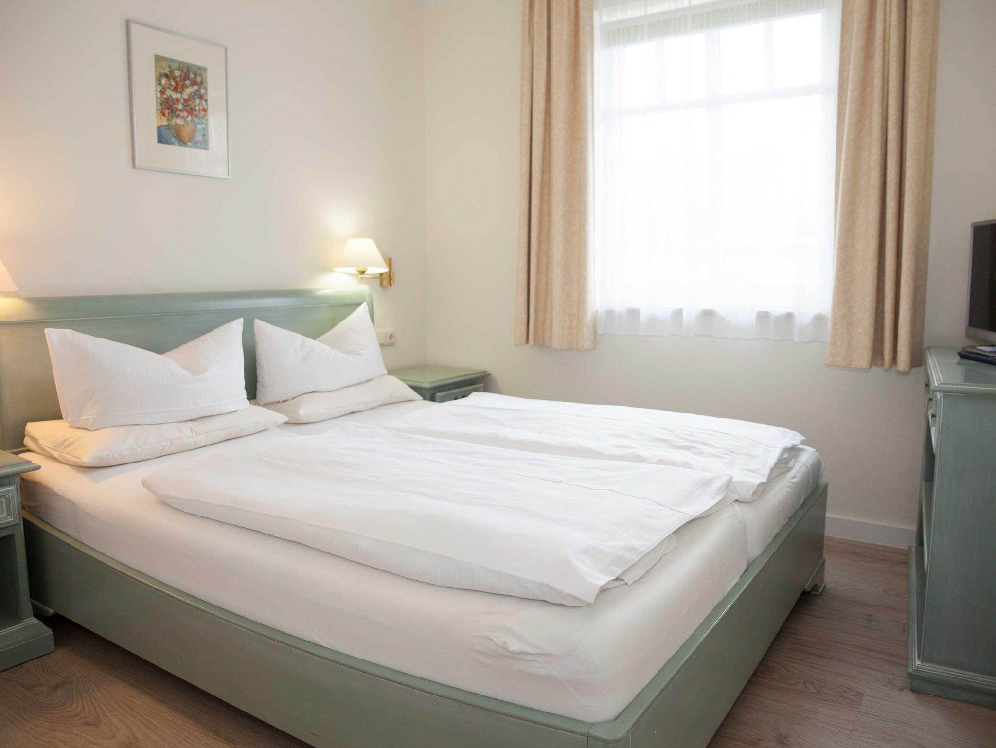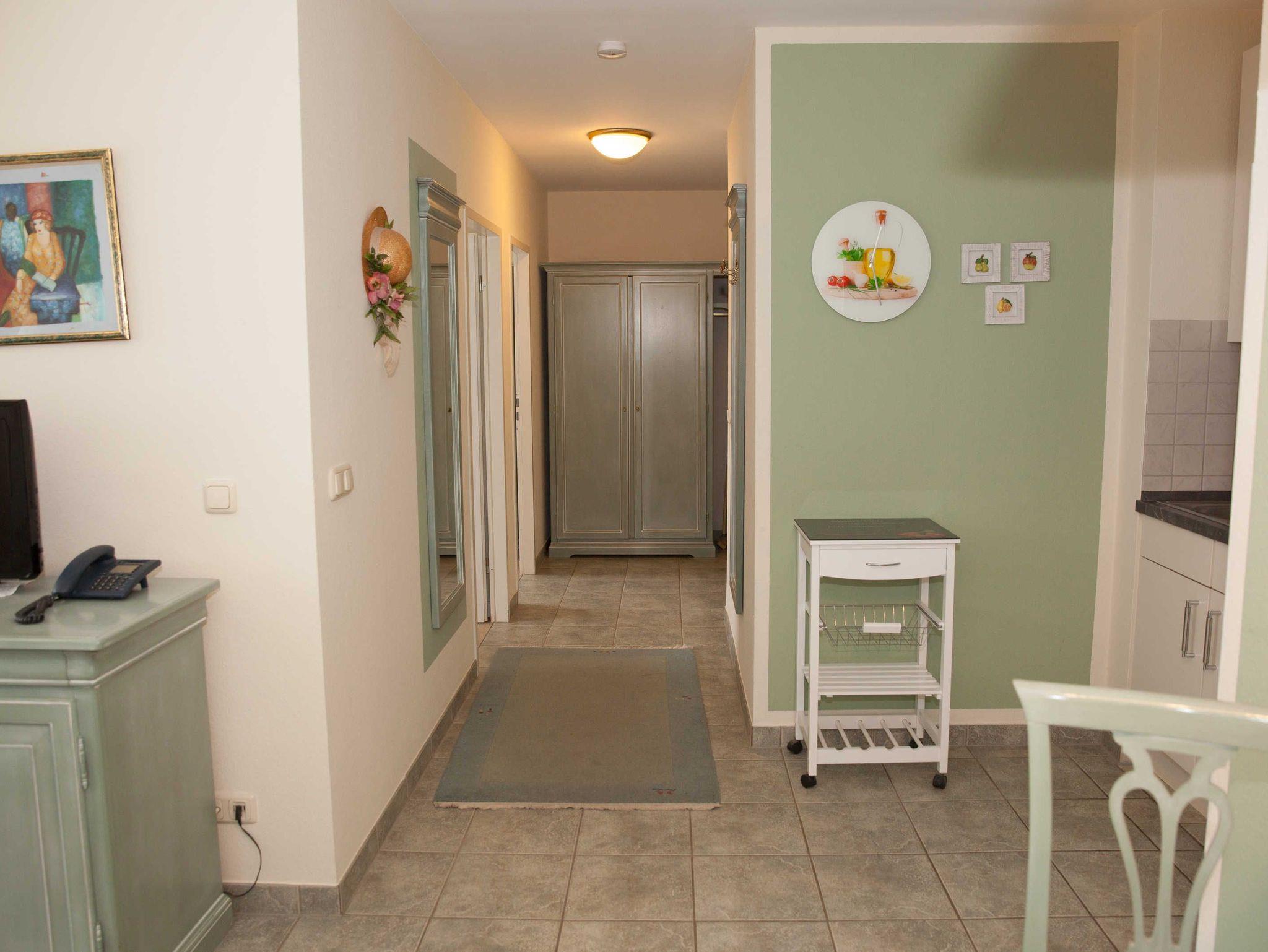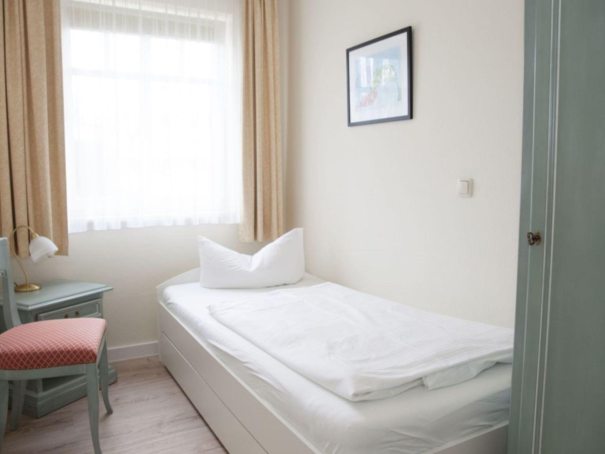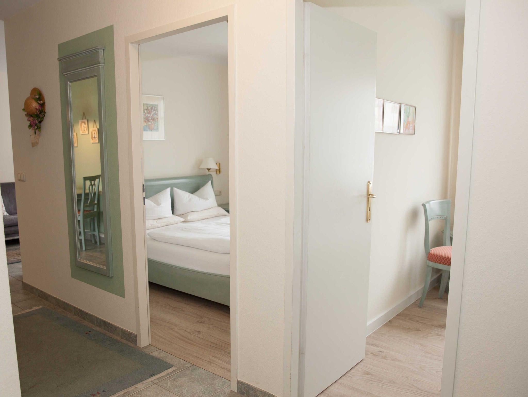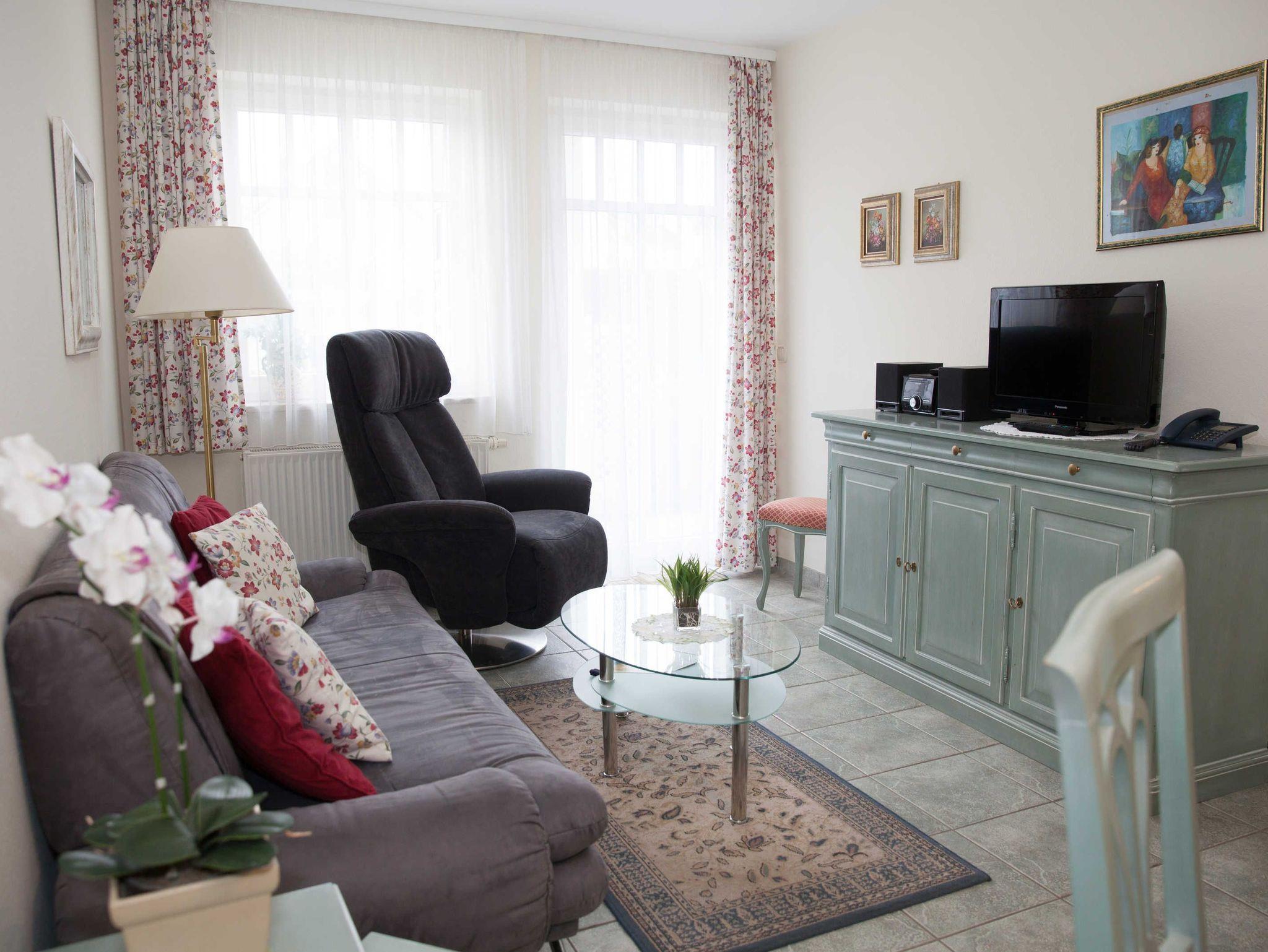 Nur 150 m vom Strand wohnen Sie in einer 3-Raum-Ferienwohnung. Die 42 qm große Wohnung liegt im Erdgeschoss. Das Wohnzimmer ist mit einer Couch, Couchtisch, Sessel, Anrichte, mit Kabel-TV (Flachbildschirm), Radio, Essbereich (Tisch und Stühle) und Küchenzeile ausgestattet. Die Terrasse mit Tisch und Stühle geht zur Westseite. Im Schlafzimmer stehen ein Doppelbett und eine kleine Anrichte und ein TV zur Verfügung. Im Gästezimmer stehen ein Bett mit ausziehfunktion, Nachtschrank und ein kleiner Kleiderschrank. Im Flur steht ein Kleiderschrank und eine Garderobe mit Spiegel. Die Küchenzeile wurde ausgestattet mit Mikrowelle, Kühlschrank, Kaffeemaschine, Zwei-Platten-Kochfeld, Toaster und Wasserkocher. Das Bad mit Dusche und WC komplettiert die Wohnung.