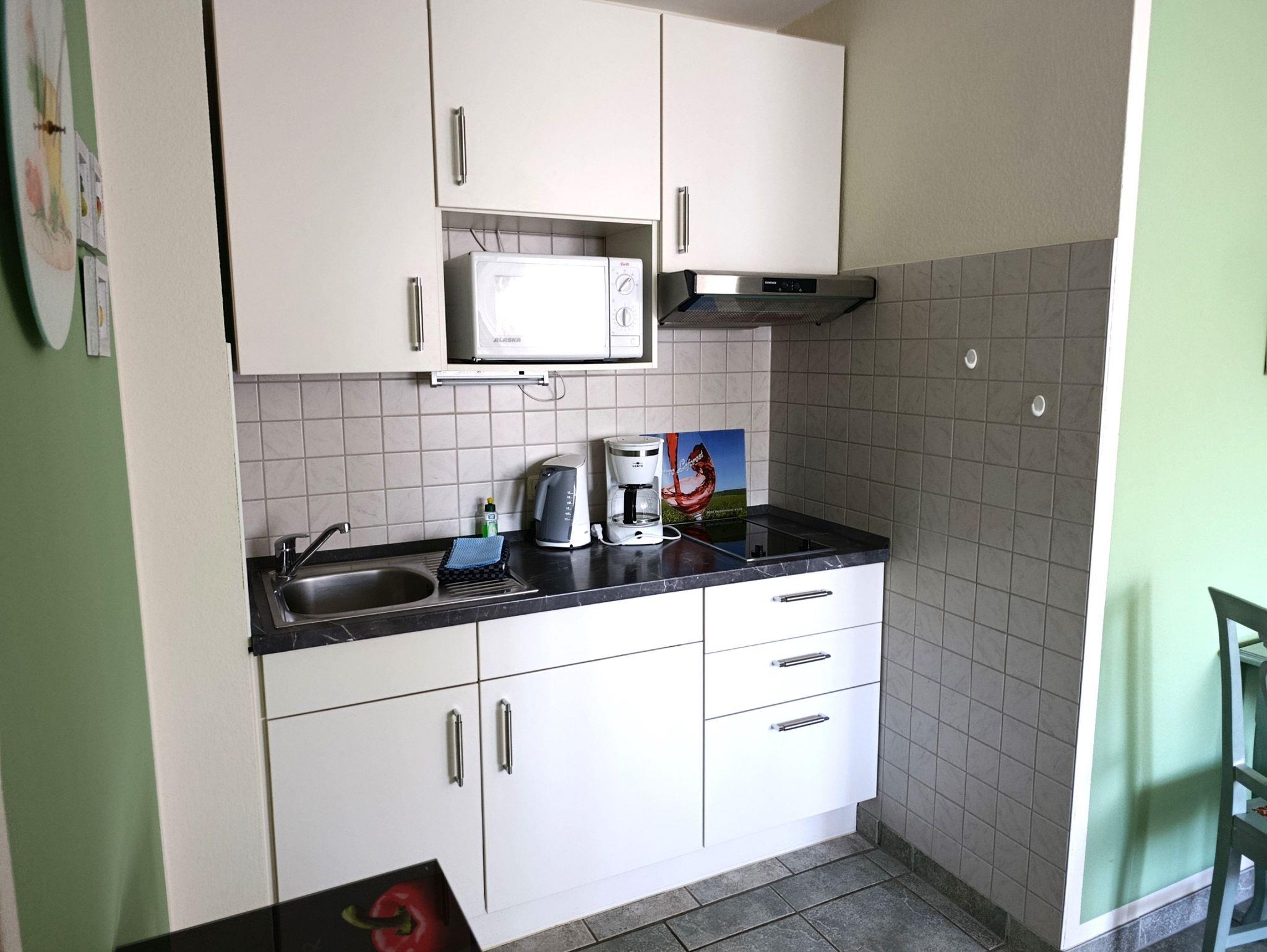 Küchenzeile mit Mikrowelle, Zweiplattenceranfeld, Kühlschrank mit Gefrierfach, Wasserkocher, Toaster und Kaffeemaschine.Badezimmer mit Dusche, WC,Waschbecken, Spiegel und Föhn.