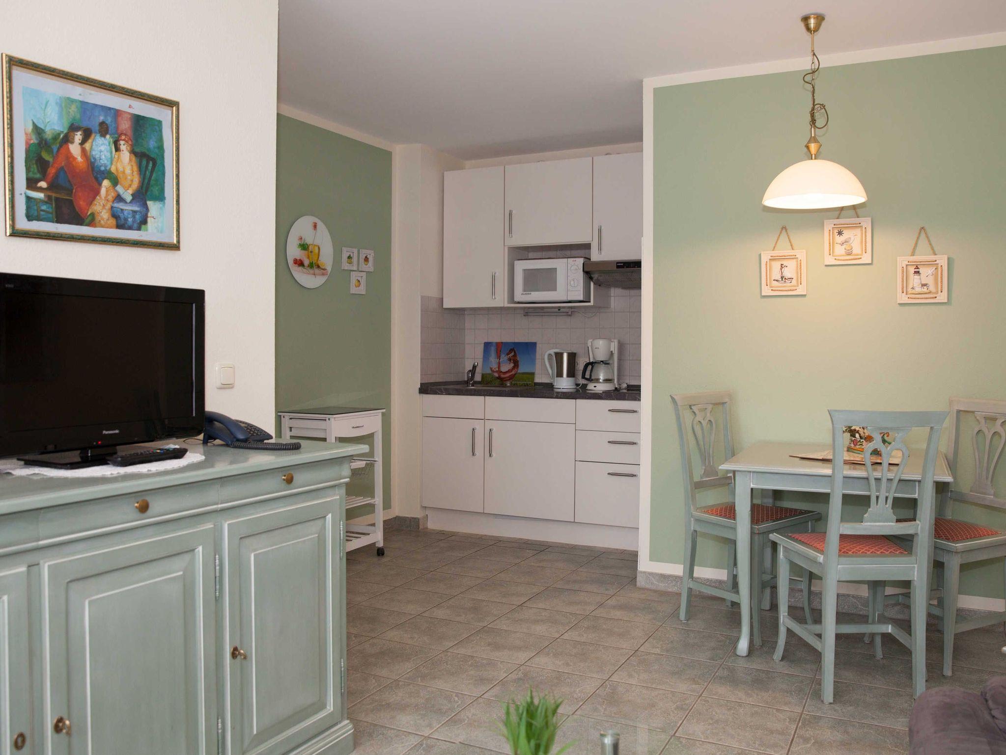 Wohnzimmer mit Couch, Esstisch, Küchenzeile, Kabel-TV und Radio.