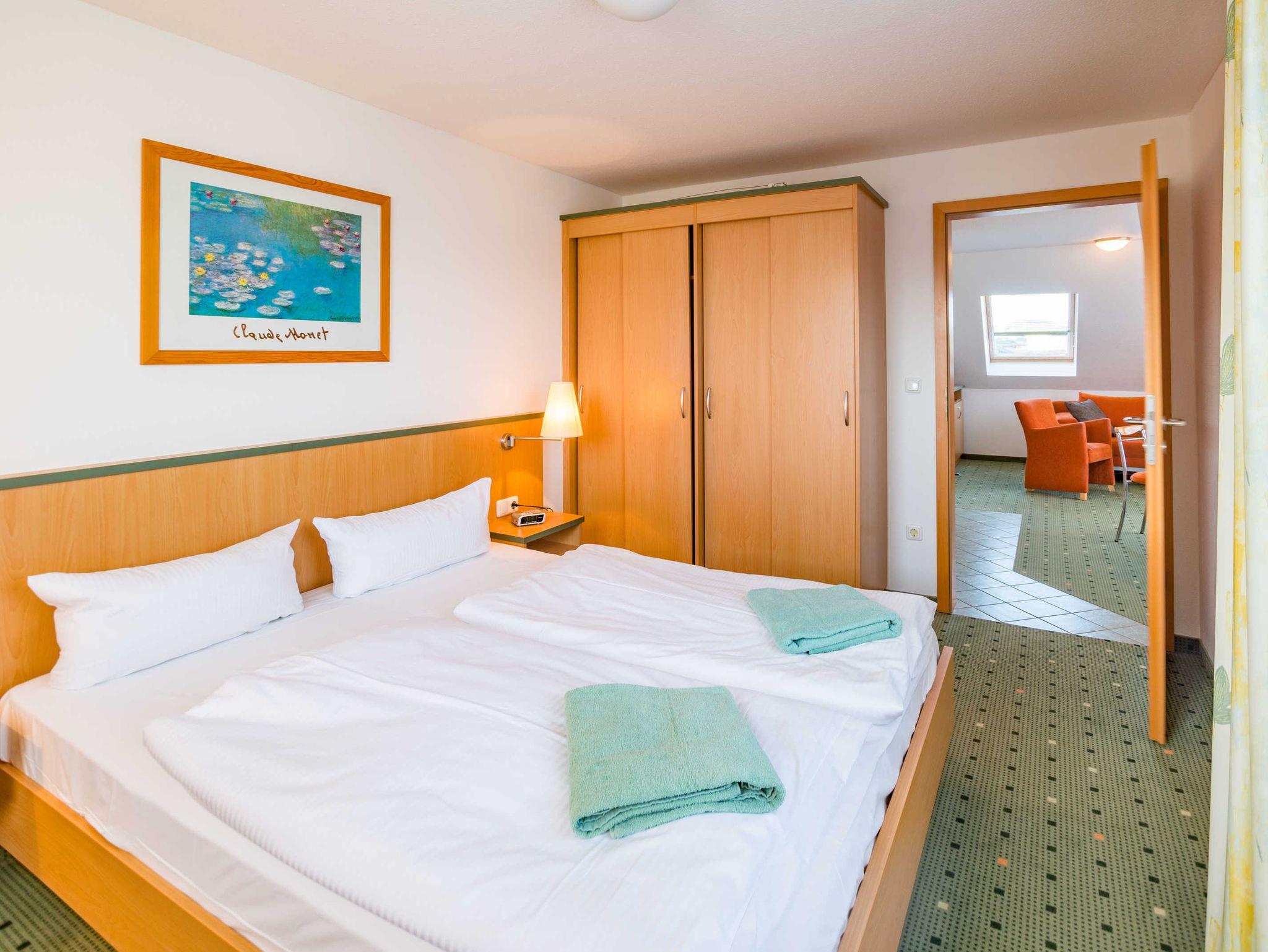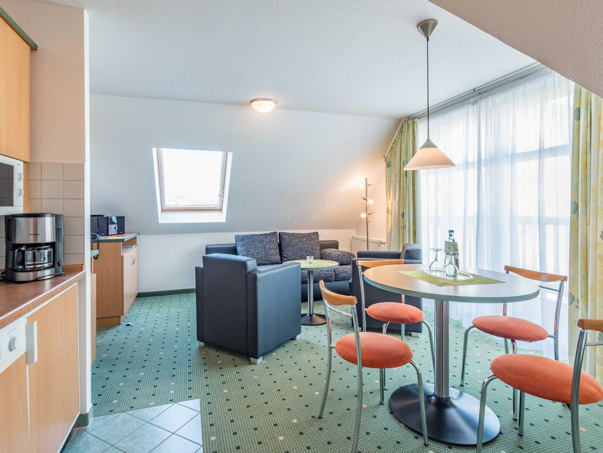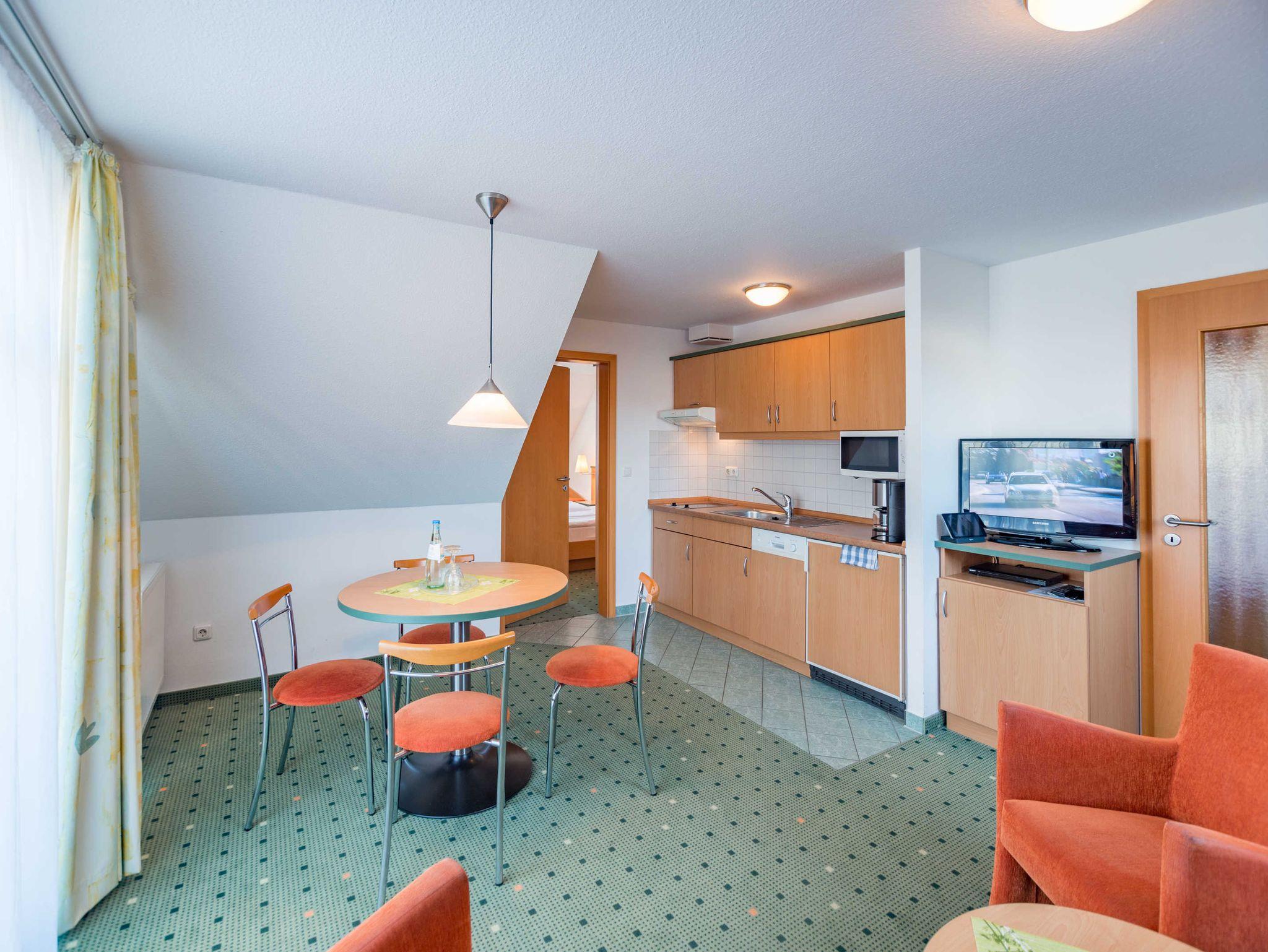Das 2-Zimmer-Apartment mit Teppichboden befindet sich in der 3.Etage des Apartmenthauses Waldeck. Mit rund 50 m² Wohnfläche und einem Balkon zur Nordseite, besteht das geräumige Apartment aus einem Wohnzimmer mit Schlafcouch und einer voll ausgestatteten Küchenzeile mit Geschirrspülmaschine, Kühlschrank, Mikrowelle, Zwei-Platten-Cerankochfeld, Kaffeemaschine, Wasserkocher und einem Toaster. Das Schlafzimmer verfügt über ein Doppelbett und ein Einzelbett, darüber hinaus bietet es genügend Platz für ein Kinderbett. Im Badezimmer befindet sich eine Badewanne, ein Fön wird Ihnen zur Verfügung gestellt. Das Apartment ist für maximal 3 Erwachsene und insgesamt 4 Personen geeignet.