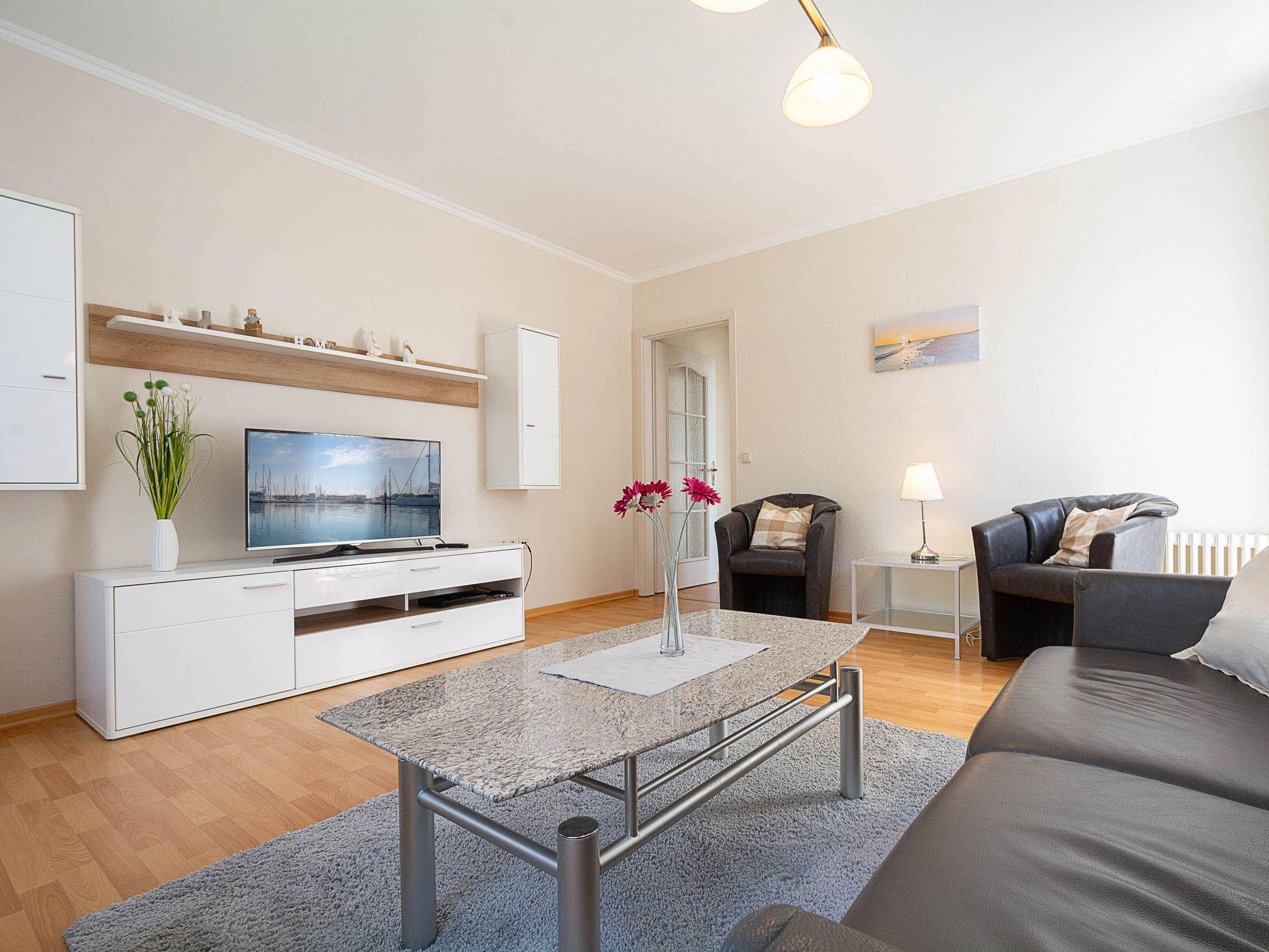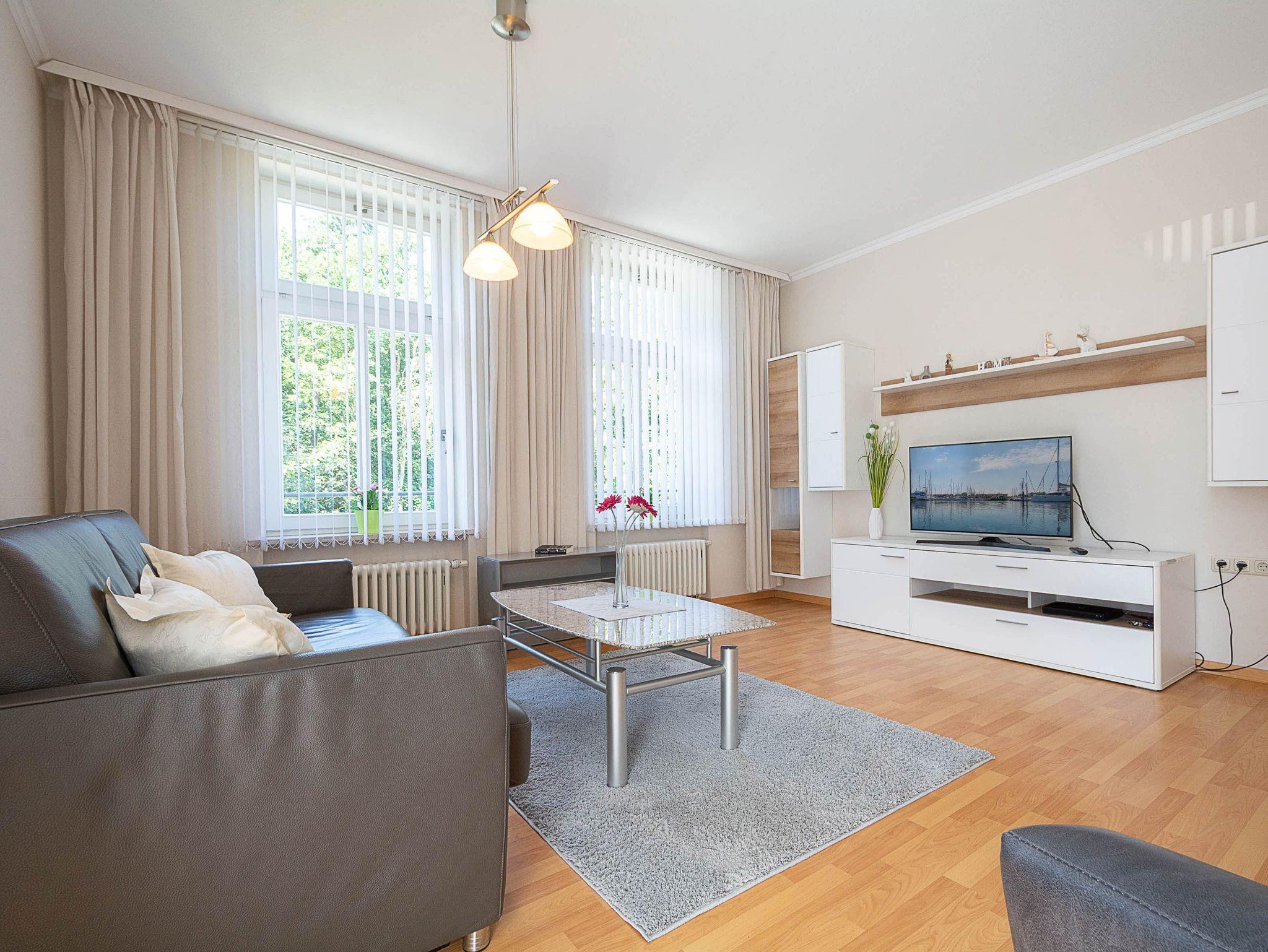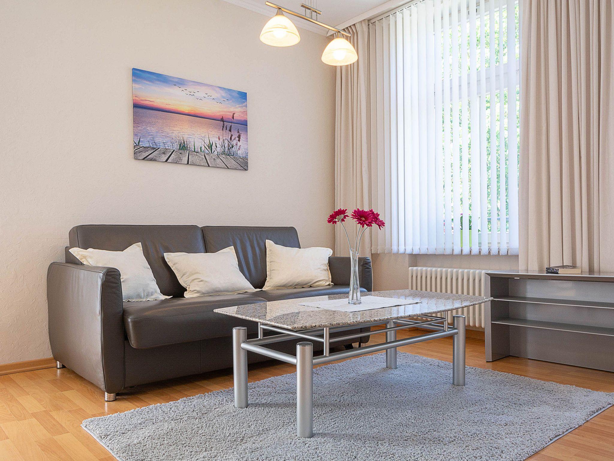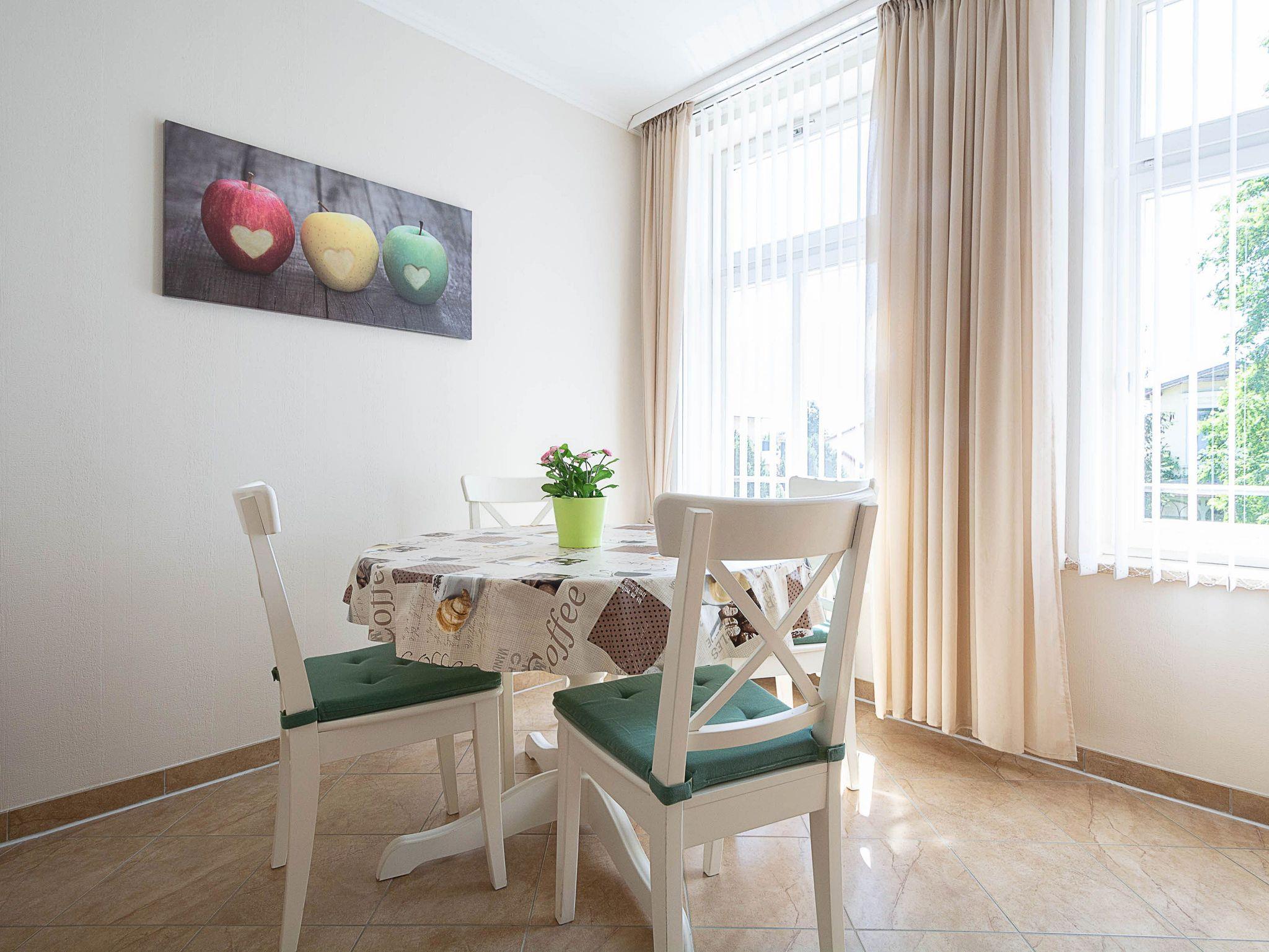 Sie wohnen in einer 59 m² grossen 2-Raum-Ferienwohnung, die sich im 1. Obergeschoss der Villa Käthe befindet. Der großzügig gestaltete Wohnraum ist ausgestattet mit einer bequemen Couch und 2 Sesseln sowie einem Flachbild-Fernseher. Von hier betreten Sie den nach Süden ausgerichtetn Balkon, der zum Verweilen einlädt. Die Wohnung verfügt über eine separate Küche und ist ausgestattet mit einer Spülmaschine, Ceranfeld mit Backofen, Mikrowelle, Kühl- und Gefrierkombi und einem Esstisch mit 4 Stühlen. Das großzügige Schlafzimmer mit Doppelbett und Kleiderschrank sowie das Bad mit Dusche und WC vervollständigen das Gesamtbild dieser liebevoll eingerichteten Wohnung.