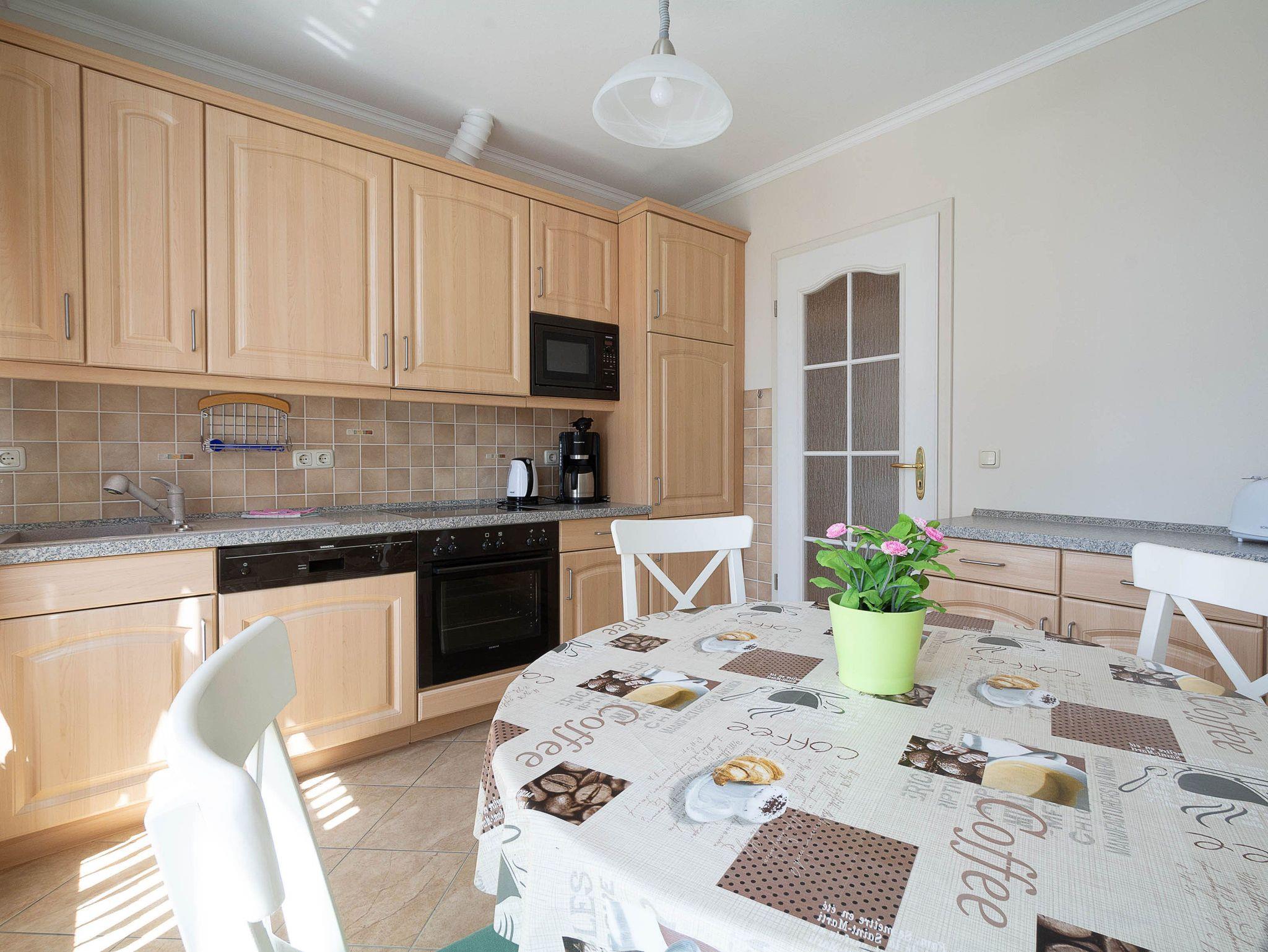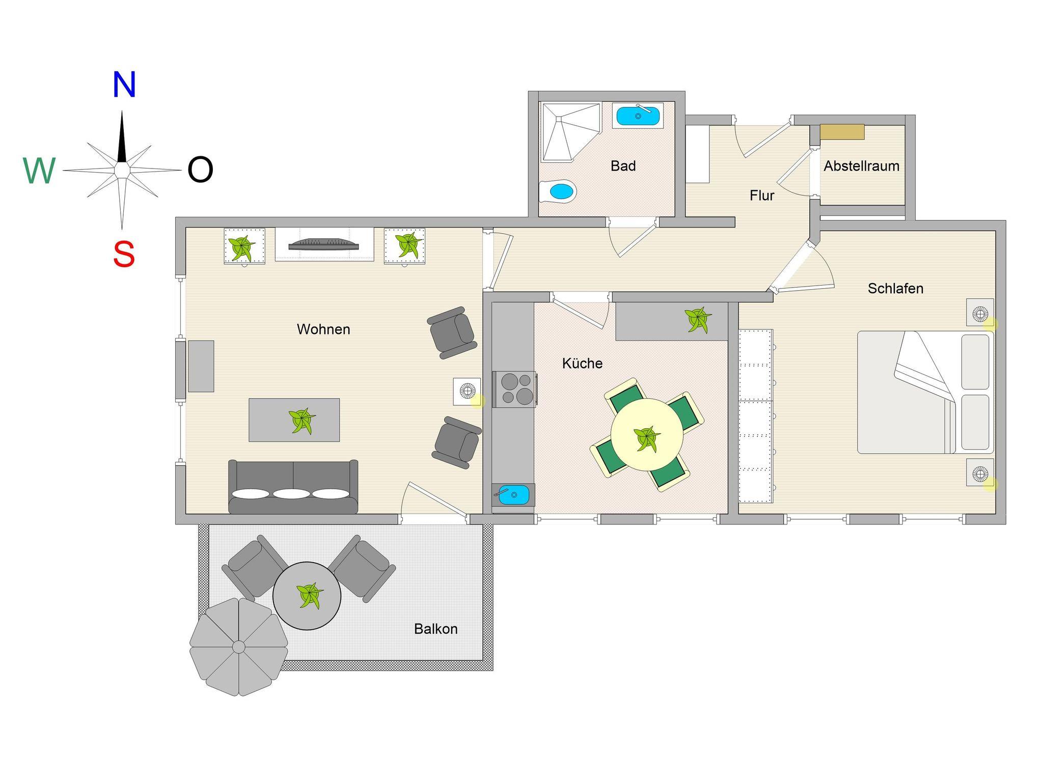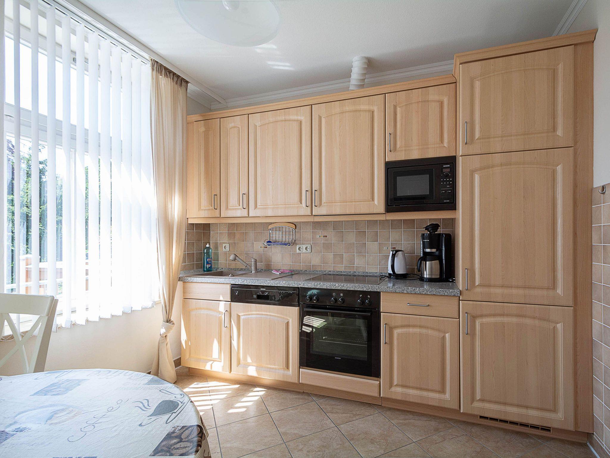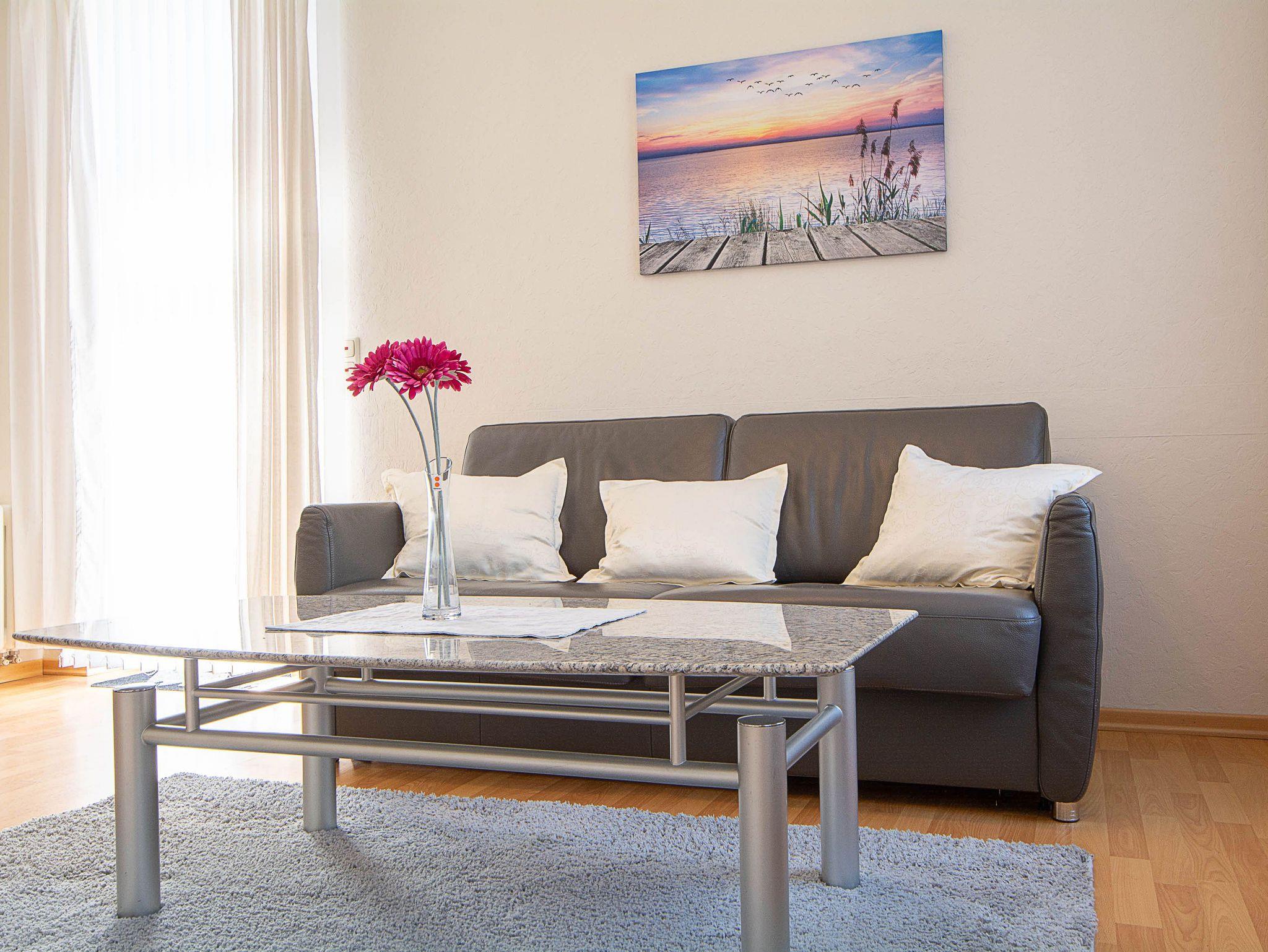 Sie wohnen in einer 59 m² grossen 2-Raum-Ferienwohnung, die sich im 1. Obergeschoss der Villa Käthe befindet. Der großzügig gestaltete Wohnraum ist ausgestattet mit einer bequemen Couch und 2 Sesseln sowie einem Flachbild-Fernseher. Von hier betreten Sie den nach Süden ausgerichtetn Balkon, der zum Verweilen einlädt. Die Wohnung verfügt über eine separate Küche und ist ausgestattet mit einer Spülmaschine, Ceranfeld mit Backofen, Mikrowelle, Kühl- und Gefrierkombi und einem Esstisch mit 4 Stühlen. Das großzügige Schlafzimmer mit Doppelbett und Kleiderschrank sowie das Bad mit Dusche und WC vervollständigen das Gesamtbild dieser liebevoll eingerichteten Wohnung.