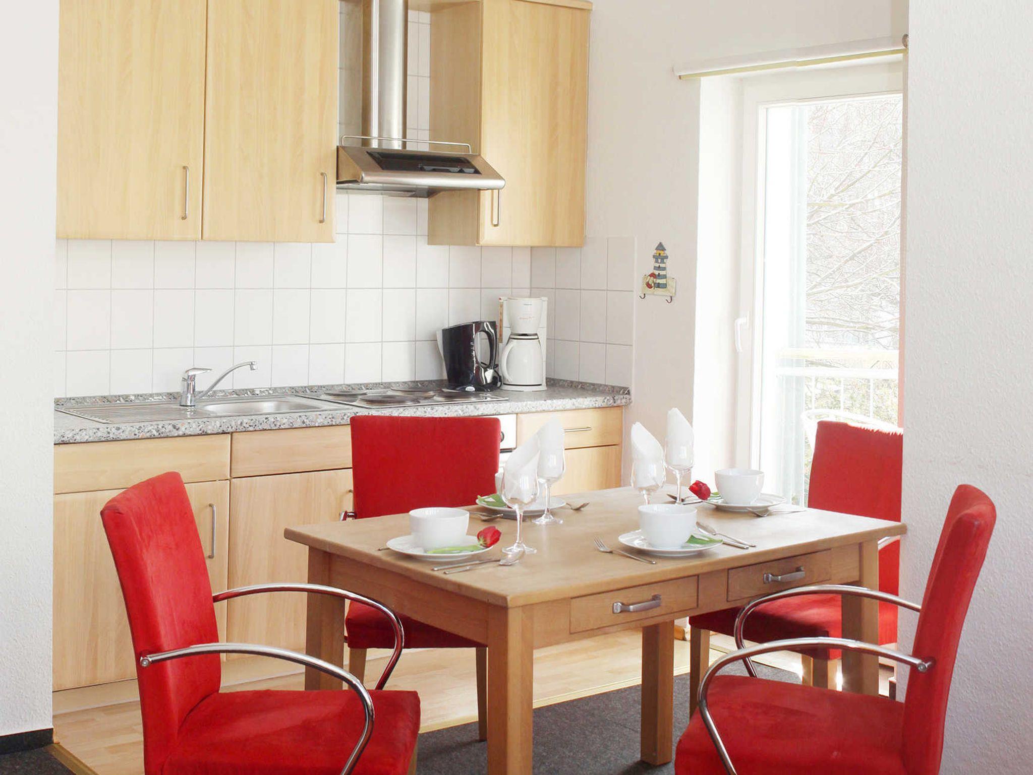 Vom Entree mit Garderobe und Zugang zum schönen Bad, betreten Sie den Wohn- und Essraum mit Küchenbereich, ausgestattet mit Kühlschrank, Backofen, Spülmaschine, Vierplattenherd, Kaffeemaschine, Toaster, Wasserkocher und ausreichend Geschirr, so dass Sie auch im Urlaub, wenn Sie viel Zeit und Lust haben, ab und zu selbst kochen können.