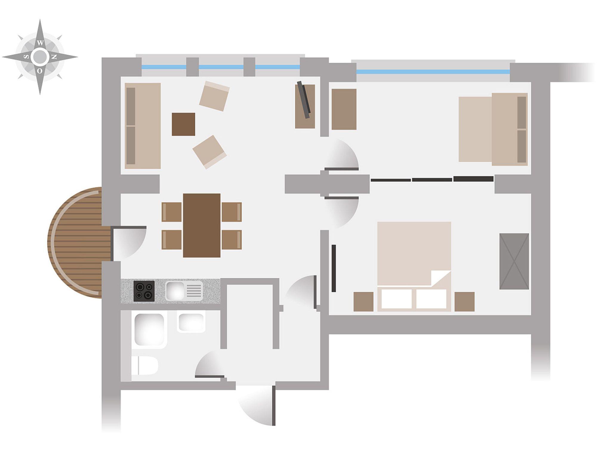 Wohnraum mit Küchenzeile und Esstisch, ein Schlafzimmer mit Doppelbett, ein Schlafzimmer mit zusammenschiebbarem Doppelbett, Flur mit Garderobe, Bad, Südbalkon, Tiefgaragenstellplatz 6 € pro Tag.