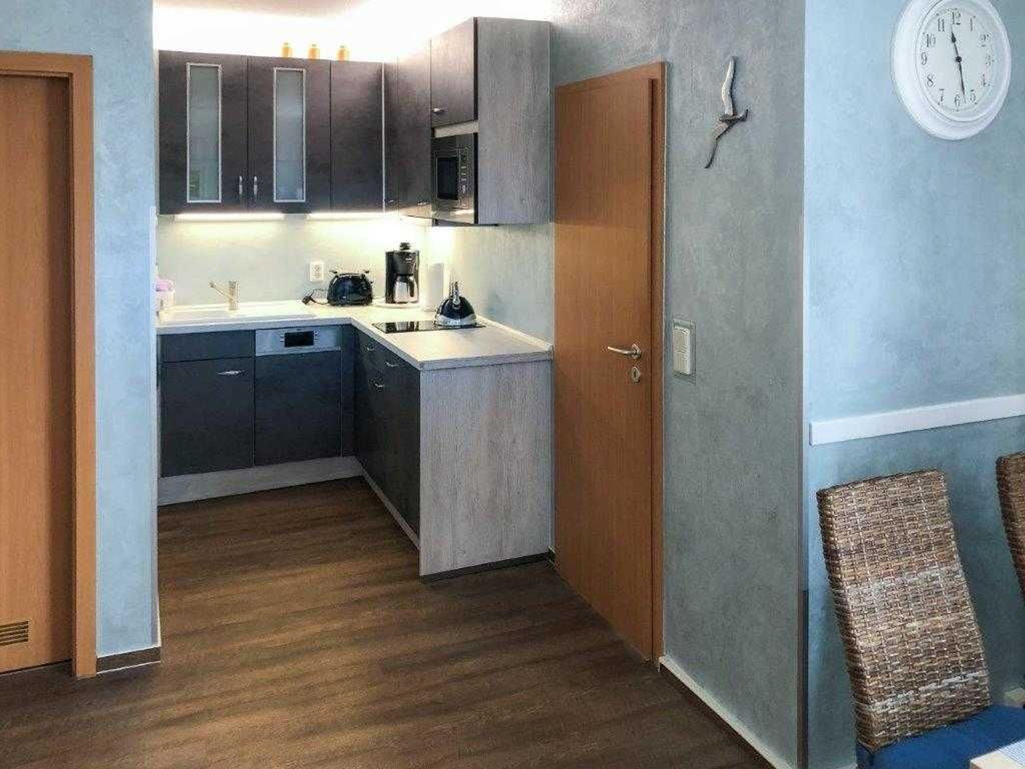 - Winkelküche mit Induktionskochfeld, Geschirrspüler, Kühlschrank, Kaffeemaschine, Toaster und Mikrowelle