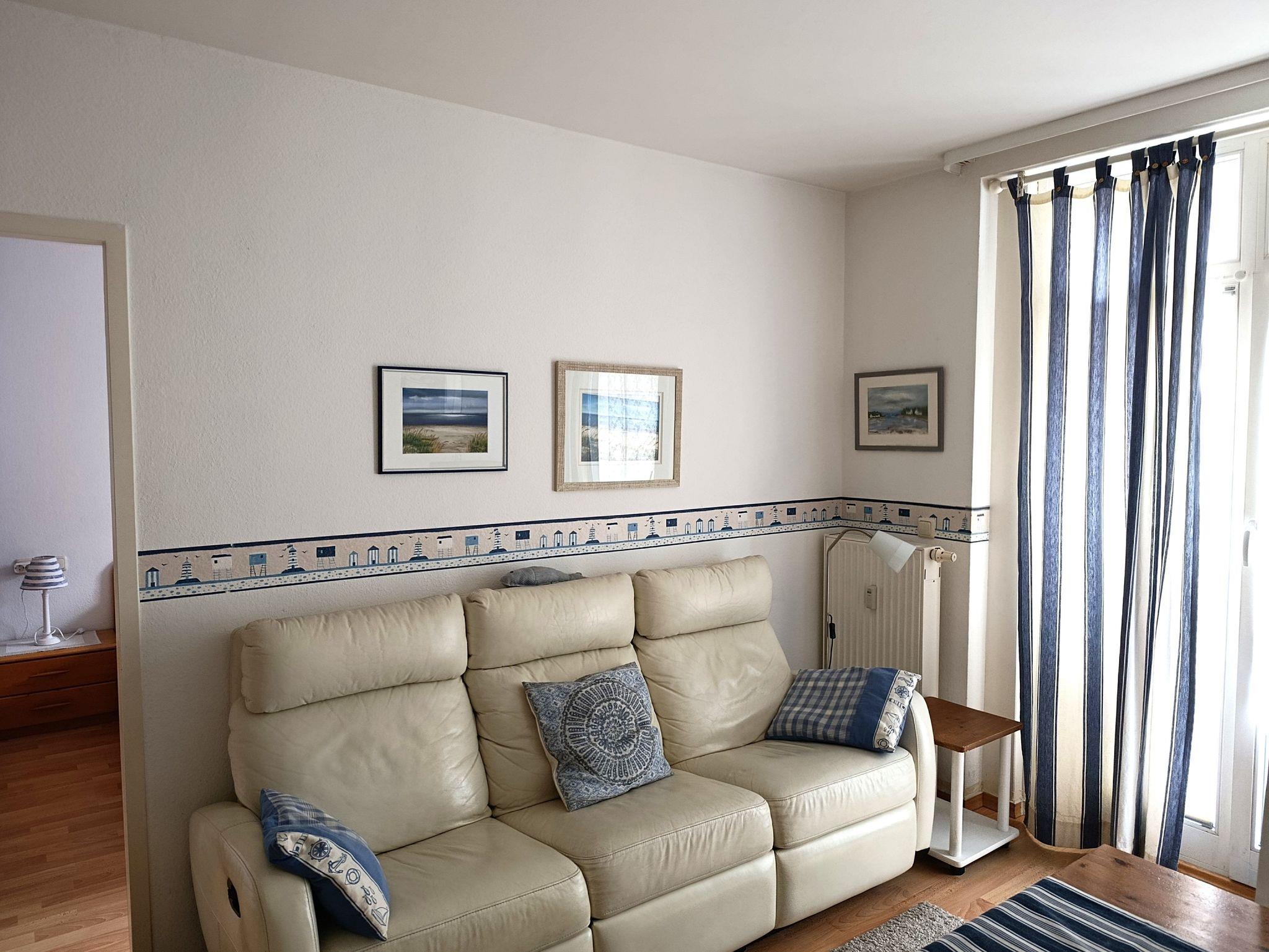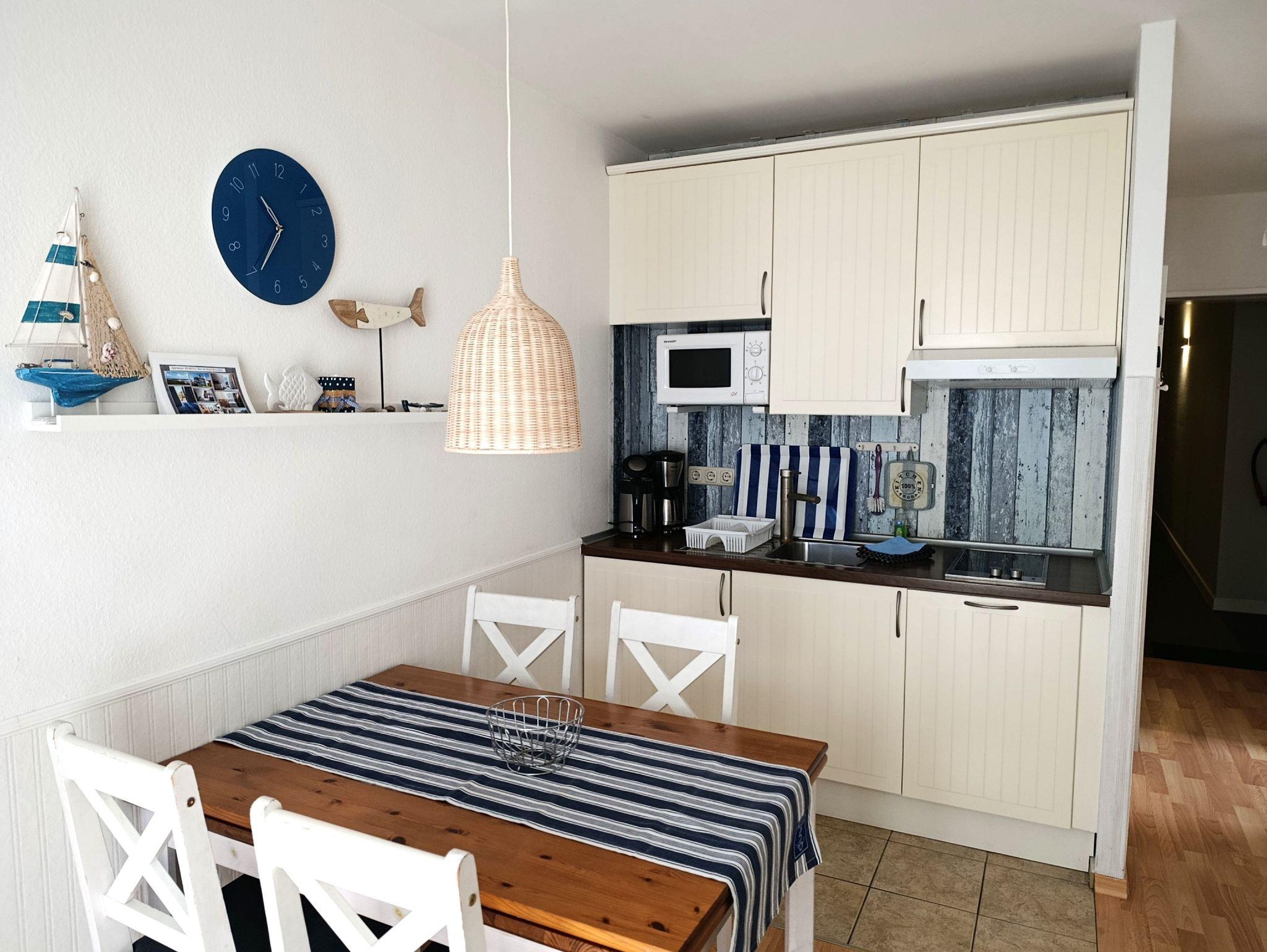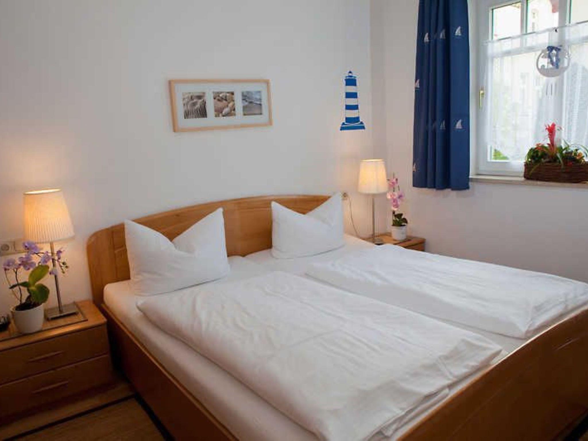 Nur 150 m vom Strand wohnen Sie in einer 3-Raum-Ferienwohnung. Die 34 qm große Wohnung liegt im Erdgeschoss. Das Wohnzimmer ist mit einer Couch, Couchtisch, Anrichte, mit Kabel-TV (Flachbildschirm), Essbereich (Tisch und Stühle) und Küchenzeile ausgestattet. Die Terrasse mit Tisch und Stühle geht zur Südseite. Im Schlafzimmer stehen ein Doppelbett, Nachtschränke und ein Kleiderschrank. Im Gästezimmer stehen ein Bett und ein kleiner Kleiderschrank. Die Küchenzeile wurde ausgestattet mit Mikrowelle, Kühlschrank, Kaffeemaschine, Zwei-Platten- Ceran Kochfeld, Toaster und Wasserkocher. Das Bad mit Dusche und WC komplettiert die Wohnung.
