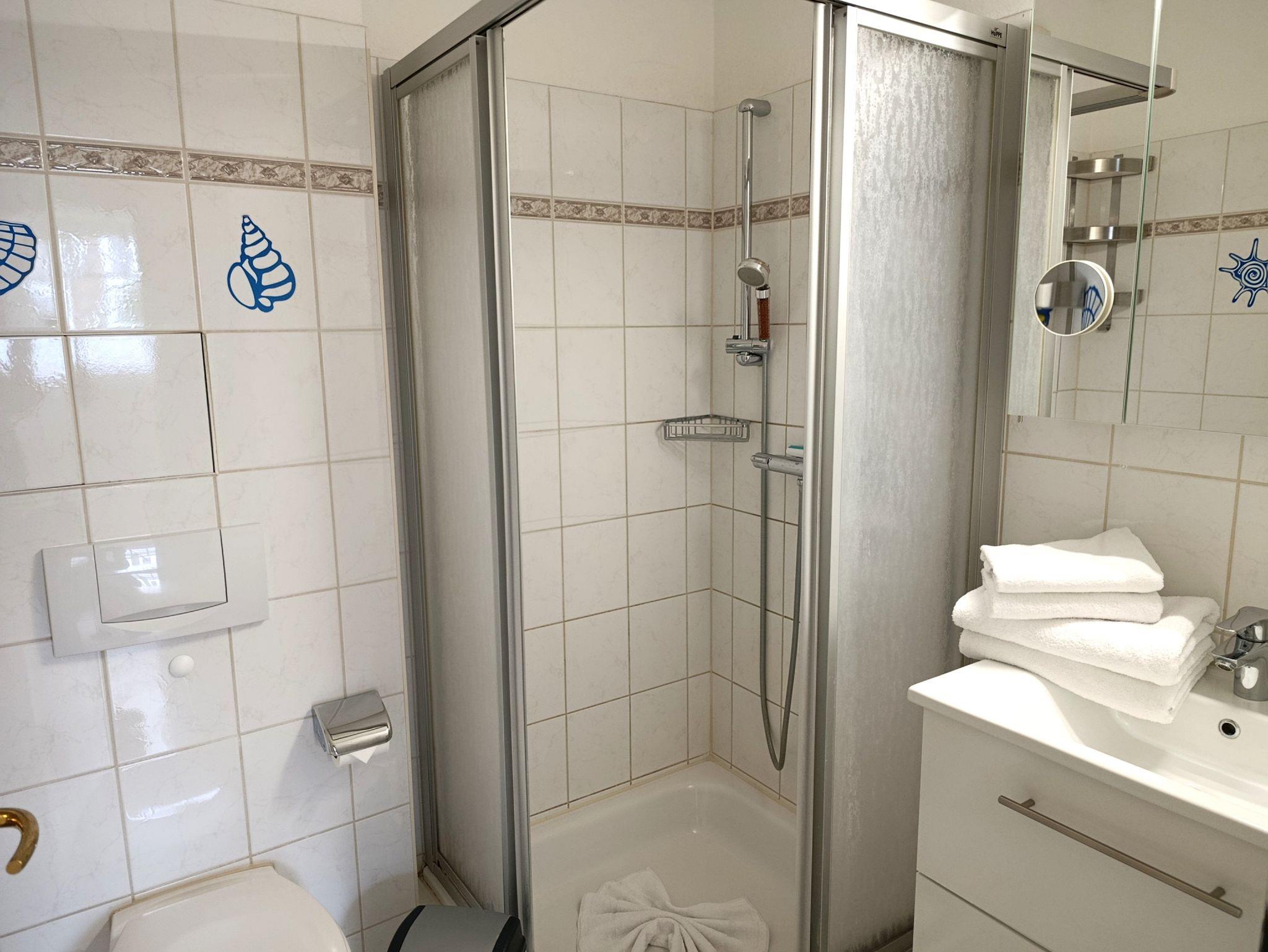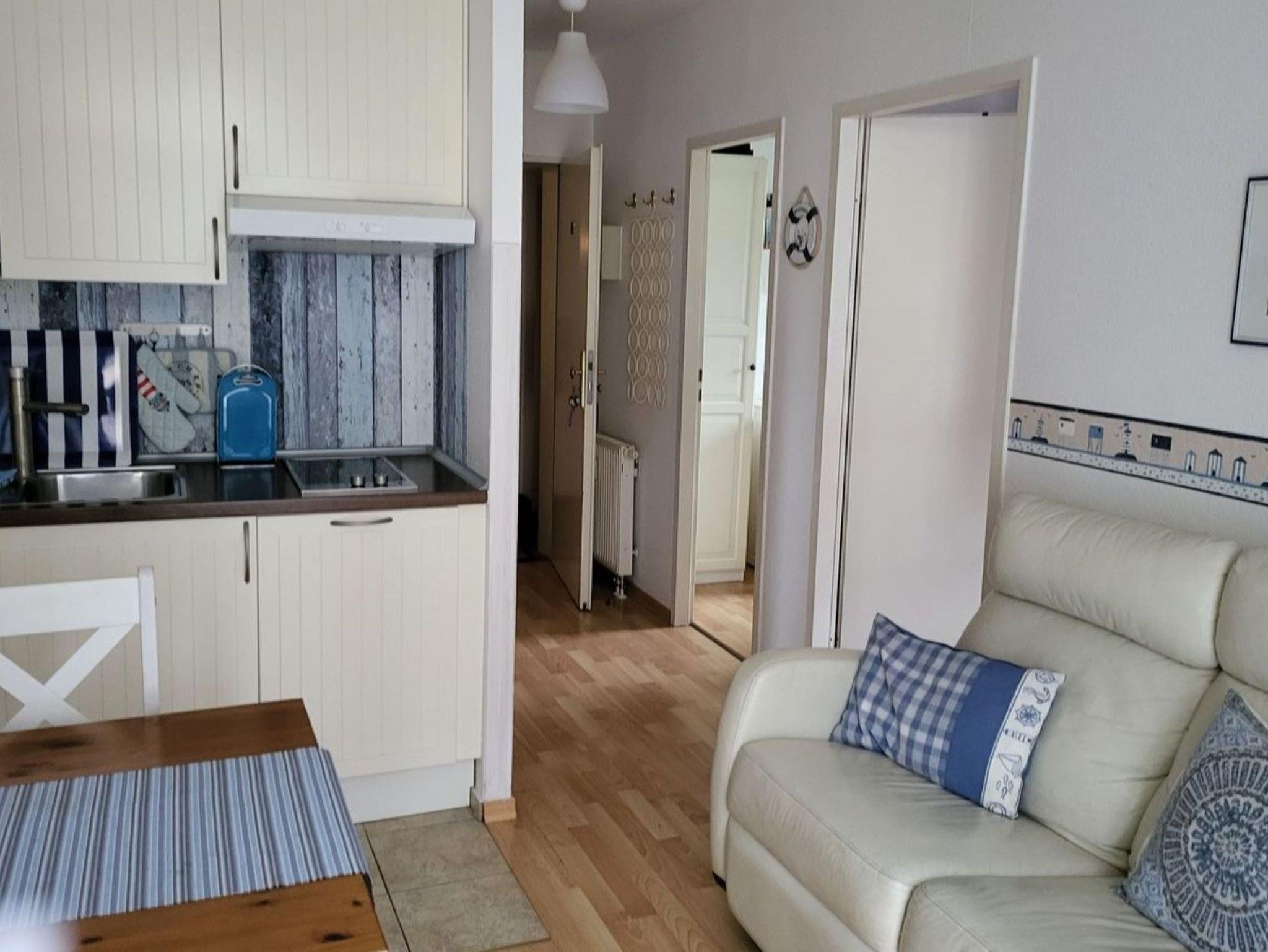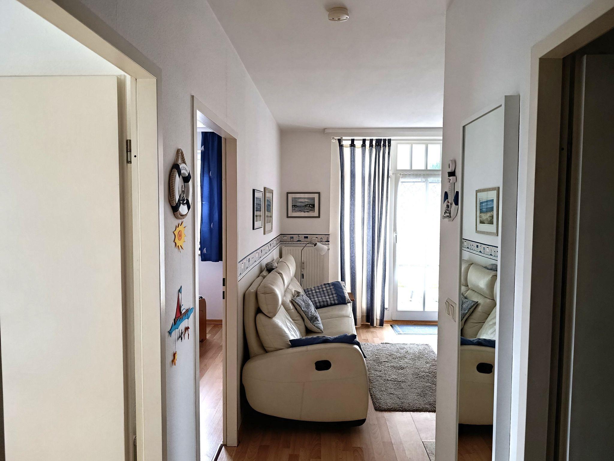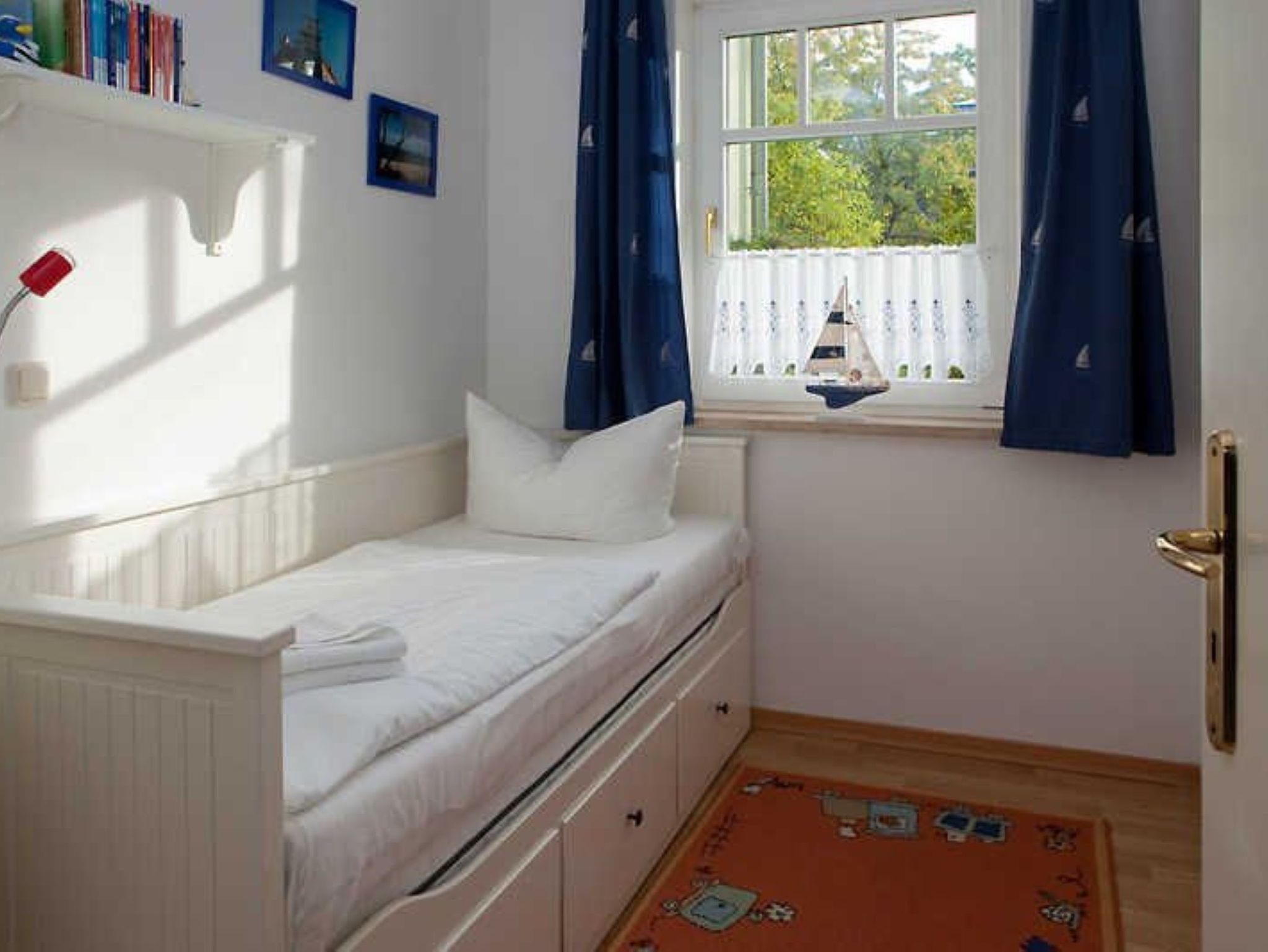 Nur 150 m vom Strand wohnen Sie in einer 3-Raum-Ferienwohnung. Die 34 qm große Wohnung liegt im Erdgeschoss. Das Wohnzimmer ist mit einer Couch, Couchtisch, Anrichte, mit Kabel-TV (Flachbildschirm), Essbereich (Tisch und Stühle) und Küchenzeile ausgestattet. Die Terrasse mit Tisch und Stühle geht zur Südseite. Im Schlafzimmer stehen ein Doppelbett, Nachtschränke und ein Kleiderschrank. Im Gästezimmer stehen ein Bett und ein kleiner Kleiderschrank. Die Küchenzeile wurde ausgestattet mit Mikrowelle, Kühlschrank, Kaffeemaschine, Zwei-Platten- Ceran Kochfeld, Toaster und Wasserkocher. Das Bad mit Dusche und WC komplettiert die Wohnung.