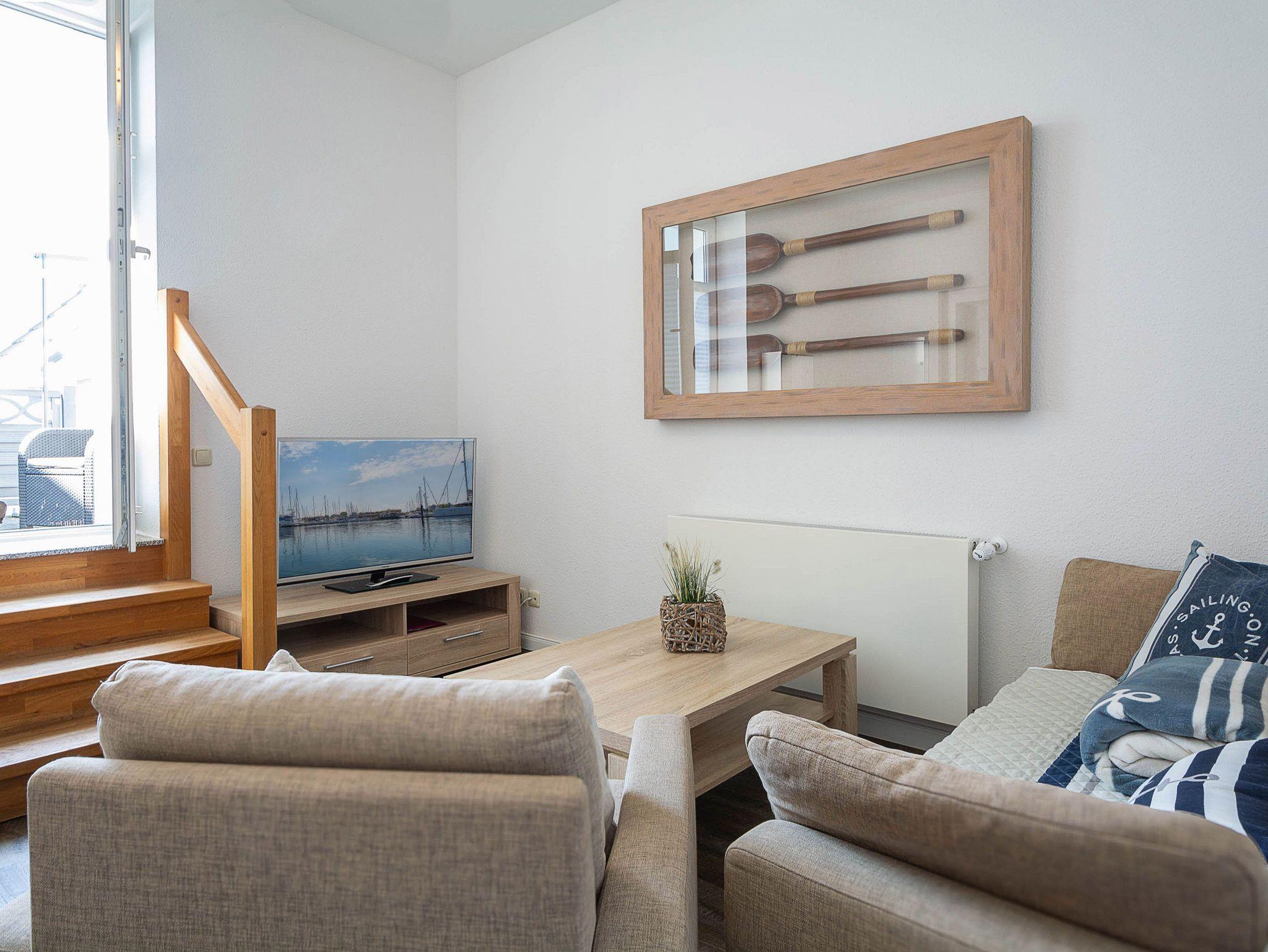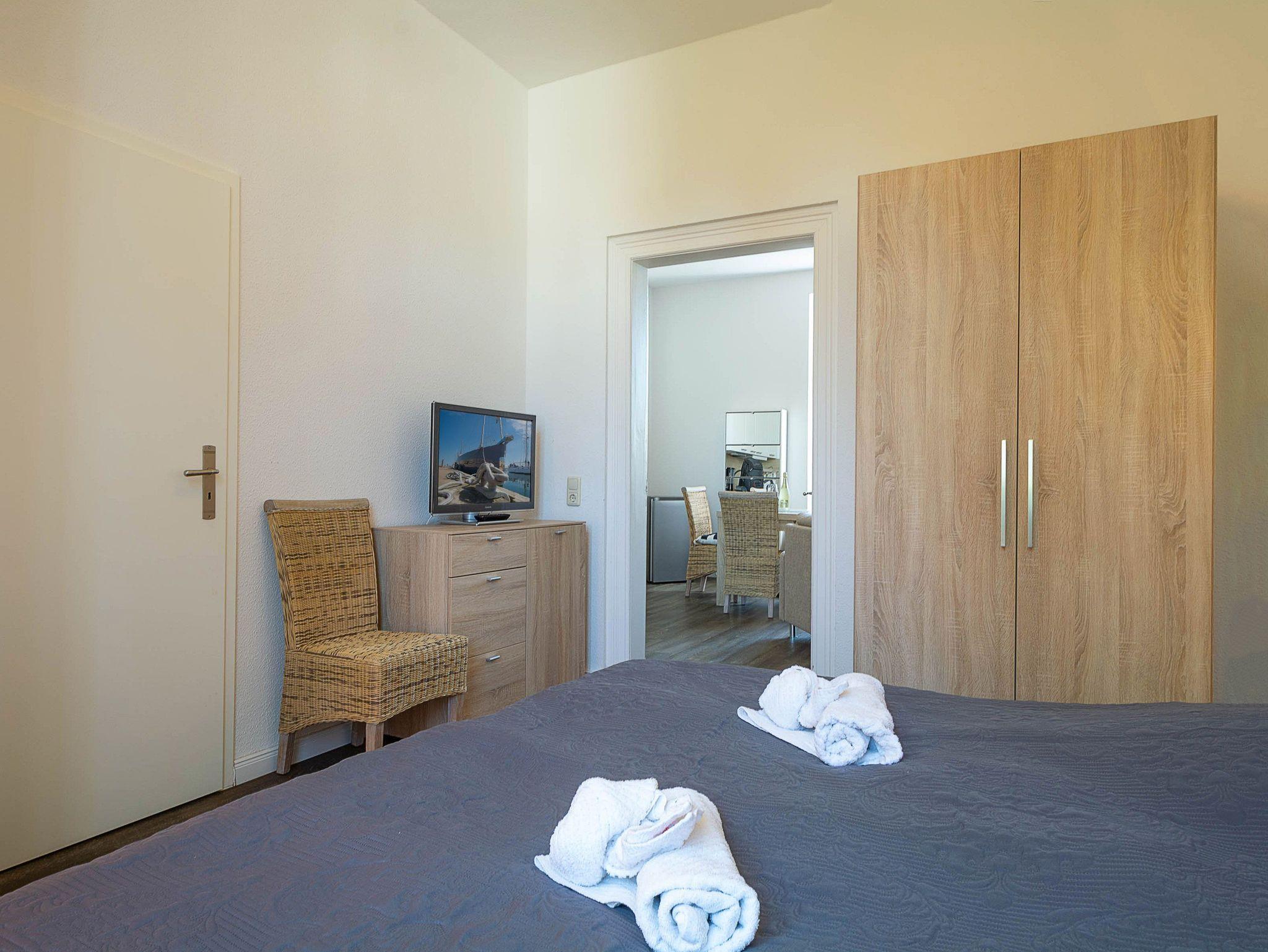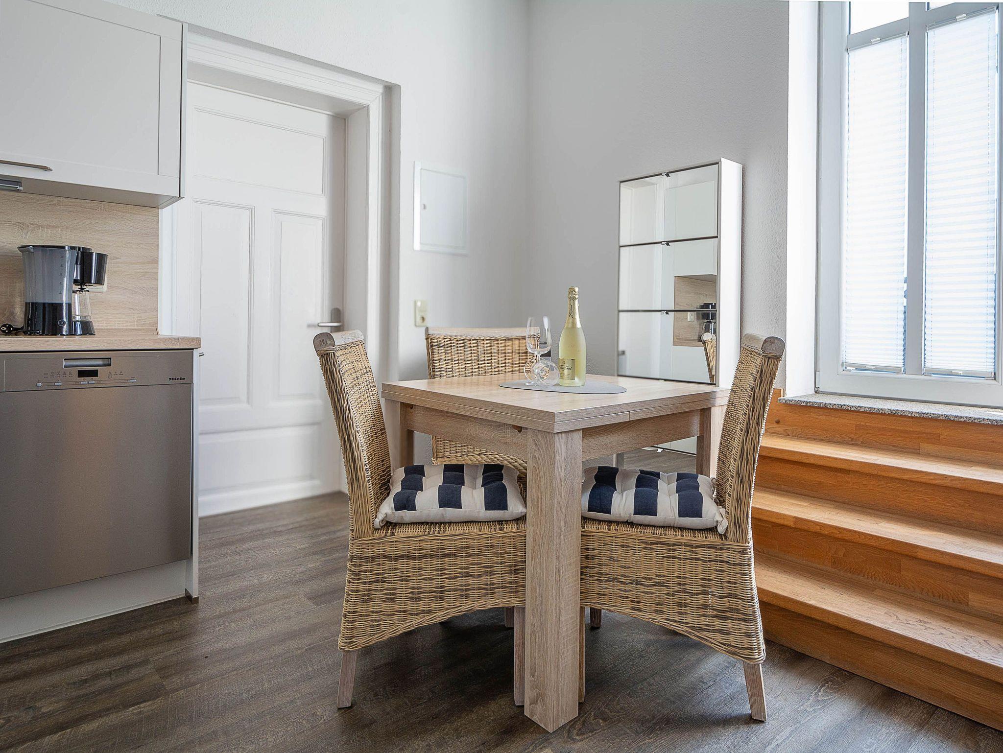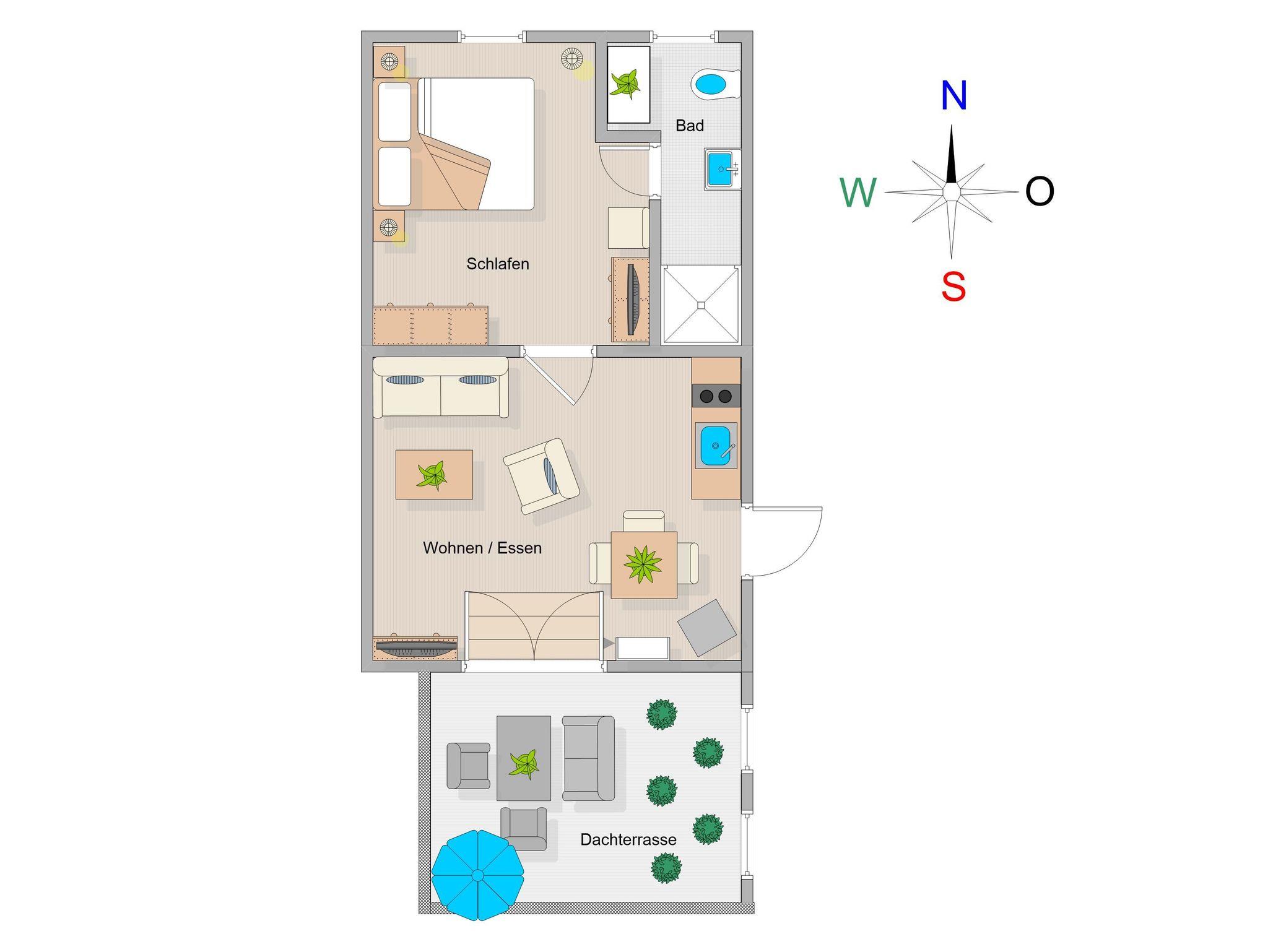 Sie wohnen in einer modern eingerichteten 2-Raum-Ferienwohnung von ca. 40 m² Größe, die sich im ersten Obergeschoss befindet. Der Wohnraum ist ausgestattet mit Schlafcouch, TV, Essplatz und Küchenzeile (2-Platten-Cerankochfeld, Kühlschrank mit Gefrierfach, Geschirrspüler, Kaffeemaschine, Toaster). Von hier betreten Sie über ein kleines Treppchen die große Dachterrasse, die nach Süden ausgerichtet ist und zum Sonnenbaden und Relaxen einlädt. Der Schlafraum mit Doppelbett sowie das Tageslichtbad mit Dusche und WC vervollständigen das Gesamtbild dieser Wohnung.