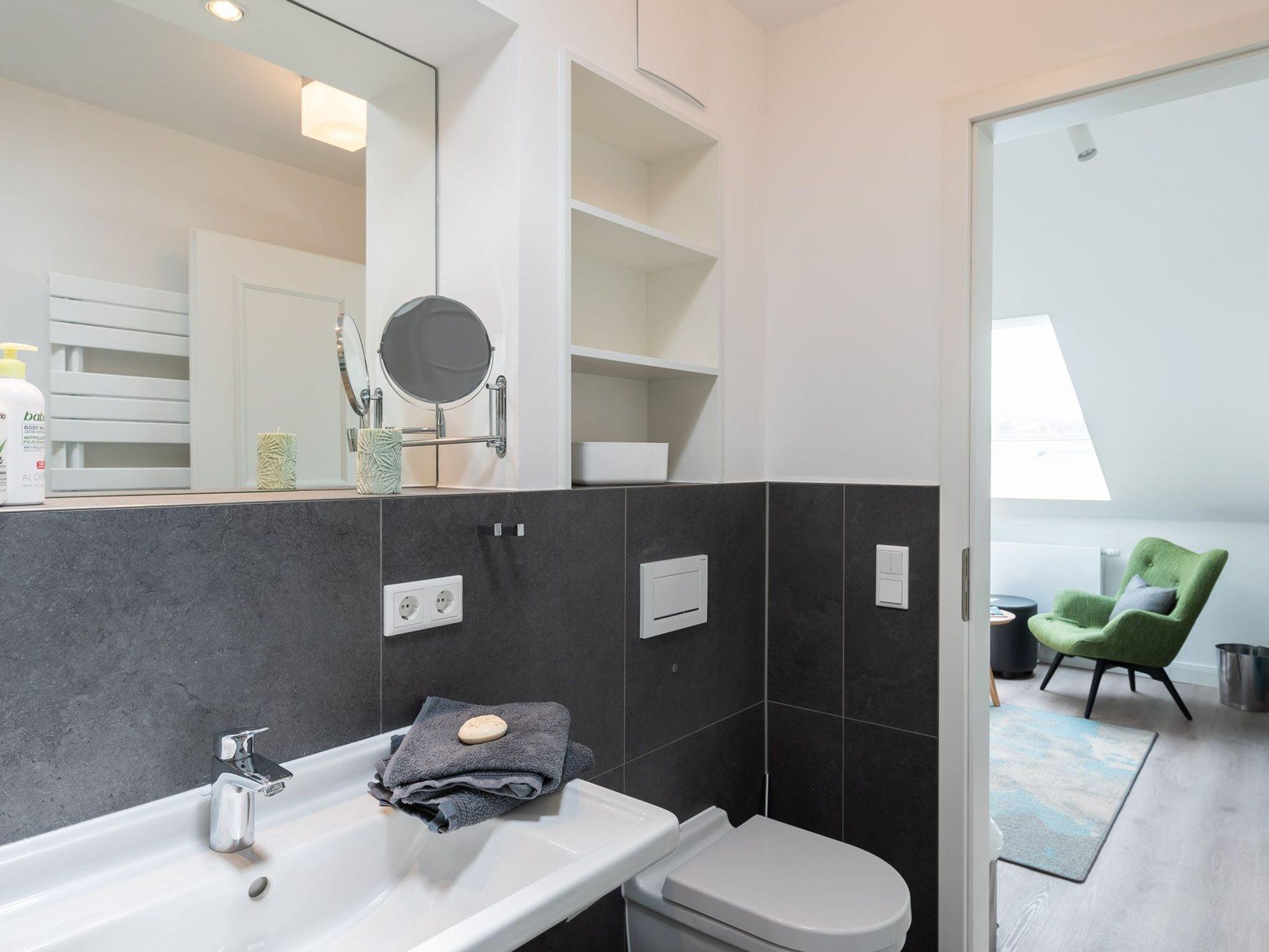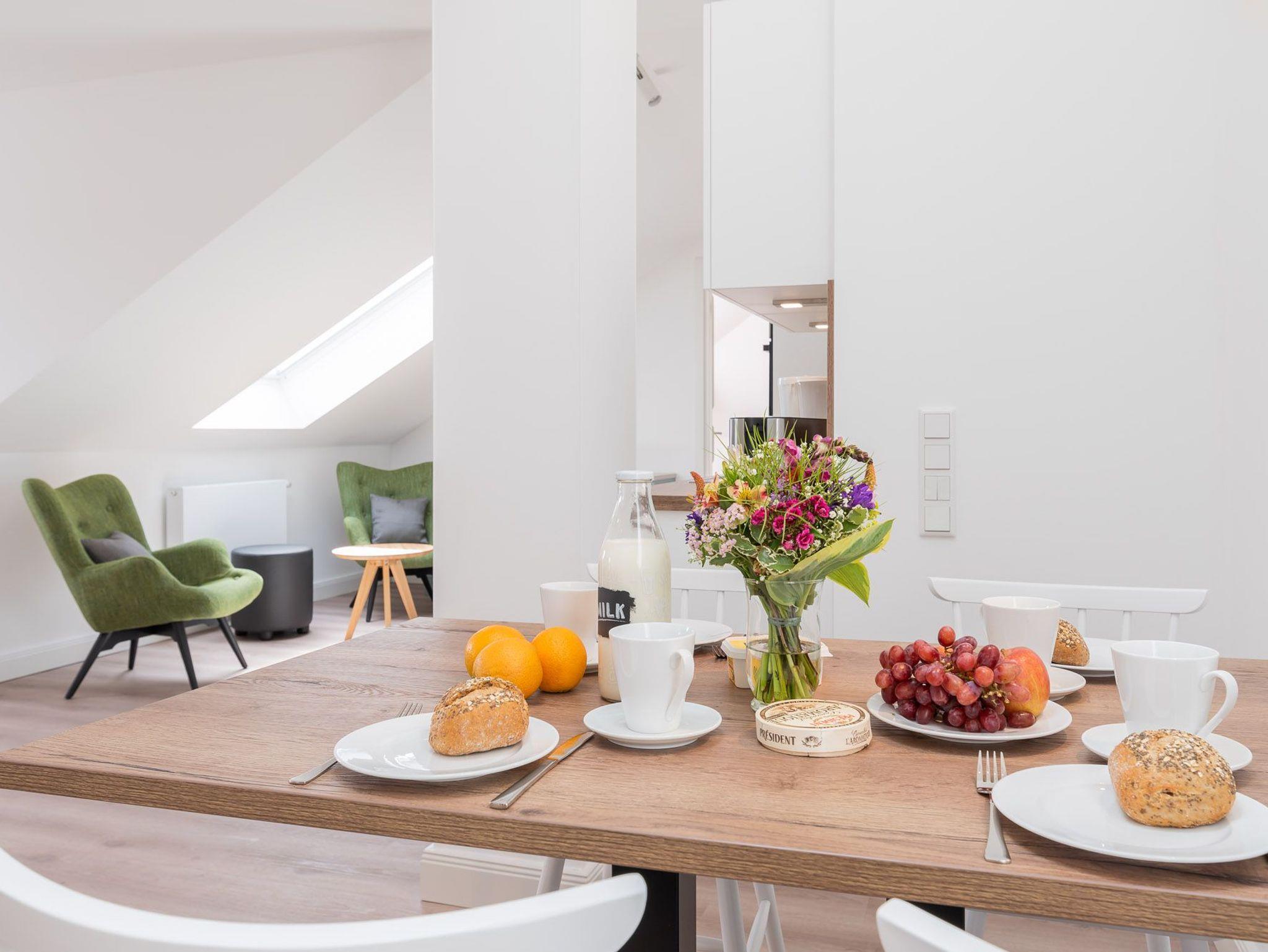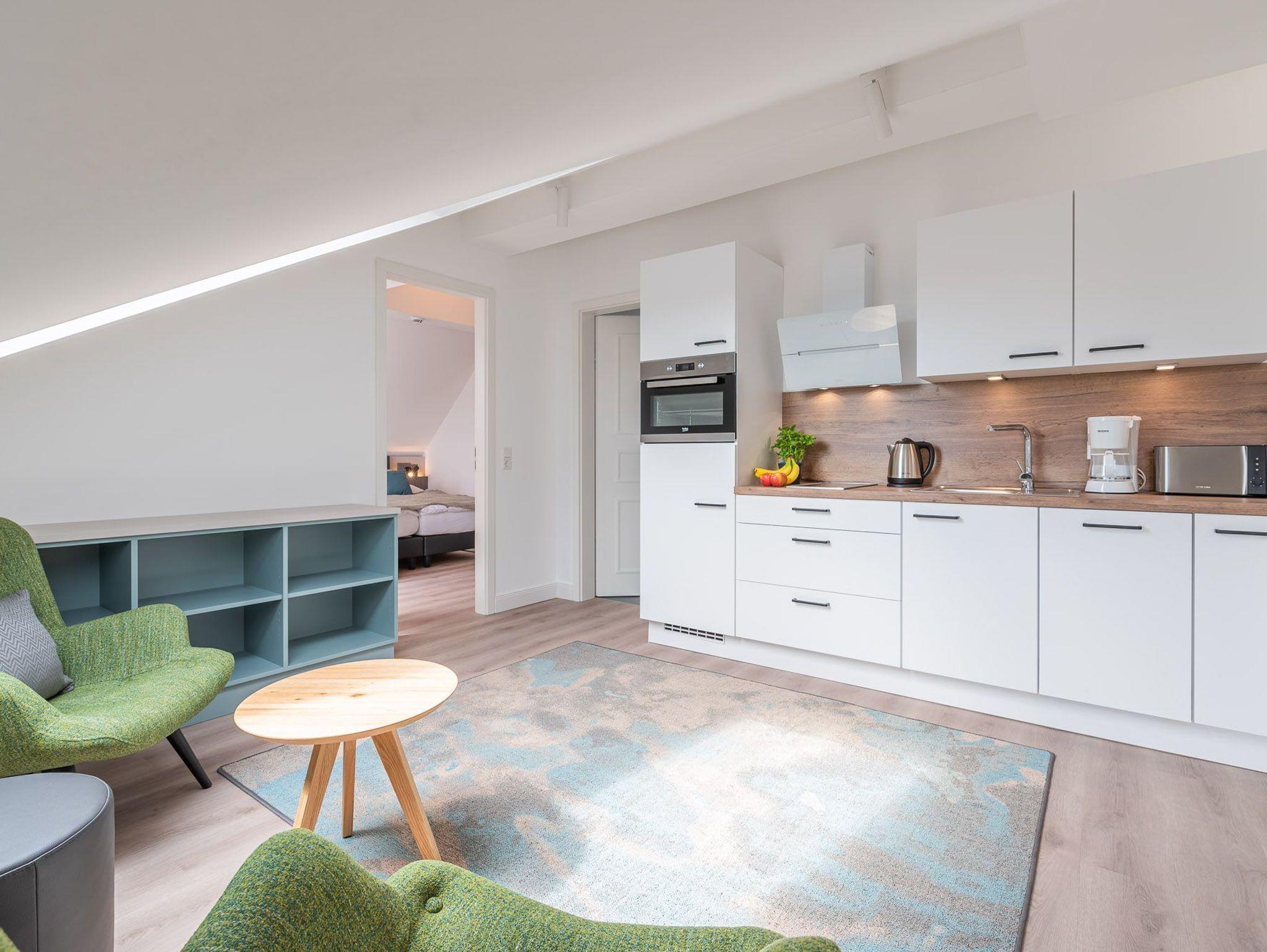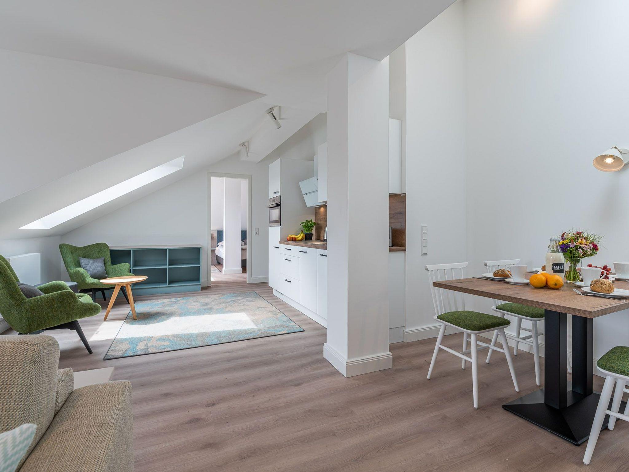 Das Bad verfügt über eine Dusche, einem Haartrockner und einem Handtuchtrockner. Zu Ihrem Apartment gehört ebenfalls ein großer und lichtdurchfluteter Wohn- und Essbereich mit offener Küche.