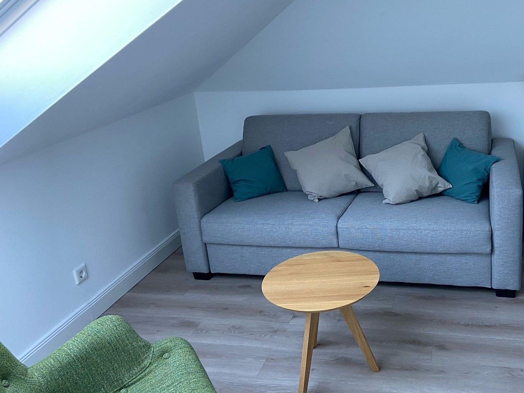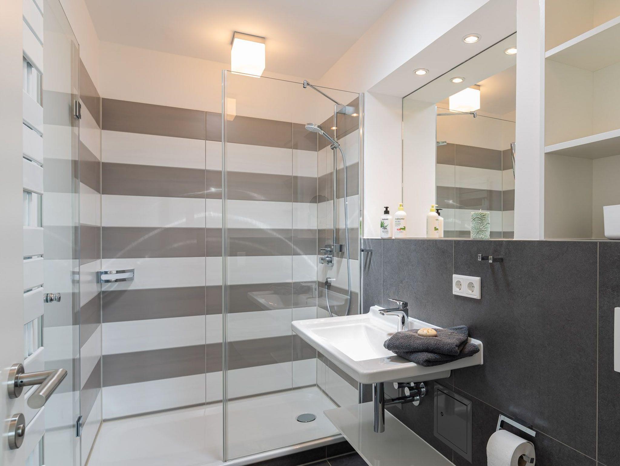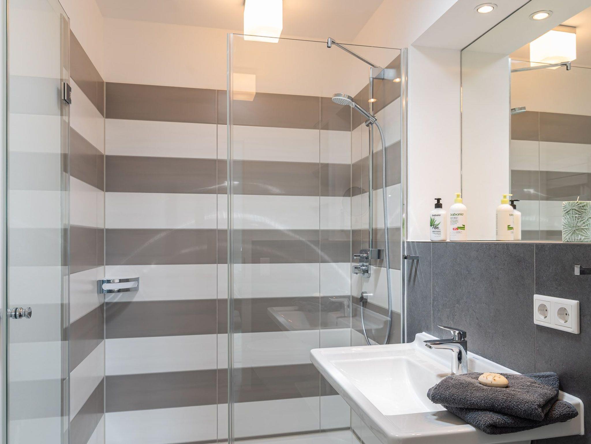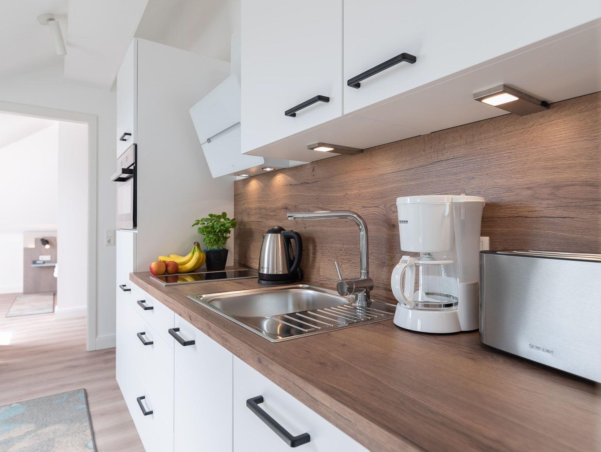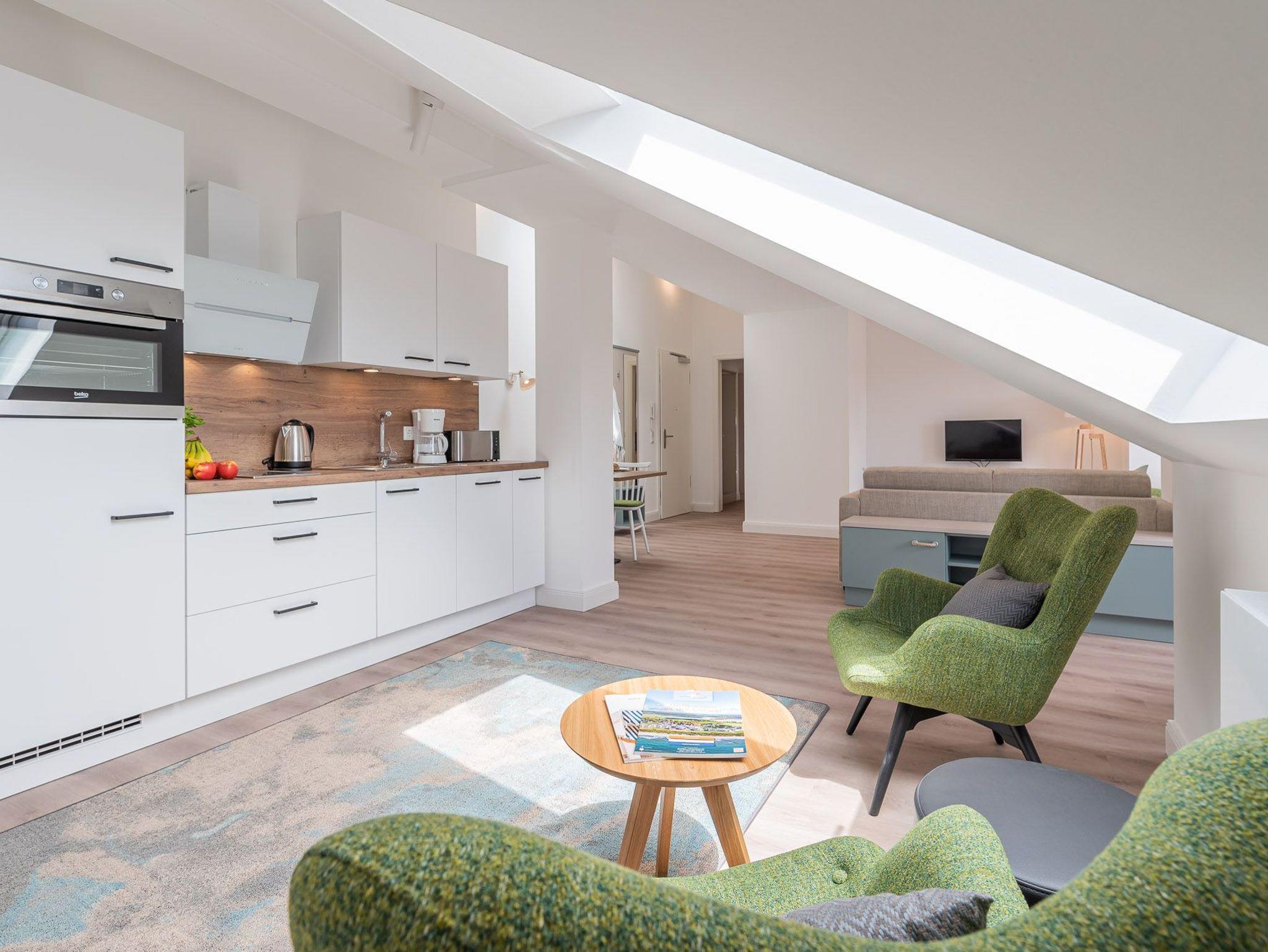 Das Bad verfügt über eine Dusche, einem Haartrockner und einem Handtuchtrockner. Zu Ihrem Apartment gehört ebenfalls ein großer und lichtdurchfluteter Wohn- und Essbereich mit offener Küche.
