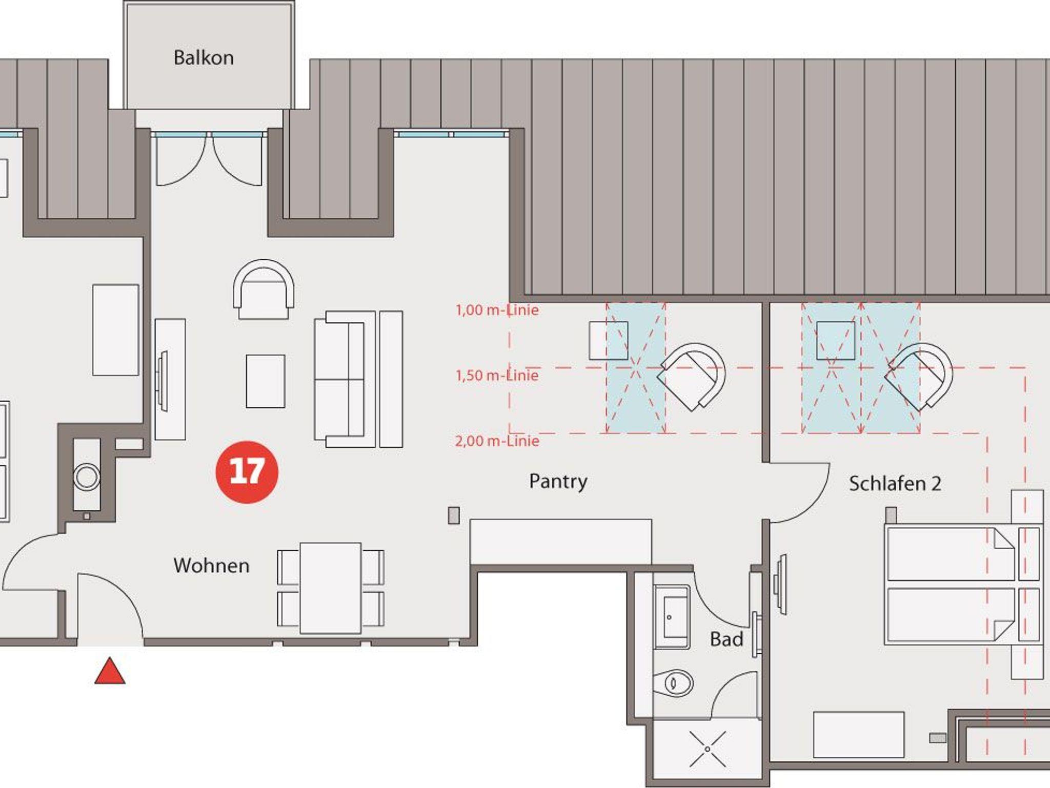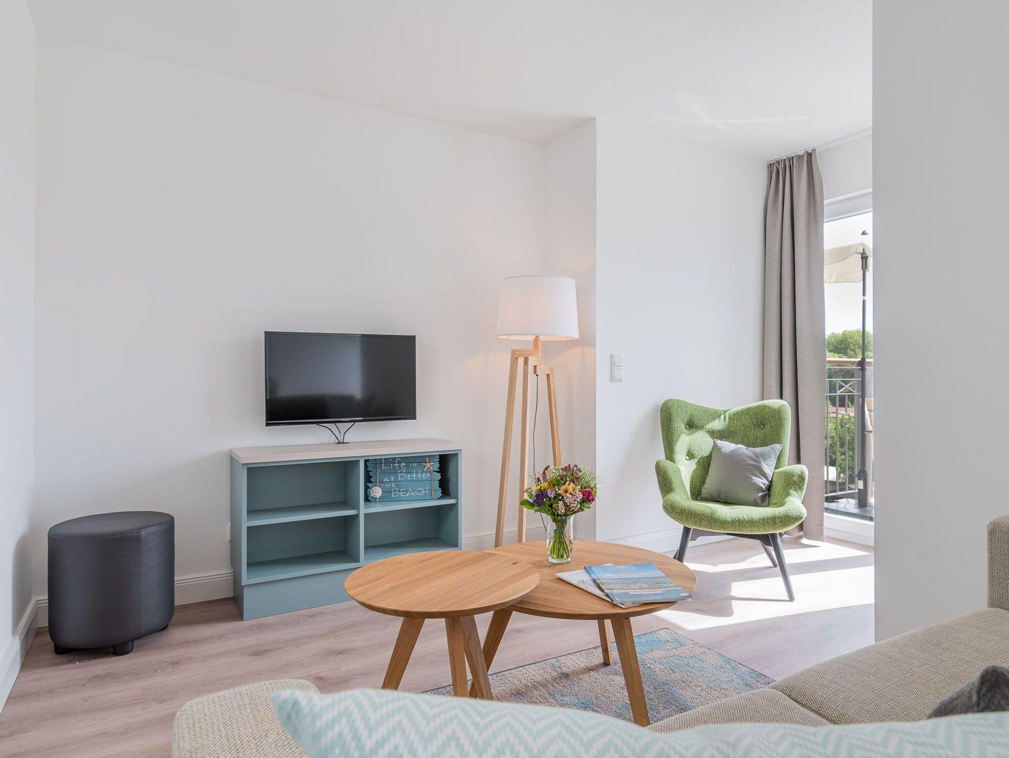 Das Apartment bietet mit seinen drei Zimmern genügend Platz für 6 Personen. Außerdem verfügt es neben seiner Wohnfläche von ca. 80 qm auch über einen Balkon. Dieser ist mit Balkonmöbeln und einem Sonnenschirm ausgestattet.