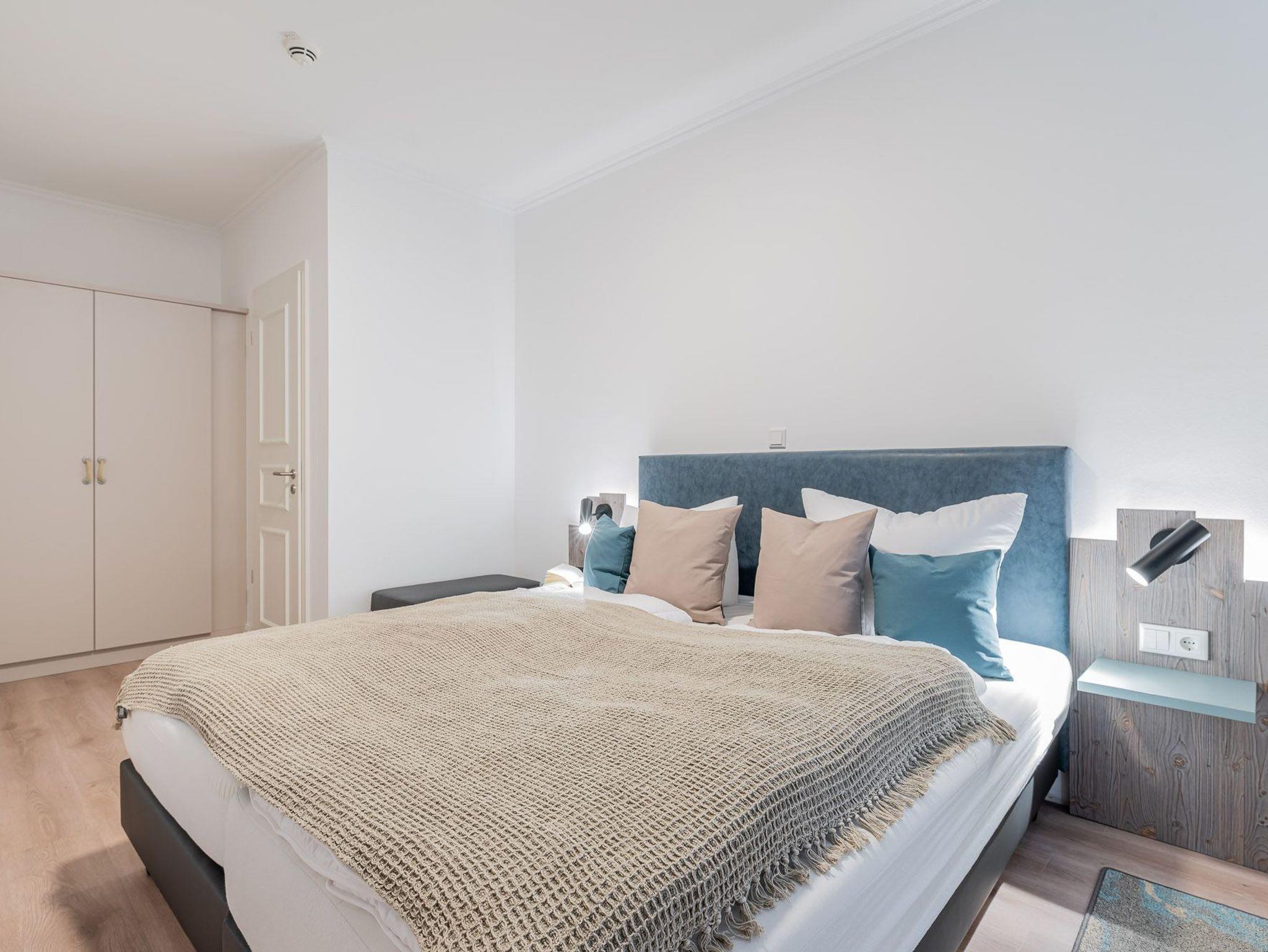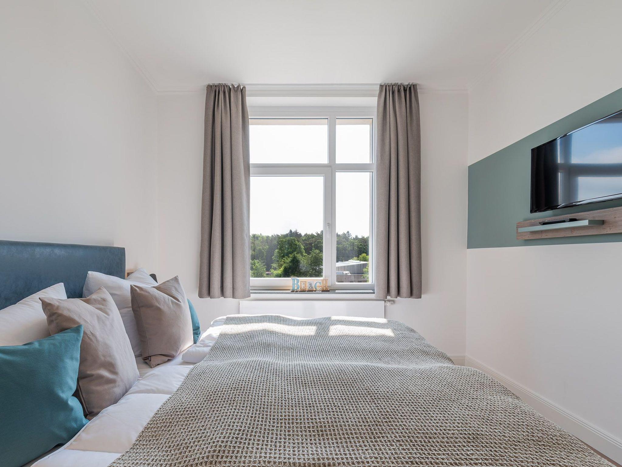 Das Schlafzimmer verfügt über ein 1,80 x 2,00 m Bett, sowie über einen Kleiderschrank und ein TV-Gerät. Die zweite Schlafmöglichkeit ist ein bequemes Schlafsofa mit einer Liegefläche von 1,29 x 1,98 m. Für unsere kleinen Gäste können ein Kinderreisebett und ein Kinderhochstuhl bereitgestellt werden (kostenpflichtig zu buchbar).