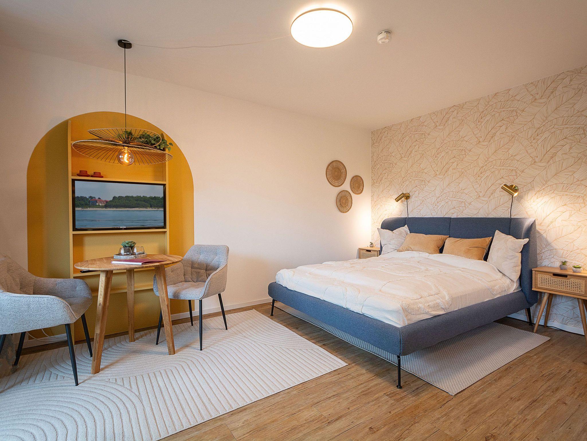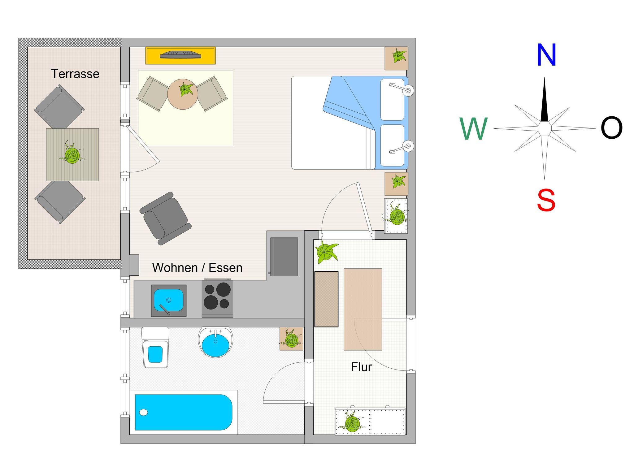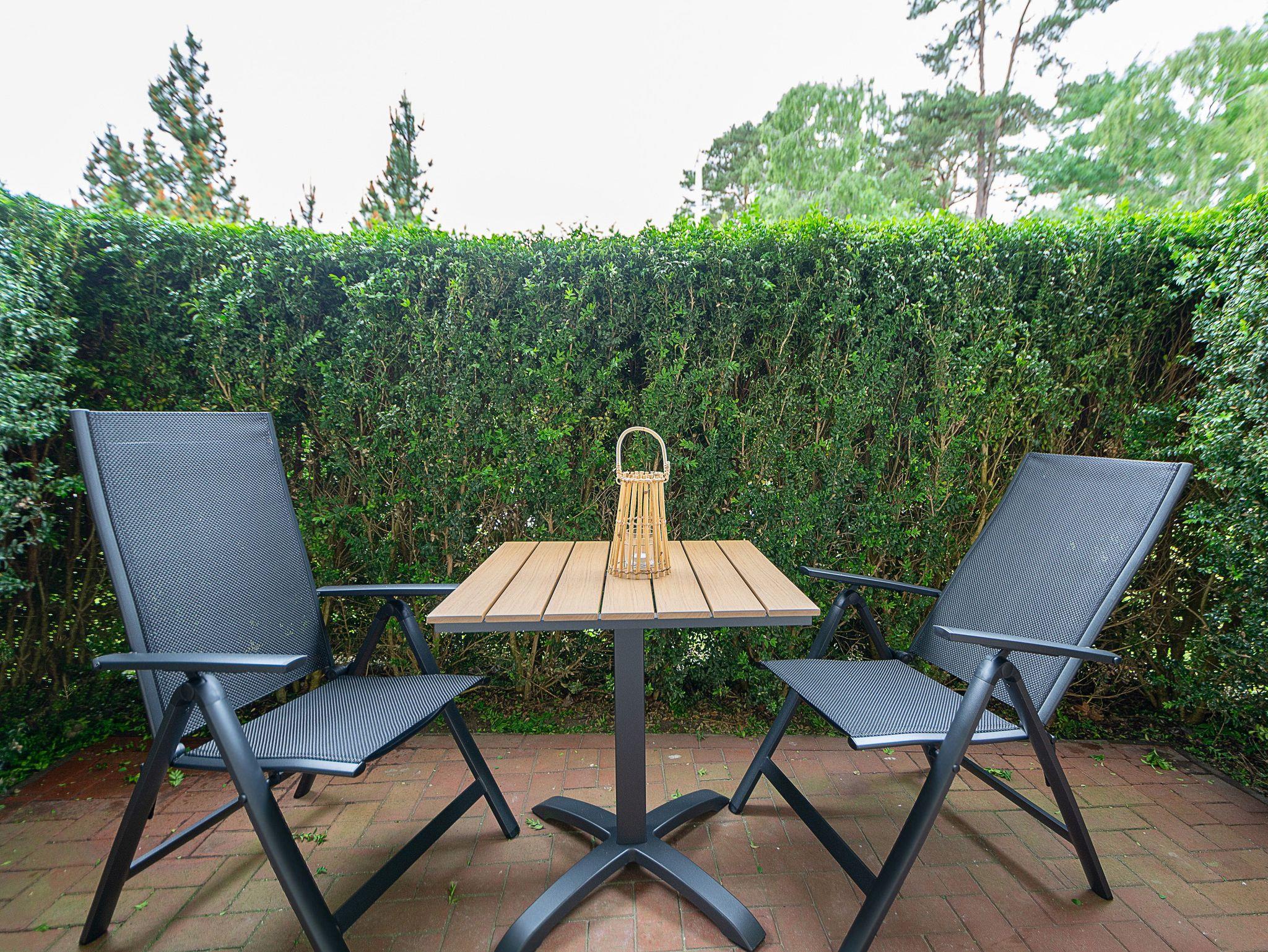 Sie wohnen in einer ca. 33 m² grossen 1-Raum-Ferienwohnung, die sich im Erdgeschoss der Residenz Dünengarten befindet. Die Wohnung wurde im Jahr 2024 komplett grundsaniert und besticht durch ihre moderne liebevolle Ausstattung. Es begrüßt Sie ein kombinierter Wohn- und Schlafbereich mit einem Doppelbett (180cm x 200cm), einem Kleiderschrank, einem kleinen Esstisch und einem Sessel sowie einem Flachbild-TV. Die moderne offene Küchenzeile hält für Sie alle wichtigen Küchengeräte bereit: Ein 2-Zonen-Ceranfeld, eine Mikrowelle mit Grillfunktion, ein Kühlschrank, eine Kaffeemaschine (mit eigenem Mahlwerk für ganze Bohnen!), Wasserkocher und Toaster sowie ausreichend Geschirr sind vorhanden. Vom Wohnbereich können Sie auch die möblierte West-Terrasse betreten, die zu langen Abenden zu einem Gläschen Wein einlädt. Das Bad mit Badewanne und WC vervollständigt das Gesamtbild dieser Wohnung.
