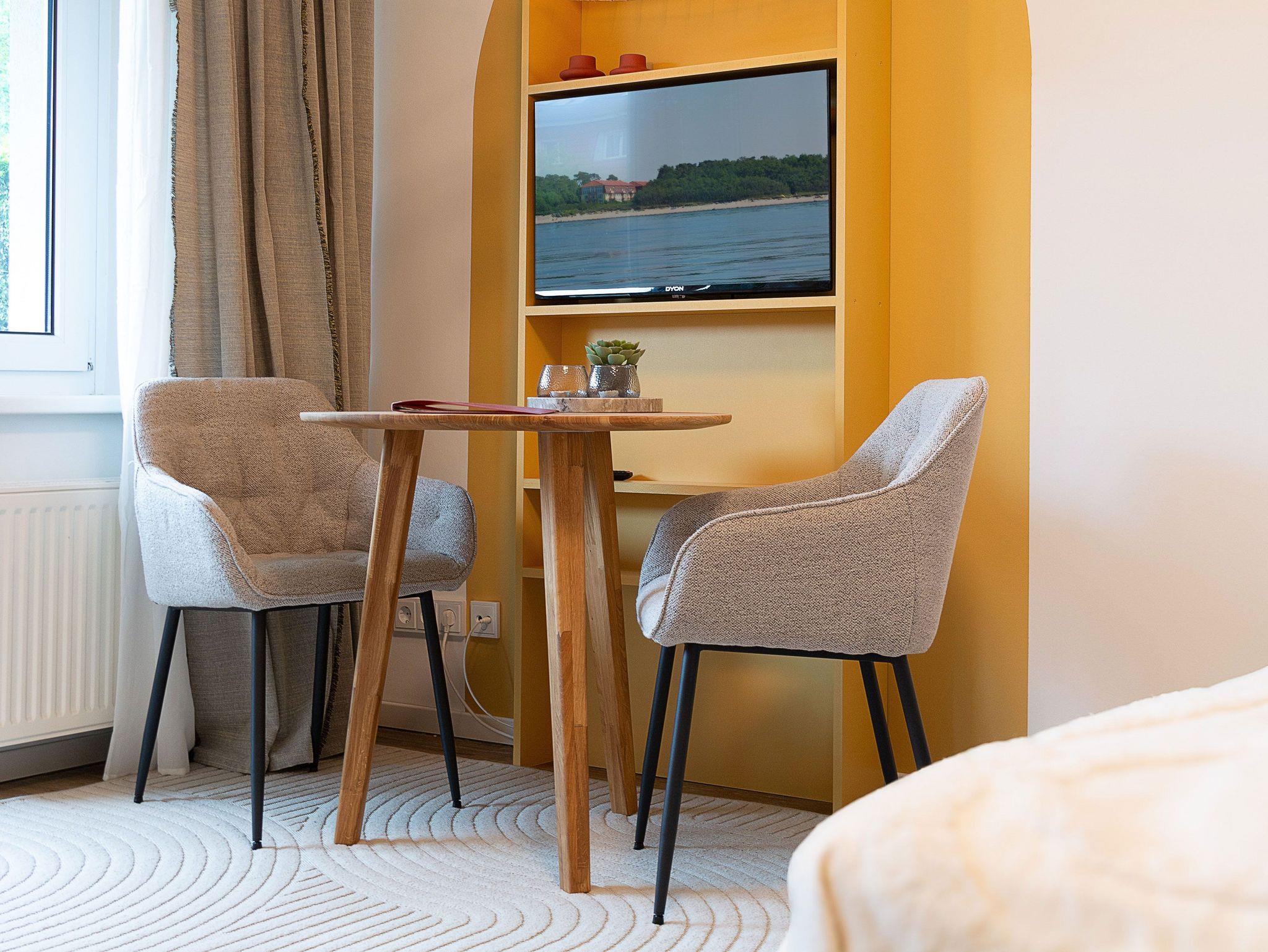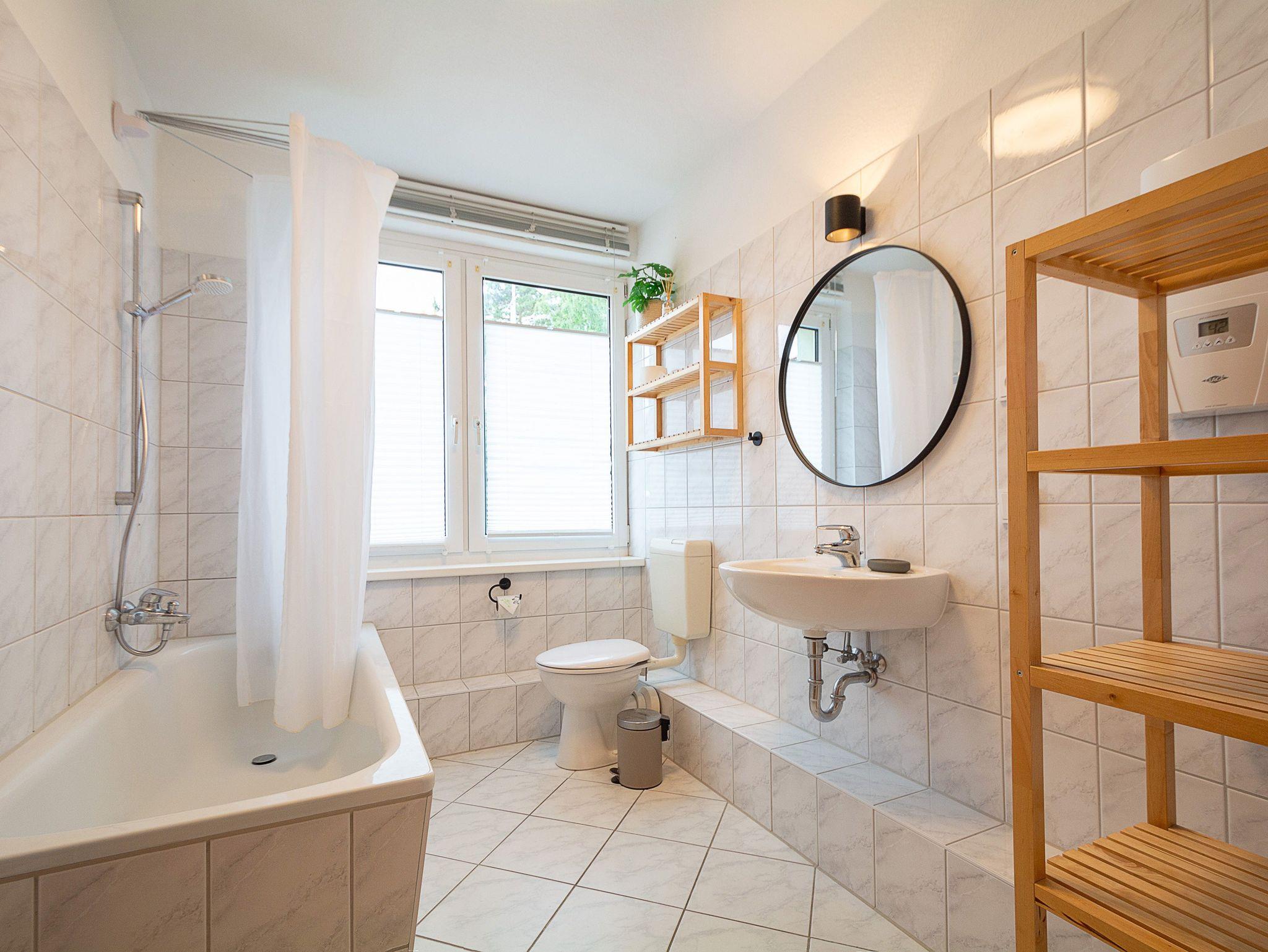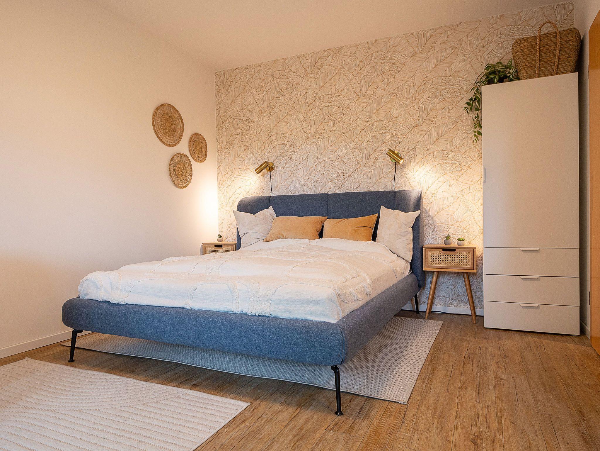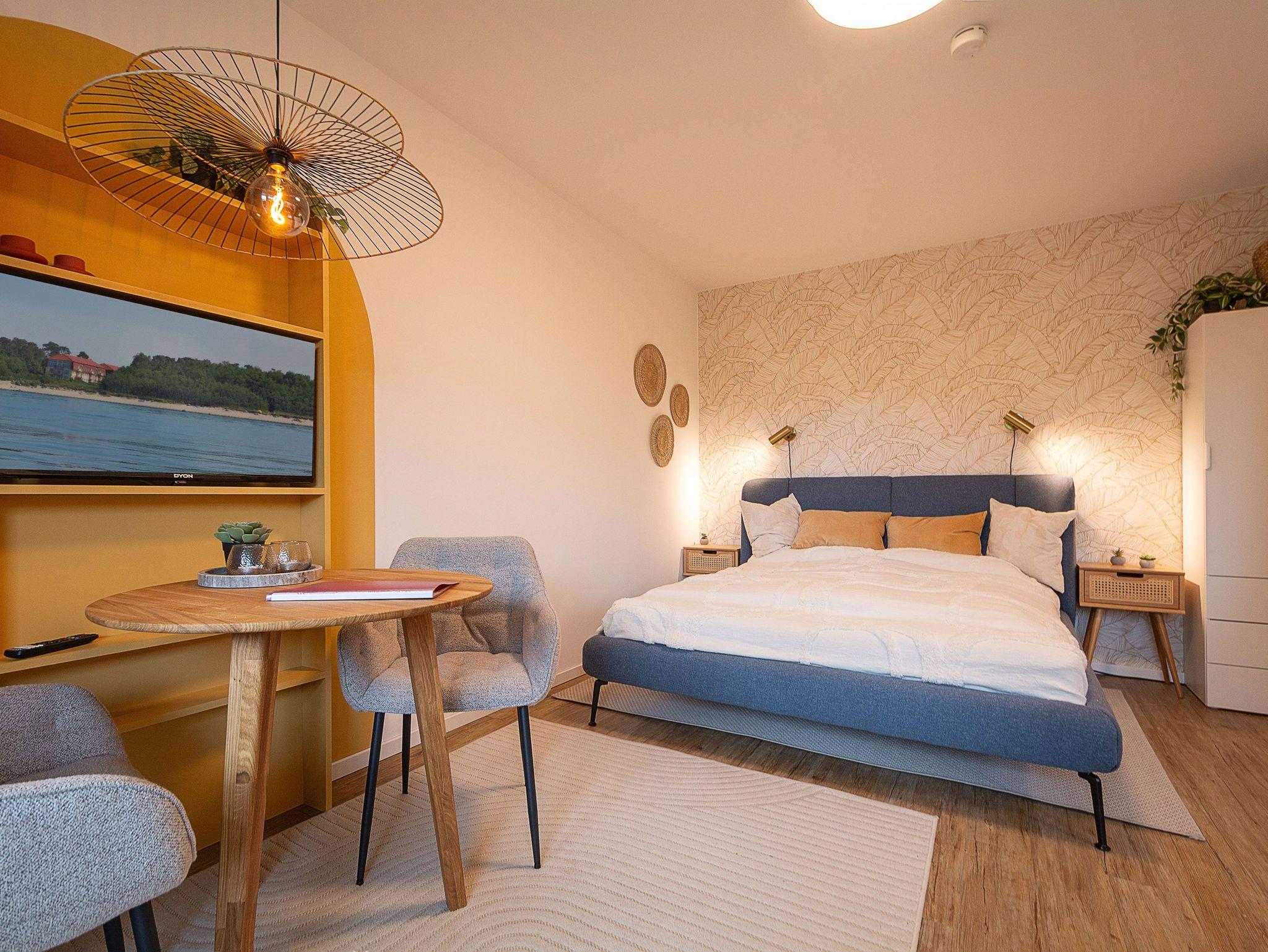 Sie wohnen in einer ca. 33 m² grossen 1-Raum-Ferienwohnung, die sich im Erdgeschoss der Residenz Dünengarten befindet. Die Wohnung wurde im Jahr 2024 komplett grundsaniert und besticht durch ihre moderne liebevolle Ausstattung. Es begrüßt Sie ein kombinierter Wohn- und Schlafbereich mit einem Doppelbett (180cm x 200cm), einem Kleiderschrank, einem kleinen Esstisch und einem Sessel sowie einem Flachbild-TV. Die moderne offene Küchenzeile hält für Sie alle wichtigen Küchengeräte bereit: Ein 2-Zonen-Ceranfeld, eine Mikrowelle mit Grillfunktion, ein Kühlschrank, eine Kaffeemaschine (mit eigenem Mahlwerk für ganze Bohnen!), Wasserkocher und Toaster sowie ausreichend Geschirr sind vorhanden. Vom Wohnbereich können Sie auch die möblierte West-Terrasse betreten, die zu langen Abenden zu einem Gläschen Wein einlädt. Das Bad mit Badewanne und WC vervollständigt das Gesamtbild dieser Wohnung.