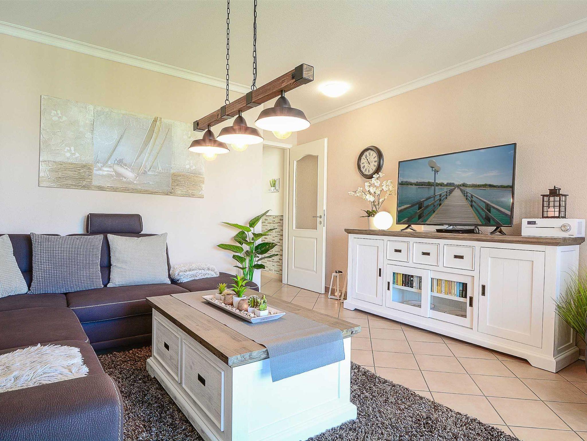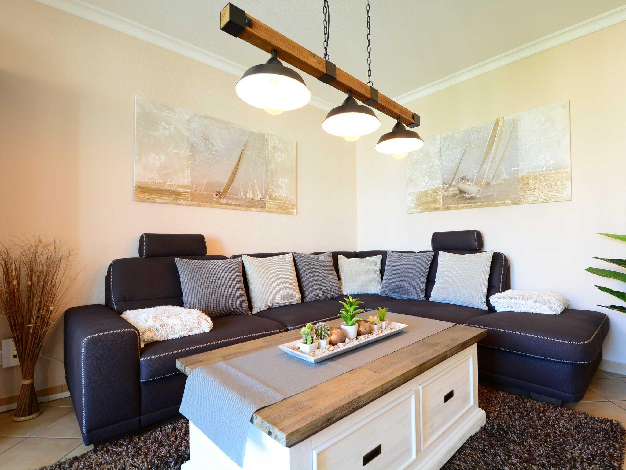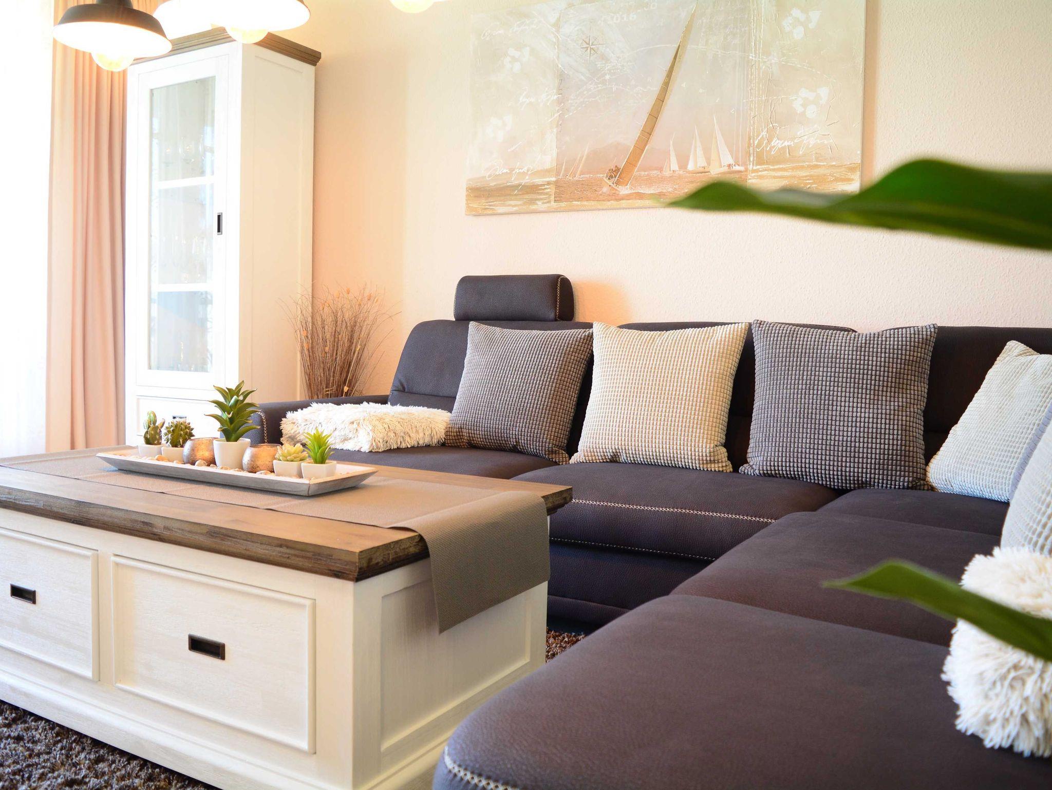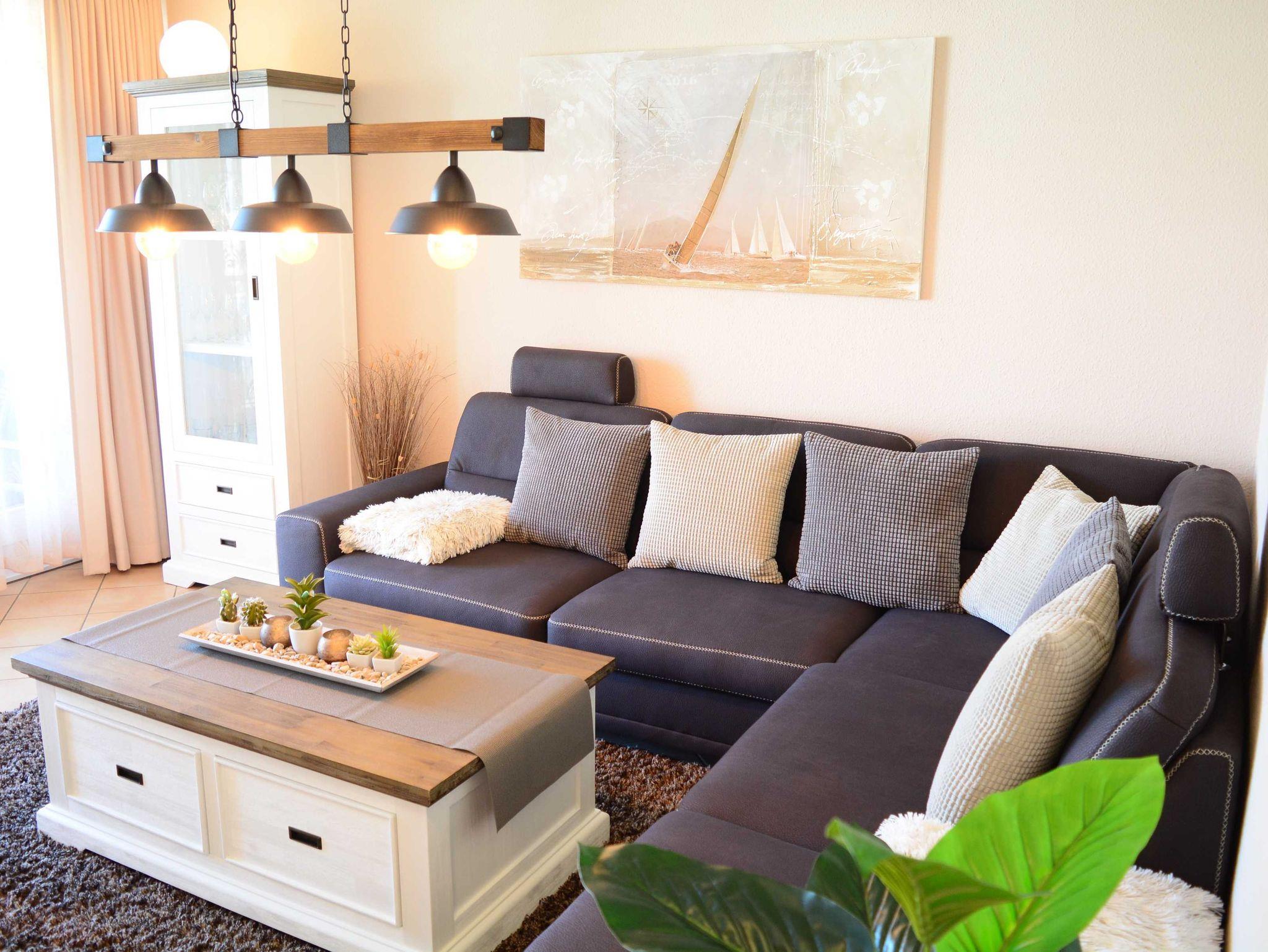 Das modern und gemütlich eingerichtete Wohnzimmer ist ausgestattet mit einer bequemen Sofalandschaft einer, Stereoanlage, einem 49-Zoll-Flat-TV-Gerät und DVD-/Blu Ray-Player. Von hier betreten Sie den nach Westen ausgerichteten Balkon. Hier können Sie Sonne tanken, relaxen und den Abend nach einem schönen Tag am Meer ausklingen lassen.