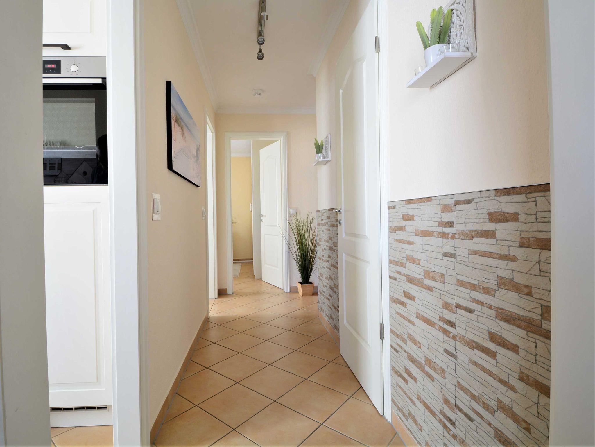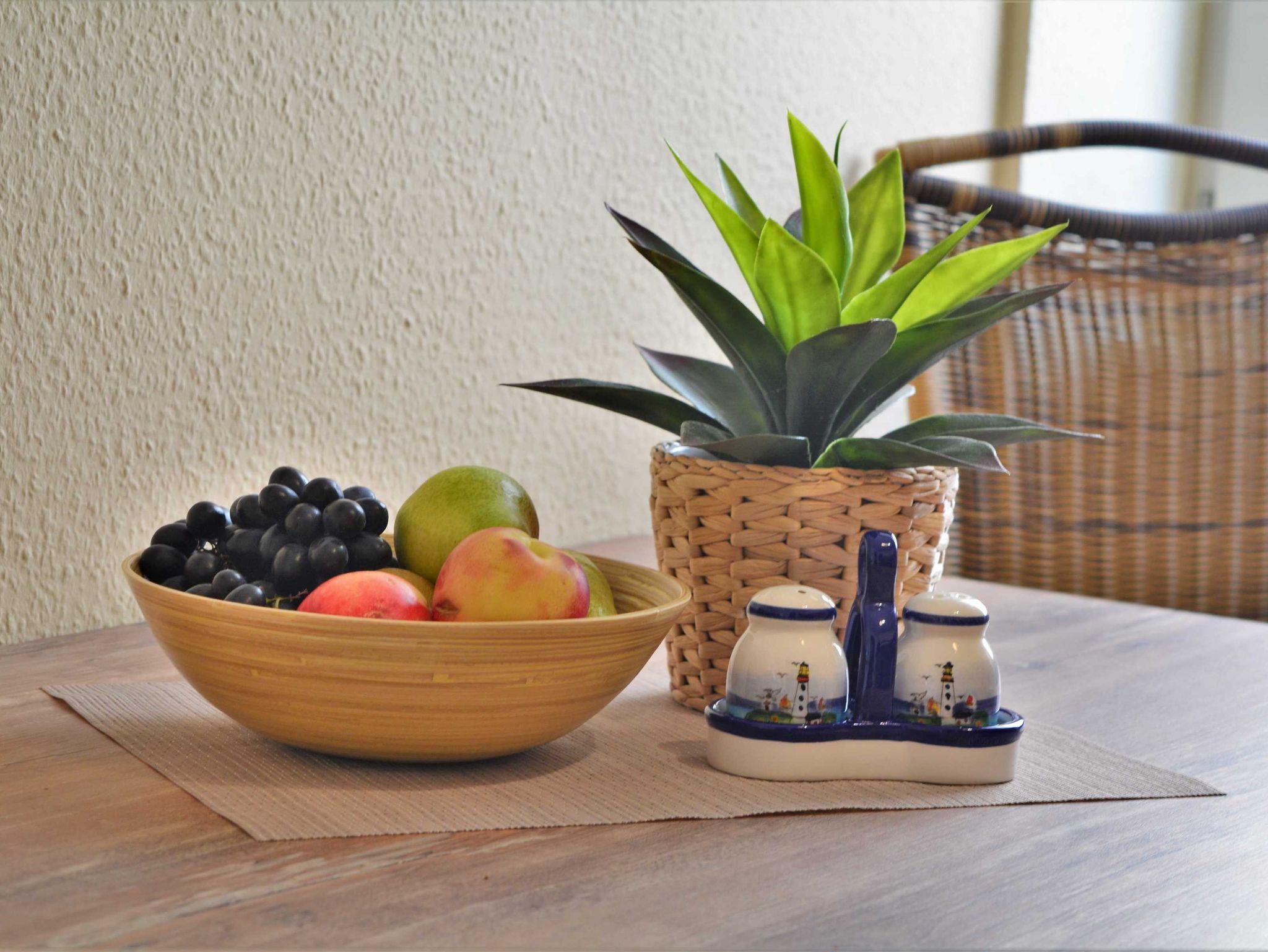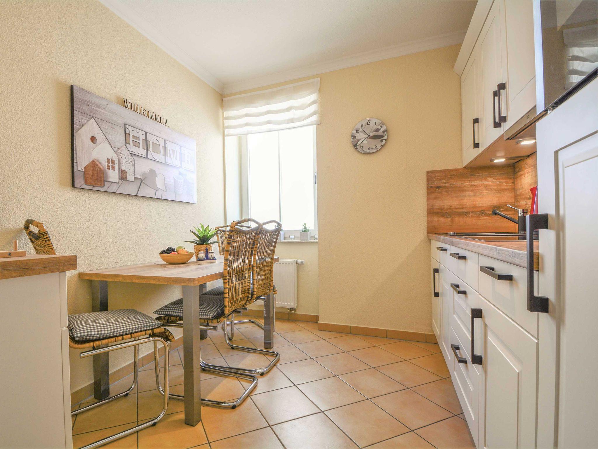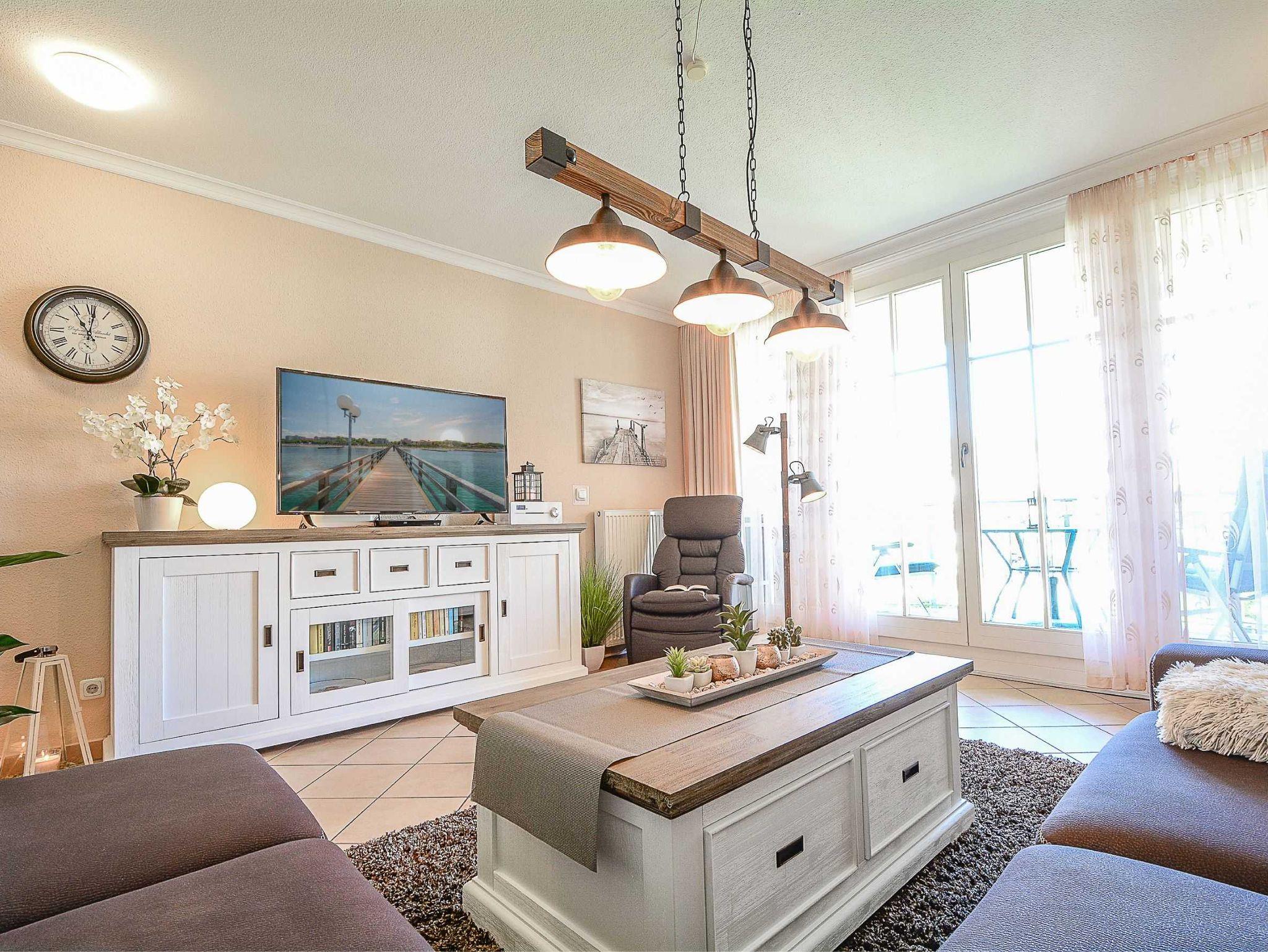 Das modern und gemütlich eingerichtete Wohnzimmer ist ausgestattet mit einer bequemen Sofalandschaft einer, Stereoanlage, einem 49-Zoll-Flat-TV-Gerät und DVD-/Blu Ray-Player. Von hier betreten Sie den nach Westen ausgerichteten Balkon. Hier können Sie Sonne tanken, relaxen und den Abend nach einem schönen Tag am Meer ausklingen lassen.