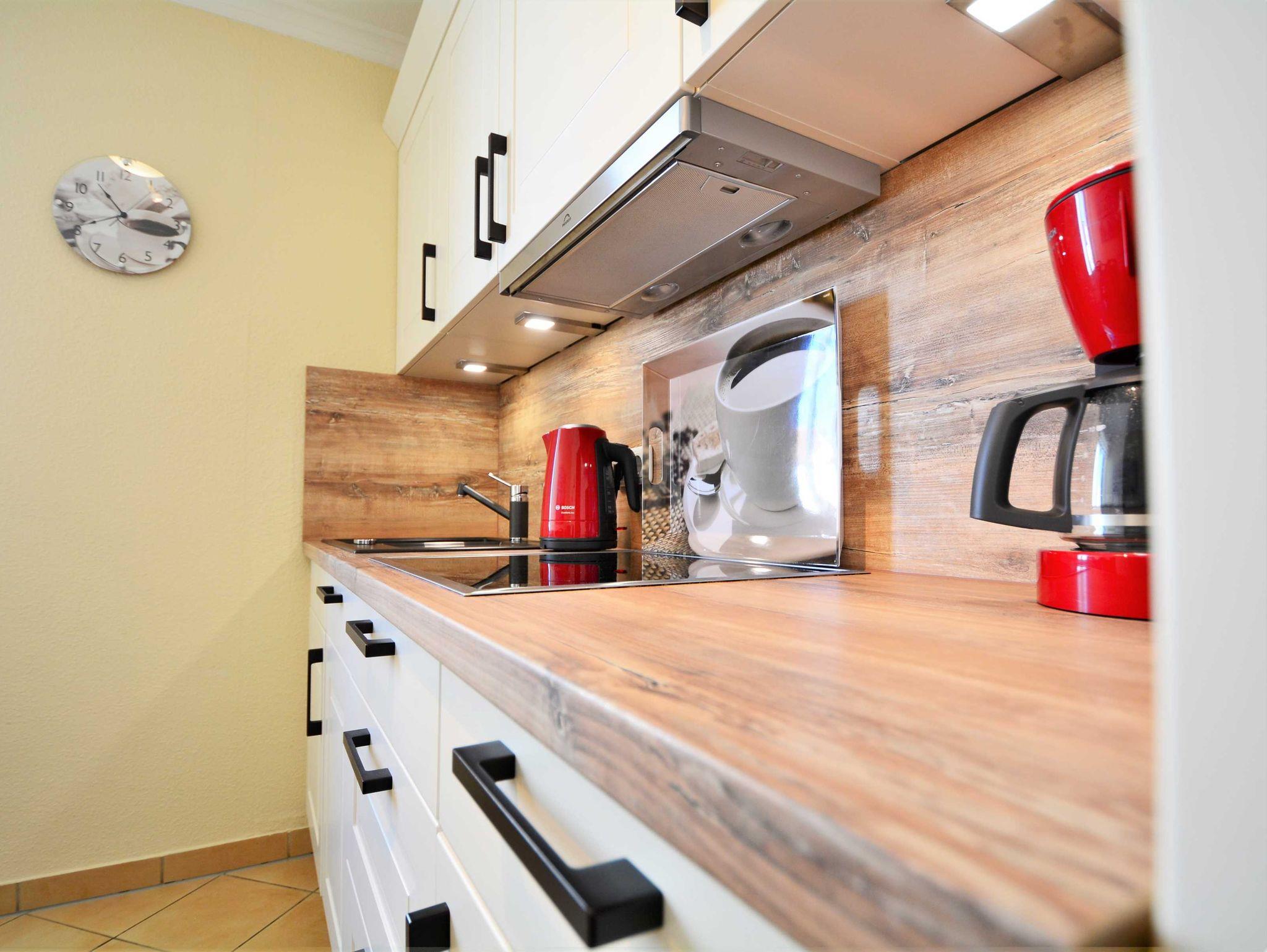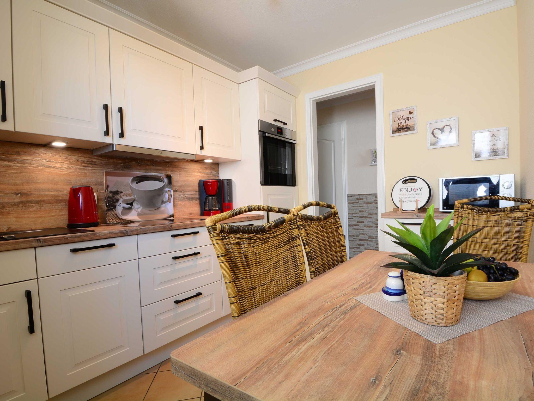 In der separaten Küche finden Sie alle wichtigen Küchengeräte und -utensilien, die Sie für Ihr „perfektes Dinner“ benötigen: Ein 4-Zonen- Cerankochfeld, ein Backofen in bequemer Stehhöhe, eine Mikrowelle, eine Geschirrspülmaschine sowie ein Kühlschrank mit Gefrierfach befinden sich in der Küche. Eine Kaffeemaschine, ein Wasserkocher und ein Toaster sowie genügend Koch- und Essgeschirr vervollständigen die Kücheneinrichtung. Der integrierte Essbereich bietet Ihnen reichlich Platz für gemeinsame Mahlzeiten.