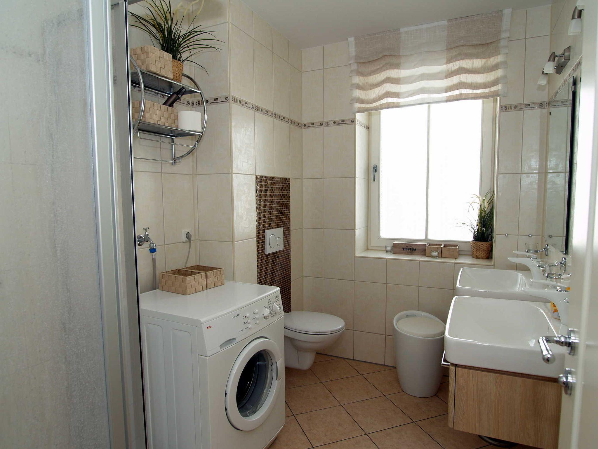 Das Tageslichtbad mit Dusche und WC, 2 Waschbecken und einer Waschmaschine vervollständigt das Gesamtbild dieser Wohnung.