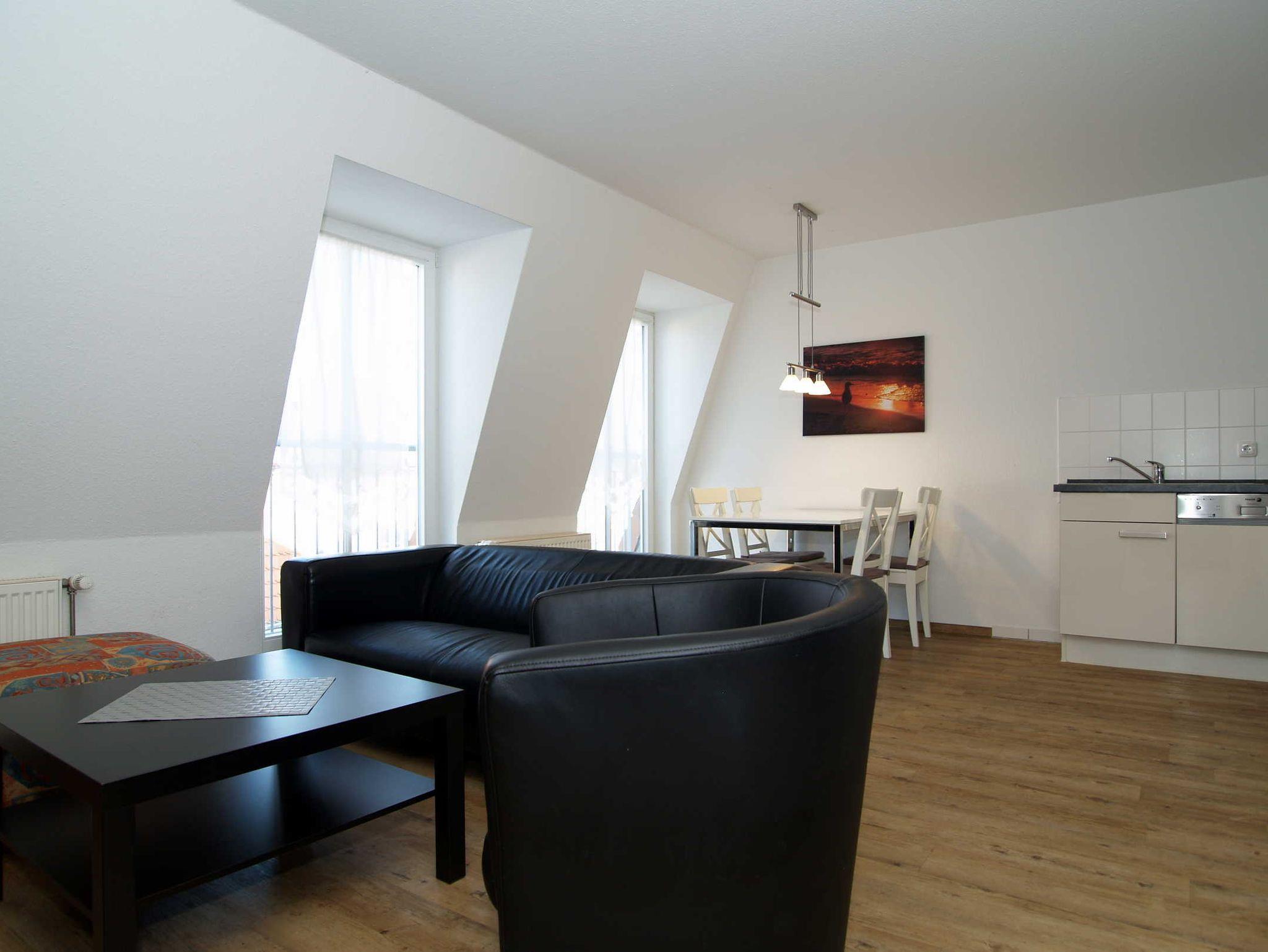 Genießen Sie Ihren Urlaub in dieser charmanten, ca. 50 qm großen 3-Raum-Ferienwohnung, die sich im zweiten Obergeschoss des Hauses Olymp befindet. Der gemütliche Wohnbereich ist mit einer offenen Küchenzeile ausgestattet, die alles bietet, was Sie für Ihren Aufenthalt benötigen: einen Herd mit Backofen, Geschirrspüler, Mikrowelle und Kaffeemaschine. Hier können Sie gemeinsam kochen und entspannen, während eine Stereoanlage und ein TV-Gerät für Unterhaltung sorgen.
