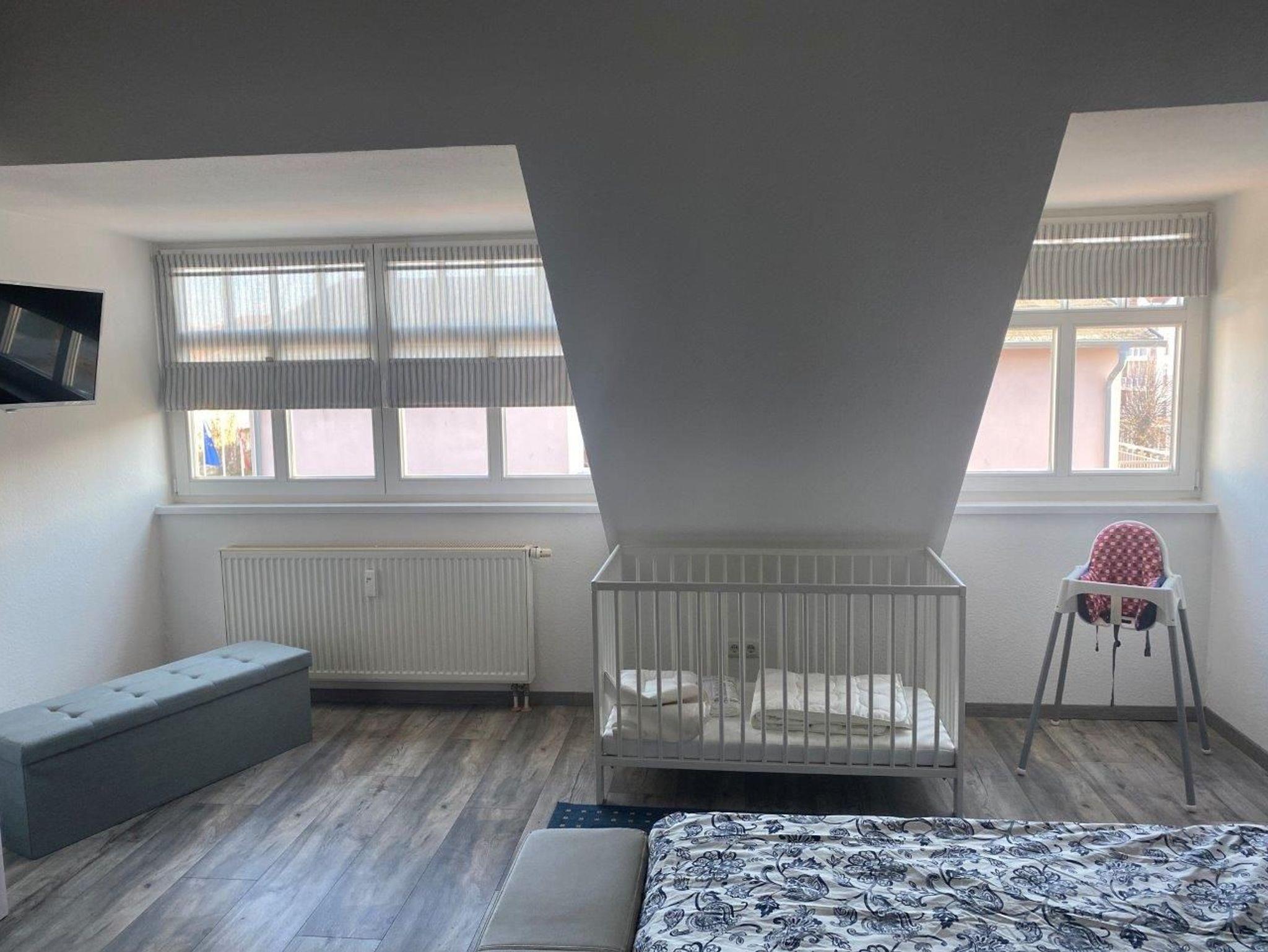 - 1. Schlafzimmer mit Doppelbett (getrennte Matratzen), Kleiderschrank und festem Kinderbett, TV