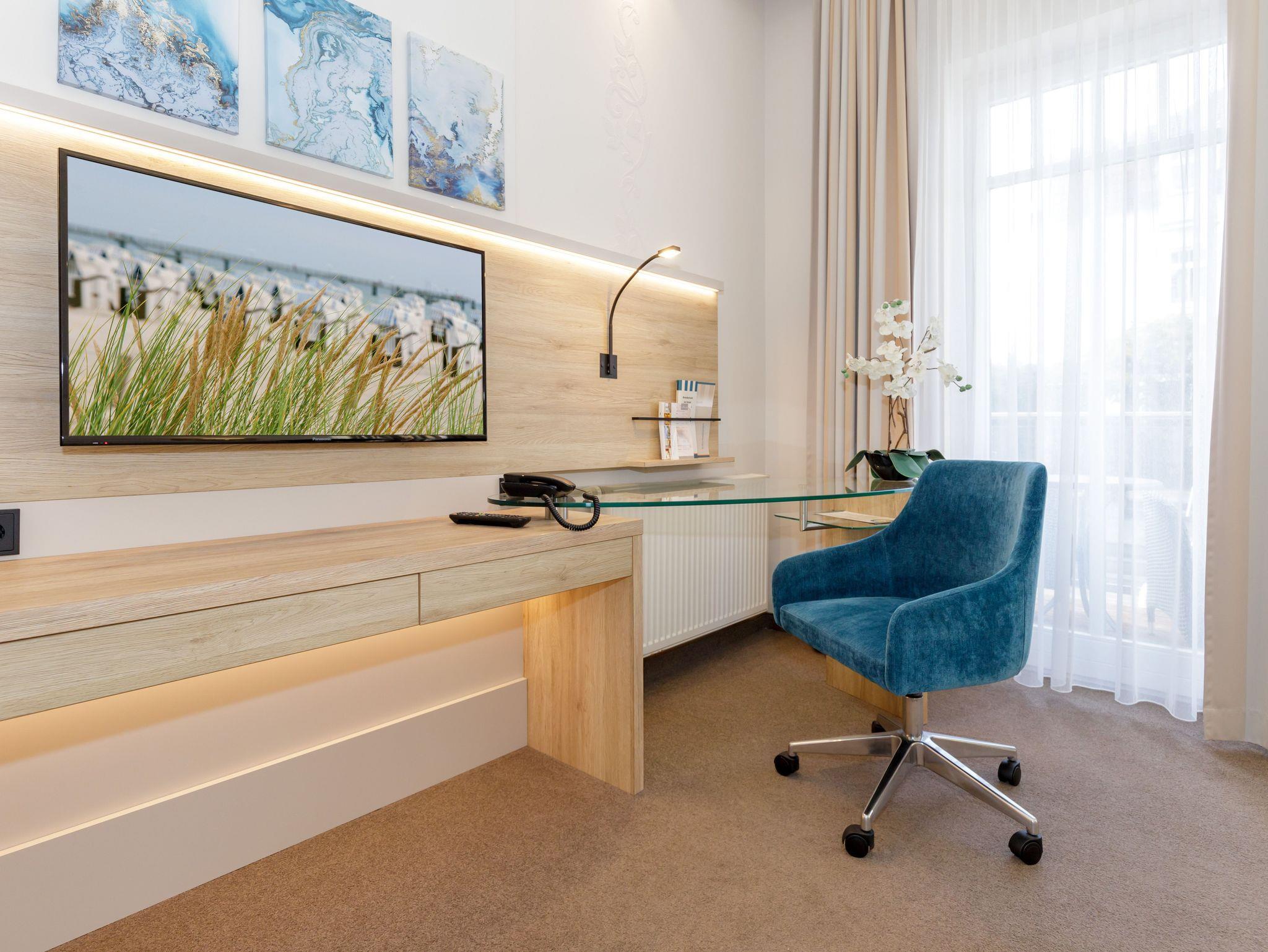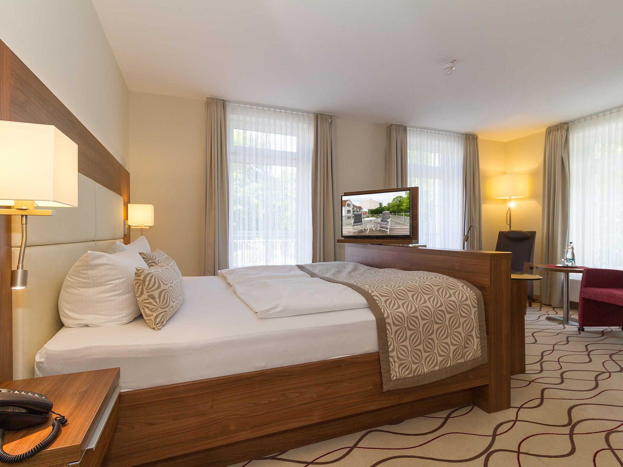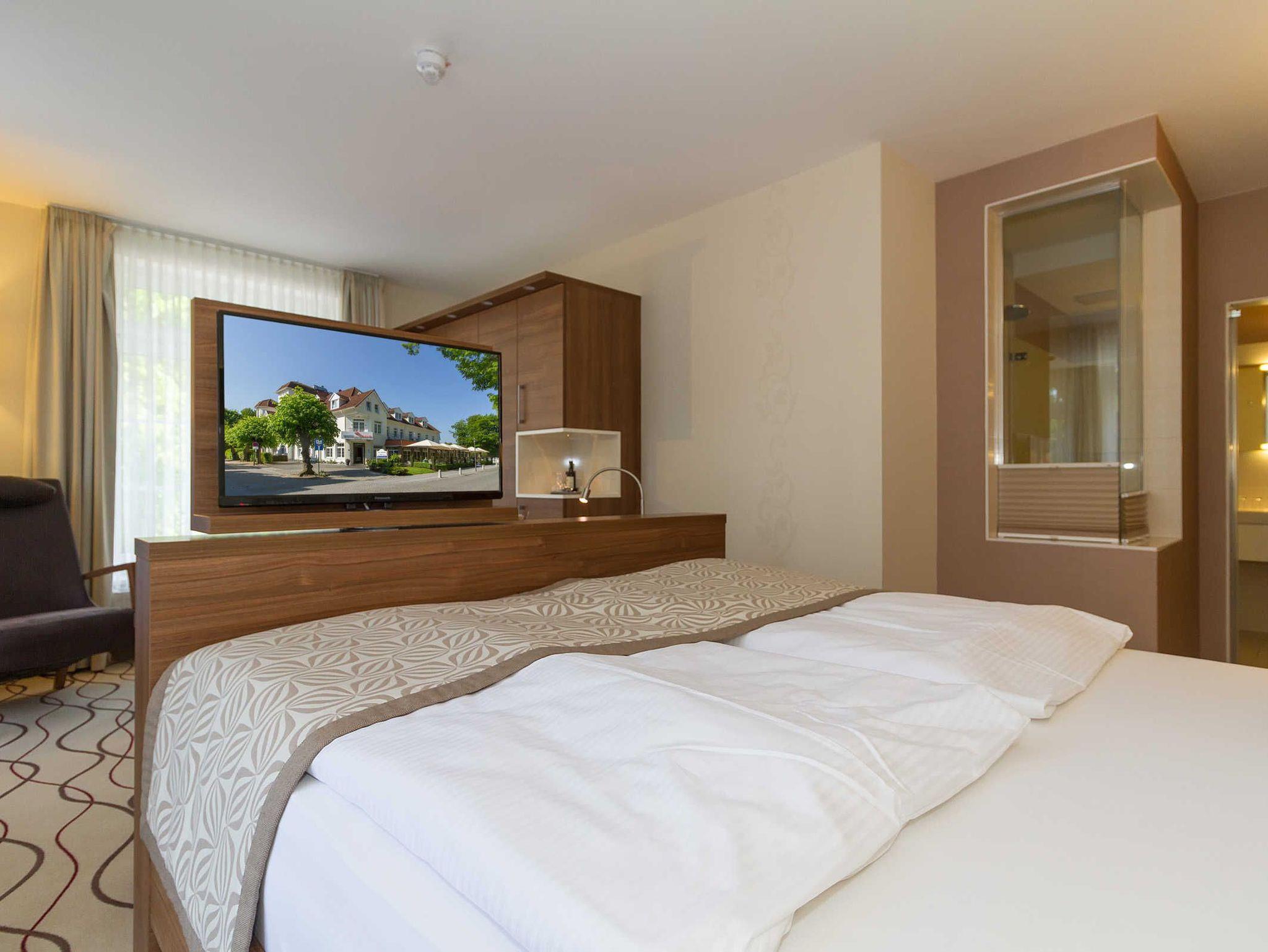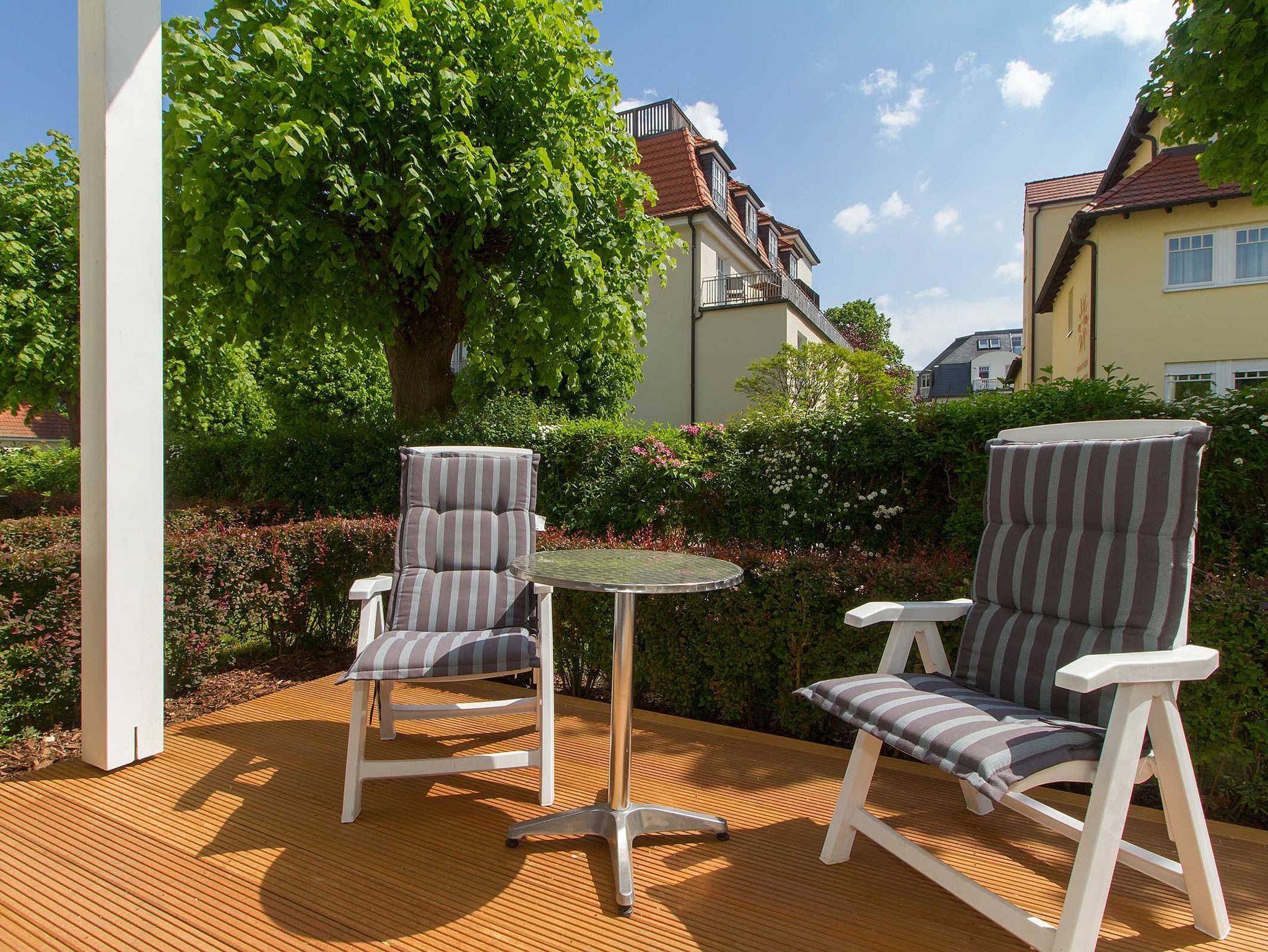 Zum Strand sind es nur ca. 50 Meter, der Stadtwald liegt hinter den Häusern und zur Seebrücke etwa 500 Meter. Das à la carte Restaurant verfügt über eine große Außenterrasse, auf der Sie auch im Sommer Frühstücken können.