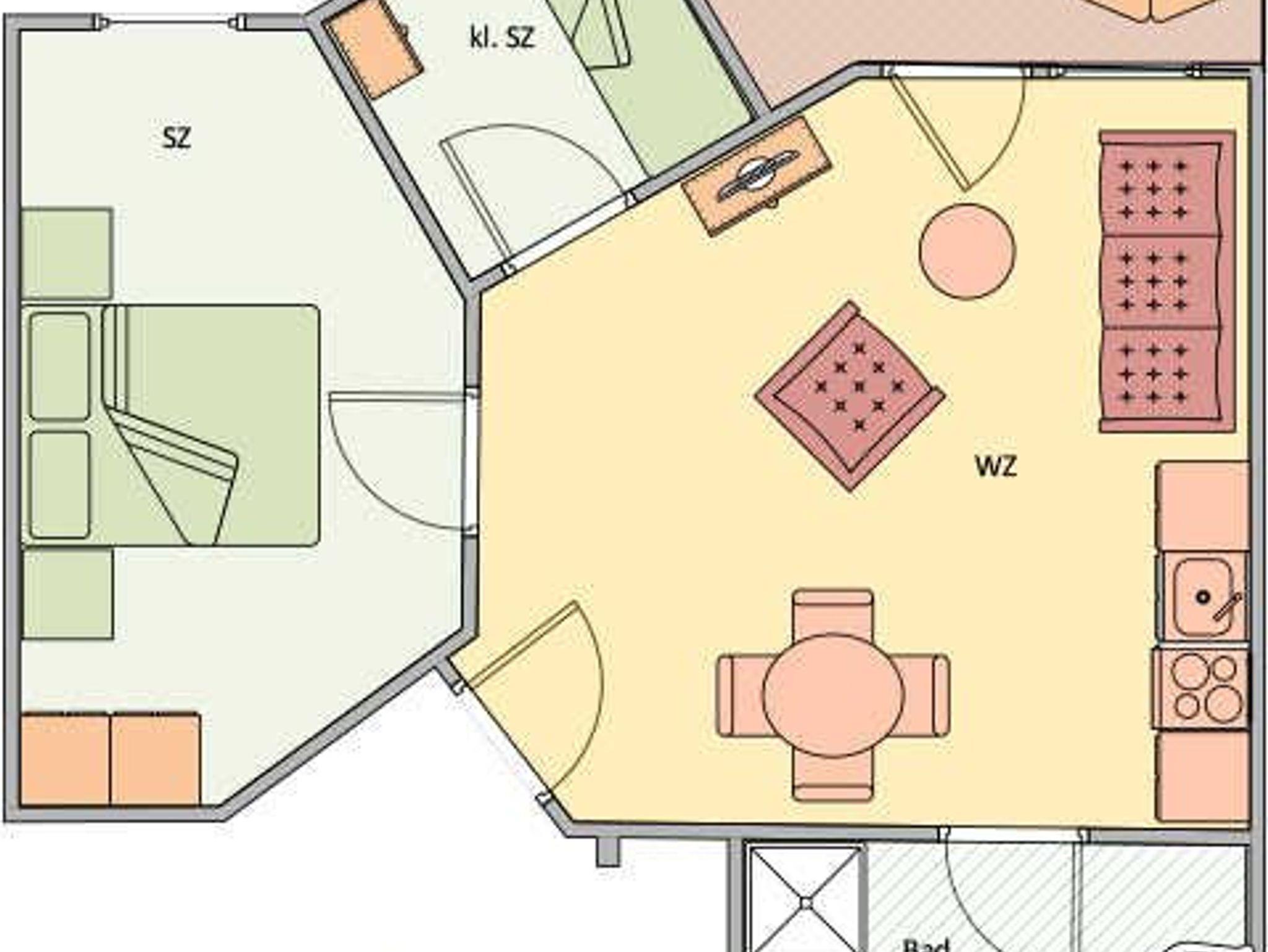 Die Wohnung ist im 2. Obergeschoss gelegen und hat einen Balkon zur Südseite. Die Wohnungsgröße beträgt ca. 45 qm und teilt sich in Wohnzimmer, Küchenzeile, Schlafzimmer, kl. Kinderzimmer, Duschbad. Im Wohnzimmer befindet sich ein Esstisch mit 4 Stühlen, eine Küchenzeile, Kühlschrank, Caranfeld, Mikrowelle mit Backofen, Tresor, HD-Sat TV und Telefon.