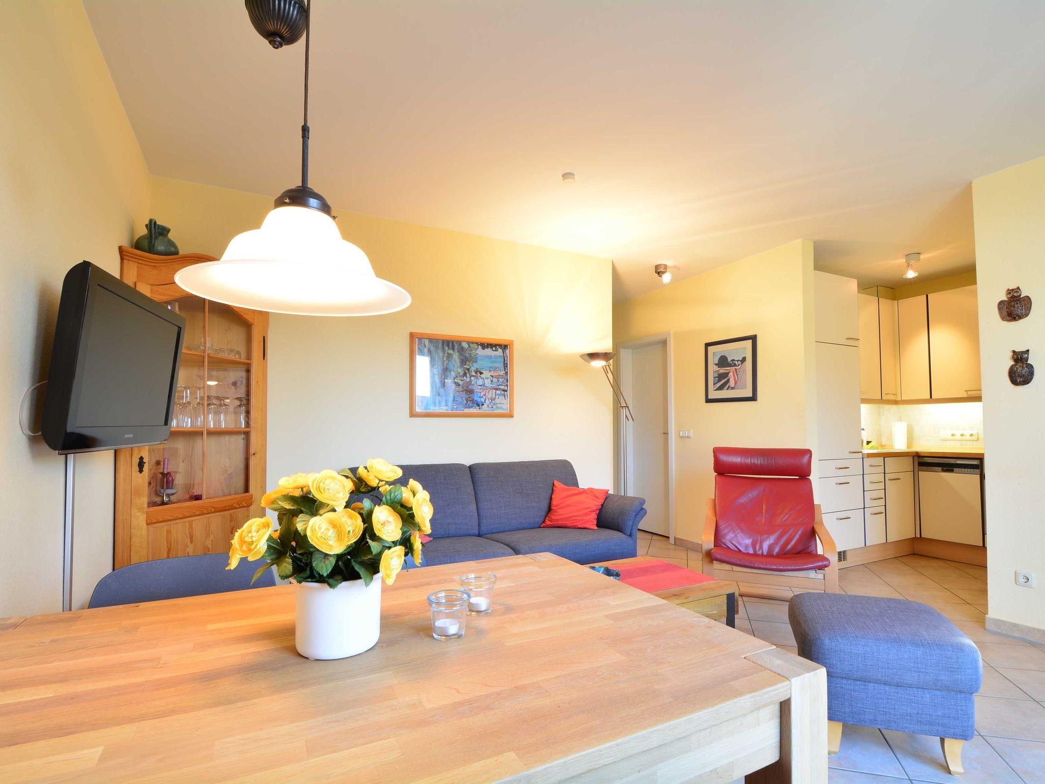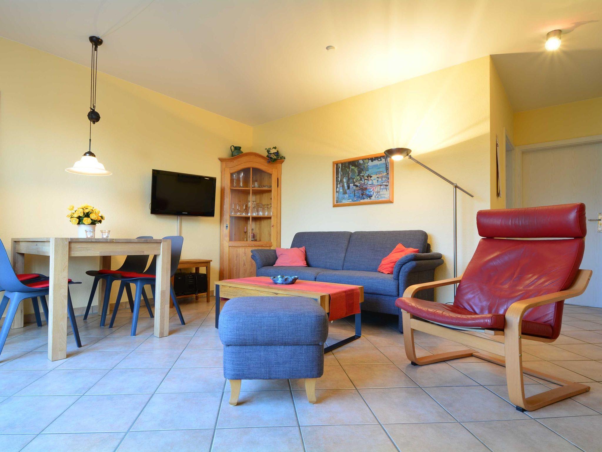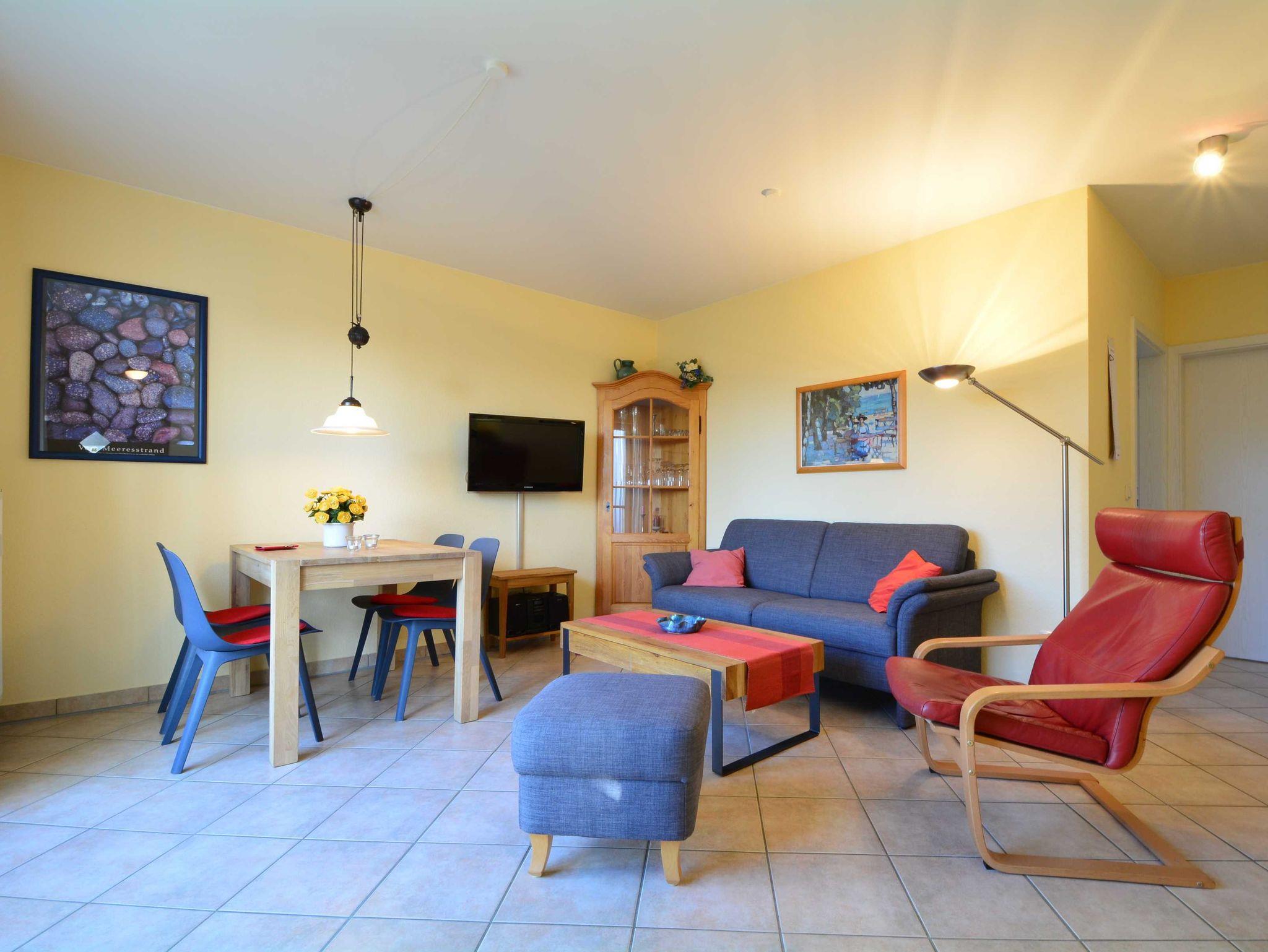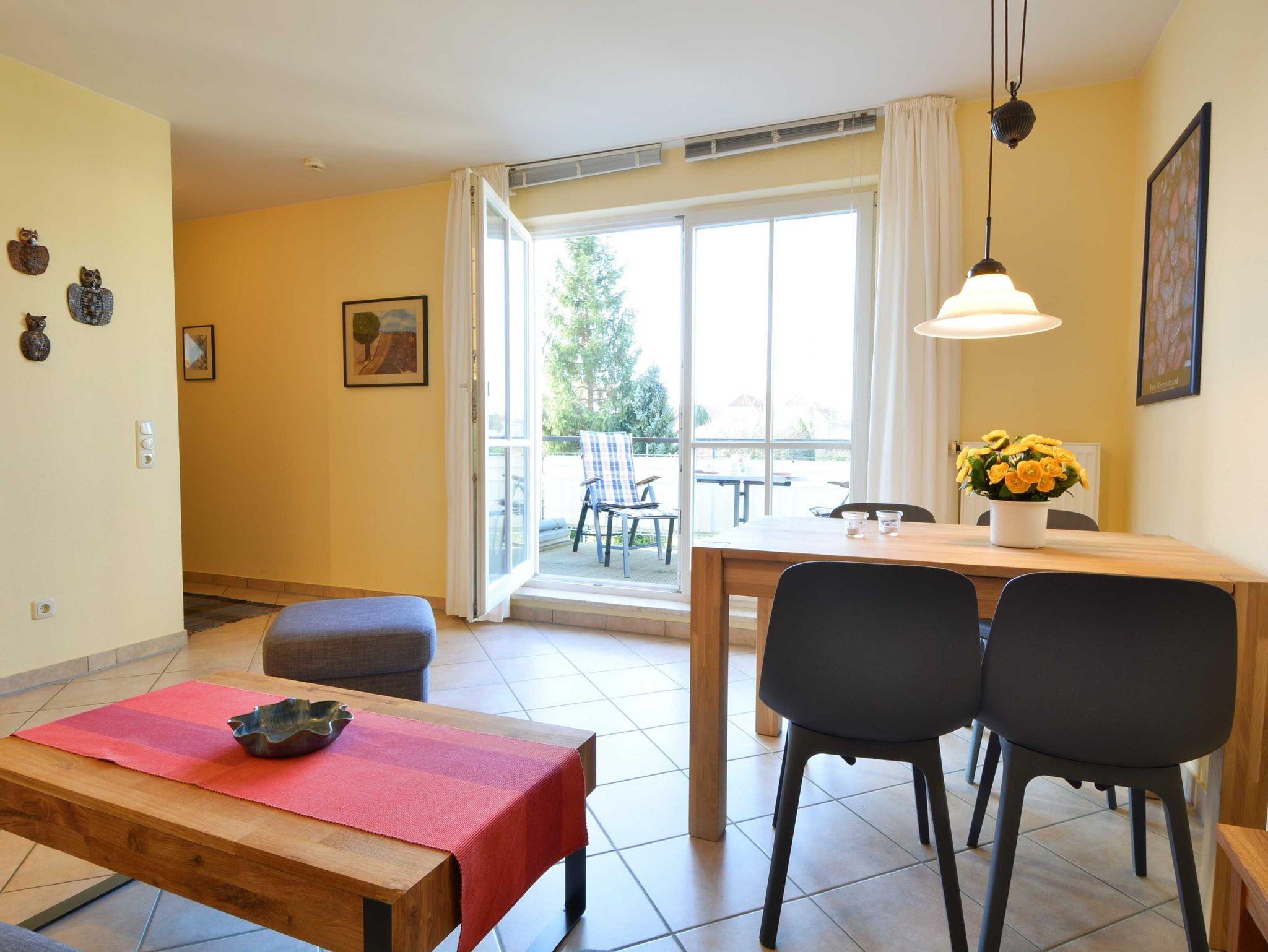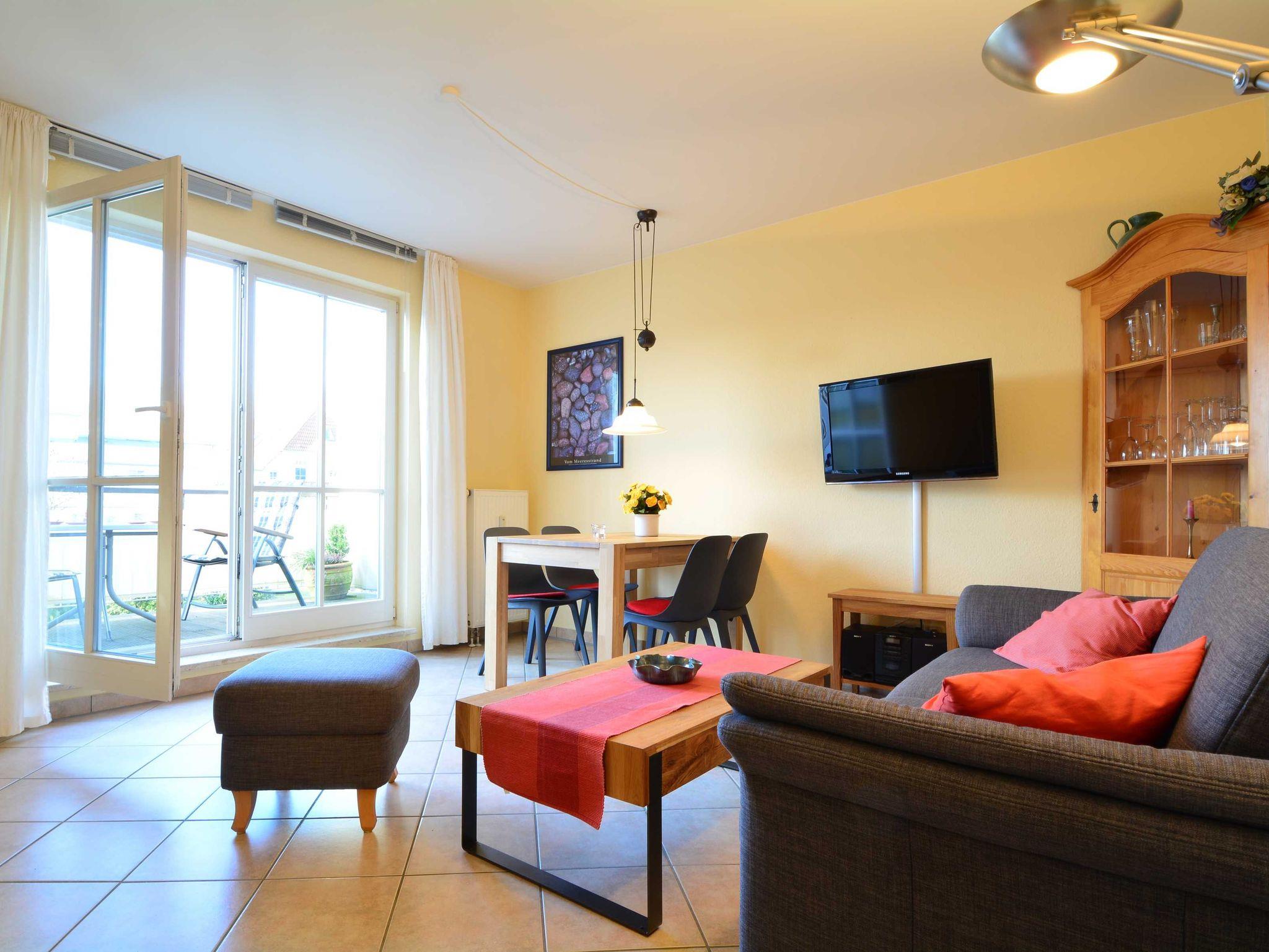 Ankommen und Wohlfühlen: Die liebevoll eingerichtete 3-Raum-Ferienwohnung von 62qm Größe befindet sich im ersten Obergeschoss und empfängt Sie mit einem gemütlichen offenen Wohnbereich. Hier finden Sie eine bequeme Couchgarnitur vor sowie einen 32-Zoll-Flatscree-TV und eine Musikanlage vor. Ein gemütlicher Esstisch mit 4 Stühlen lädt zum langen Frühstück und schönen gemeinschaftlichen Mahlzeiten ein. Von hier können Sie den möblierten Süd-Balkon betreten, auf dem Sie Sonne tanken und relaxen können.
