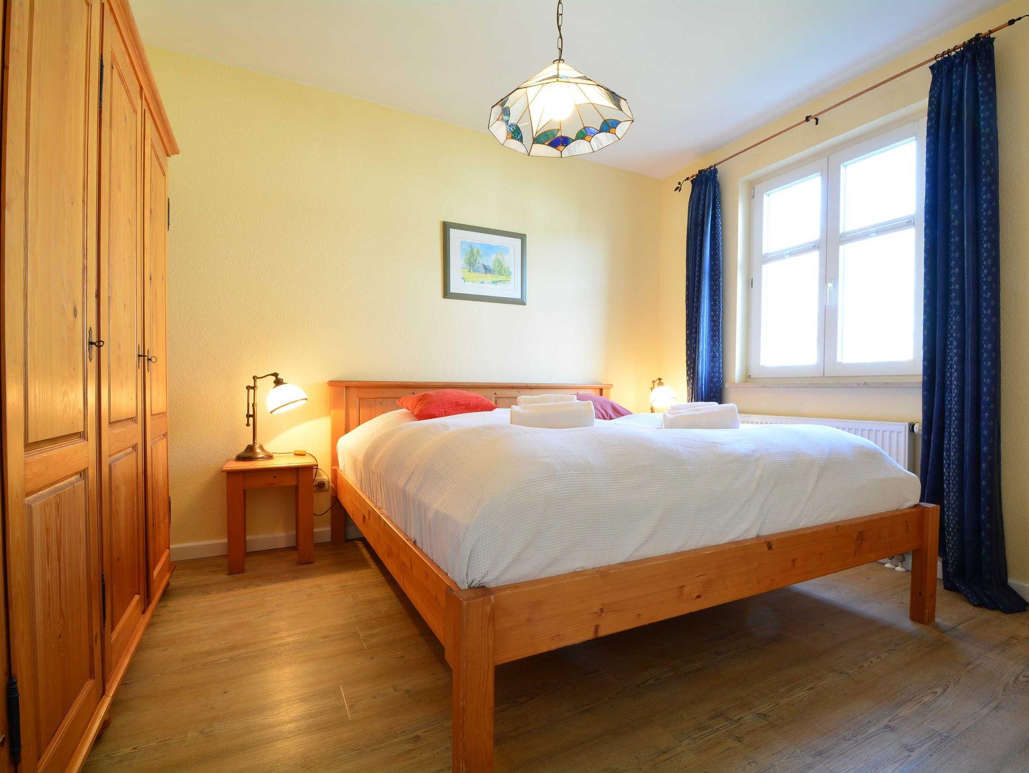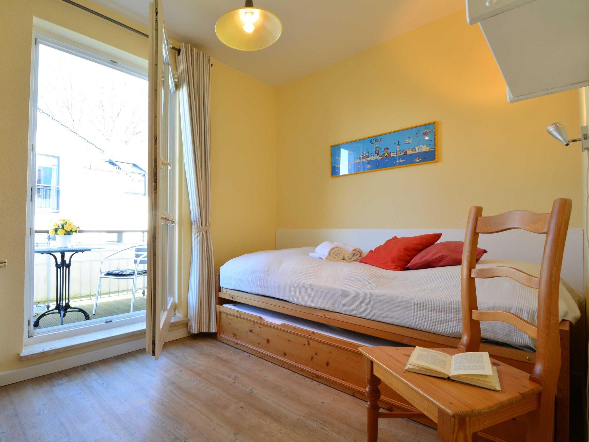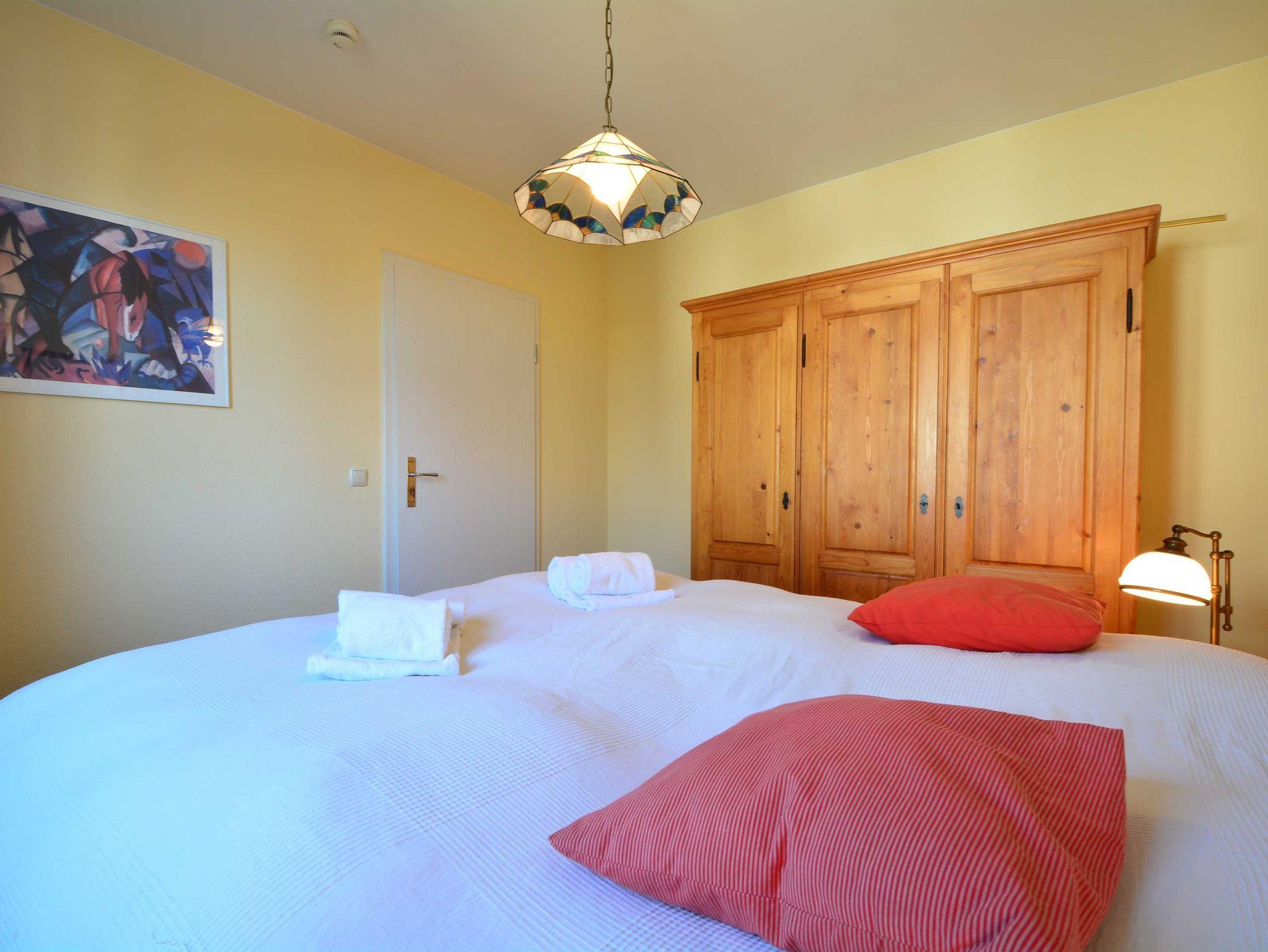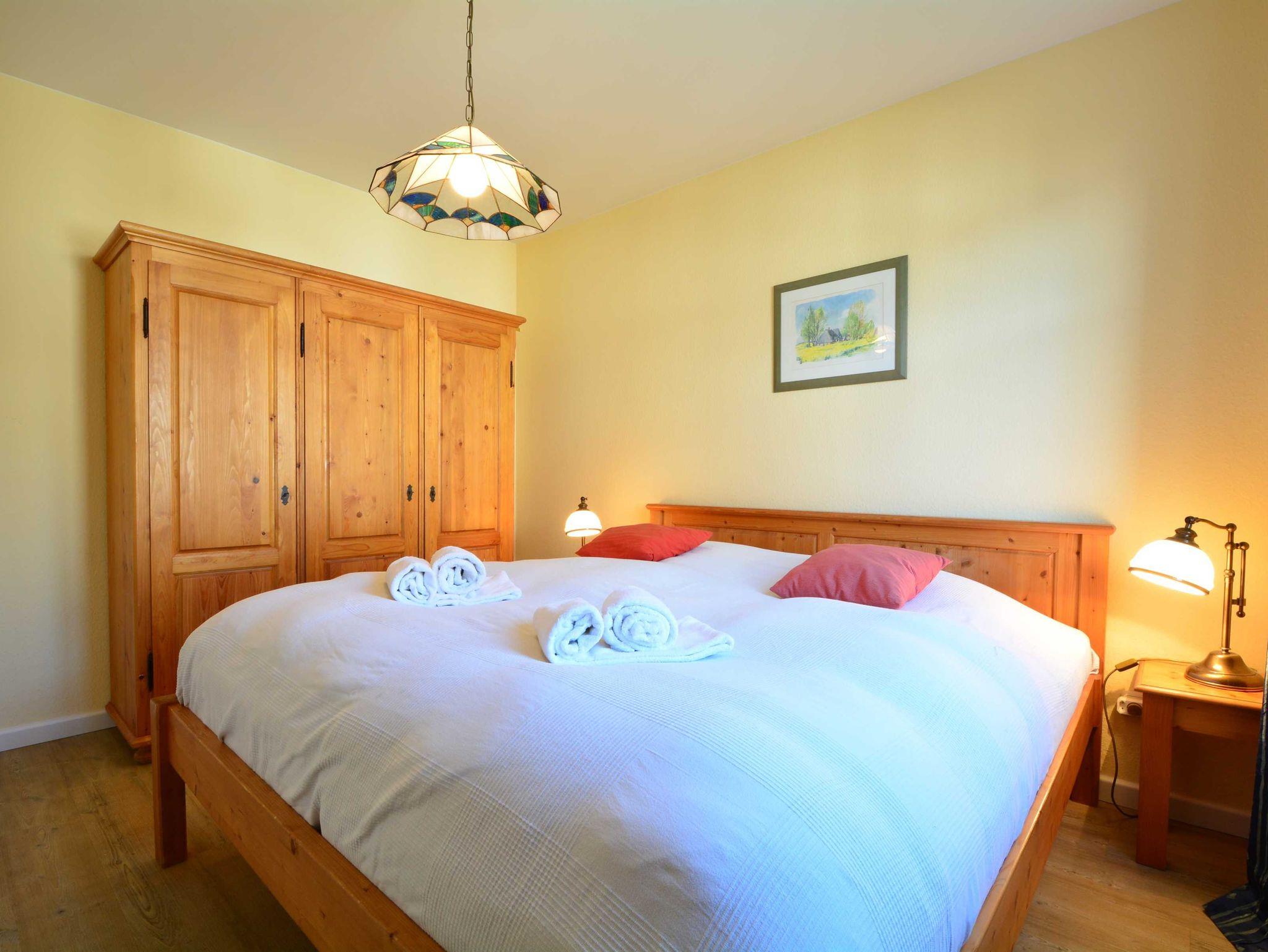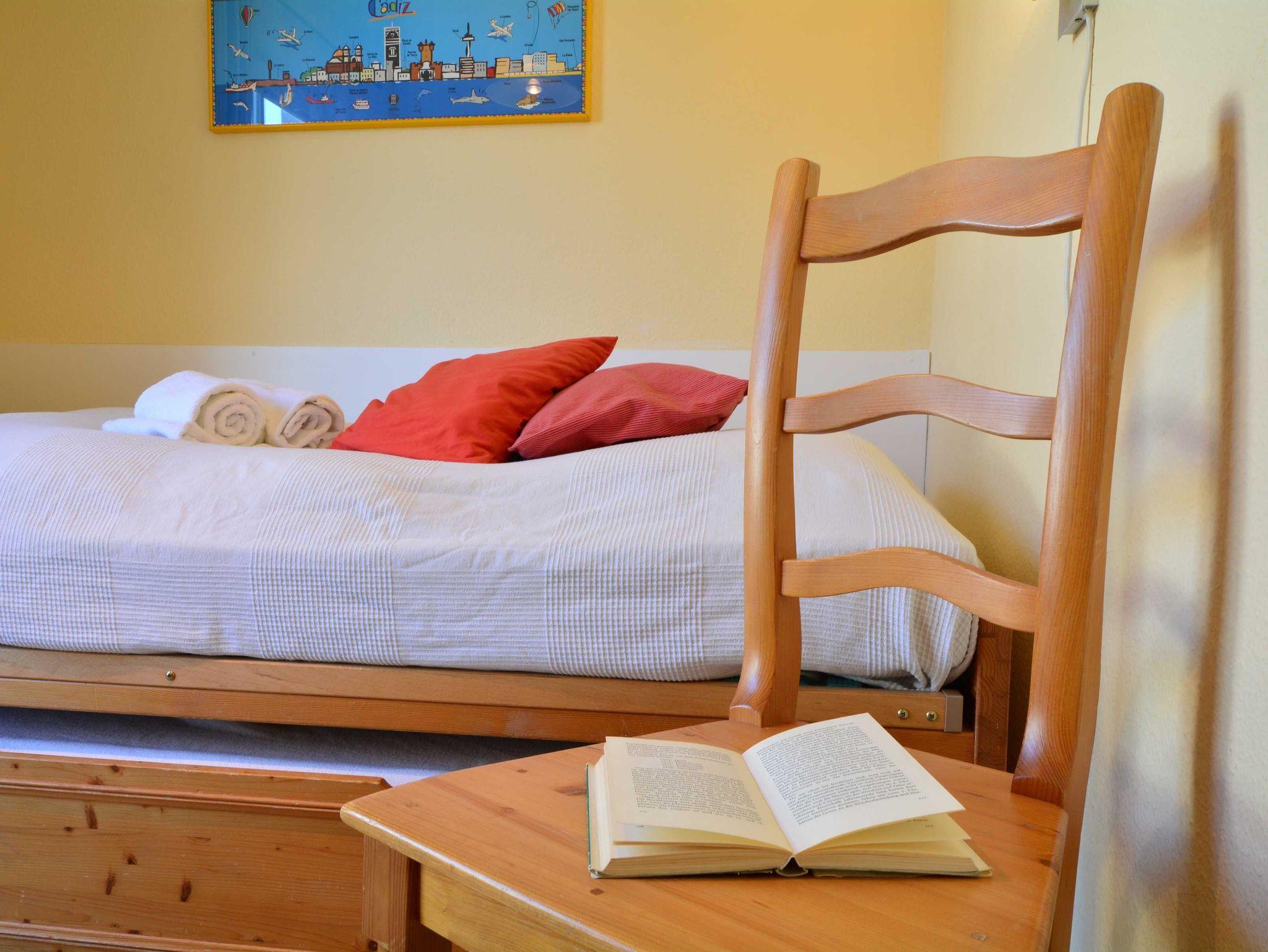 Das große Schlafzimmer ist ausgestattet mit einem Doppelbett (2 x 90cm x 200cm) und großem Kleiderschrank. Im kleinen Schlafzimmer direkt nebenan befindet sich ein ausziehbares Holzbett (90x200m / ausgezogen 160x200m) und ein kleiner Kleiderschrank. Von hier können Sie den kleinen Nord-Balkon betreten, der Platz für 2 Personen bietet. Das Bad ist ausgestattet mit Dusche und WC.
