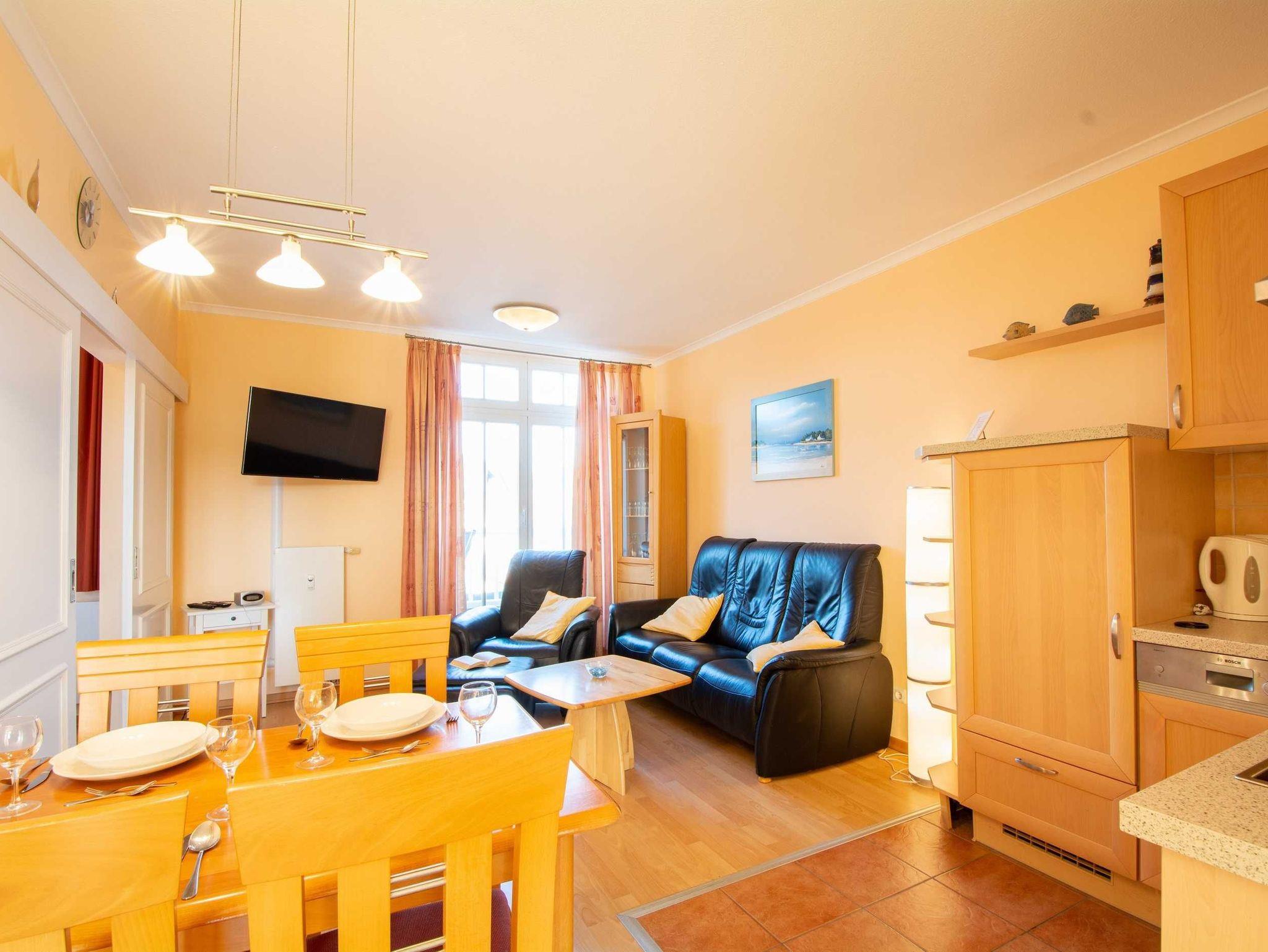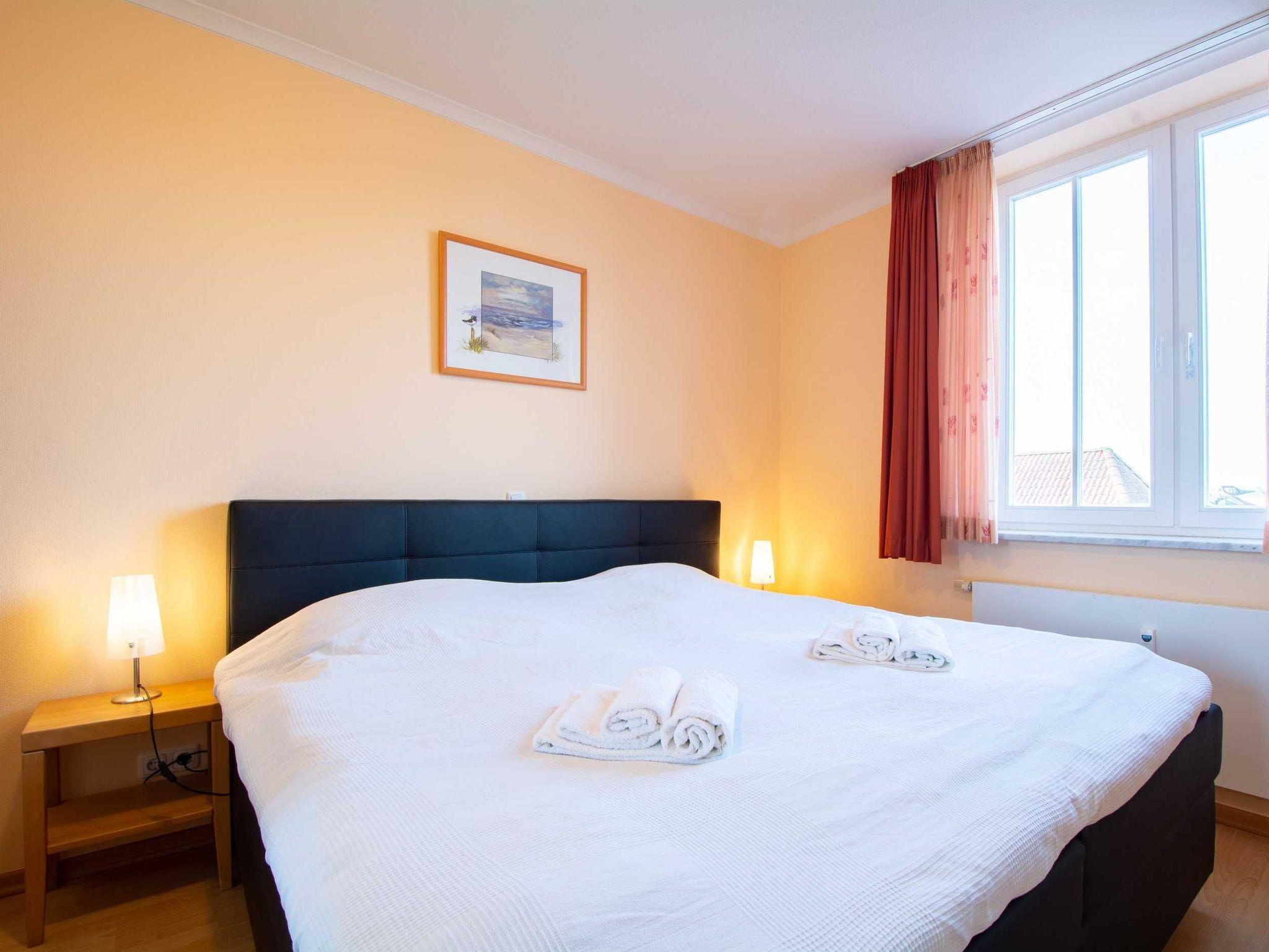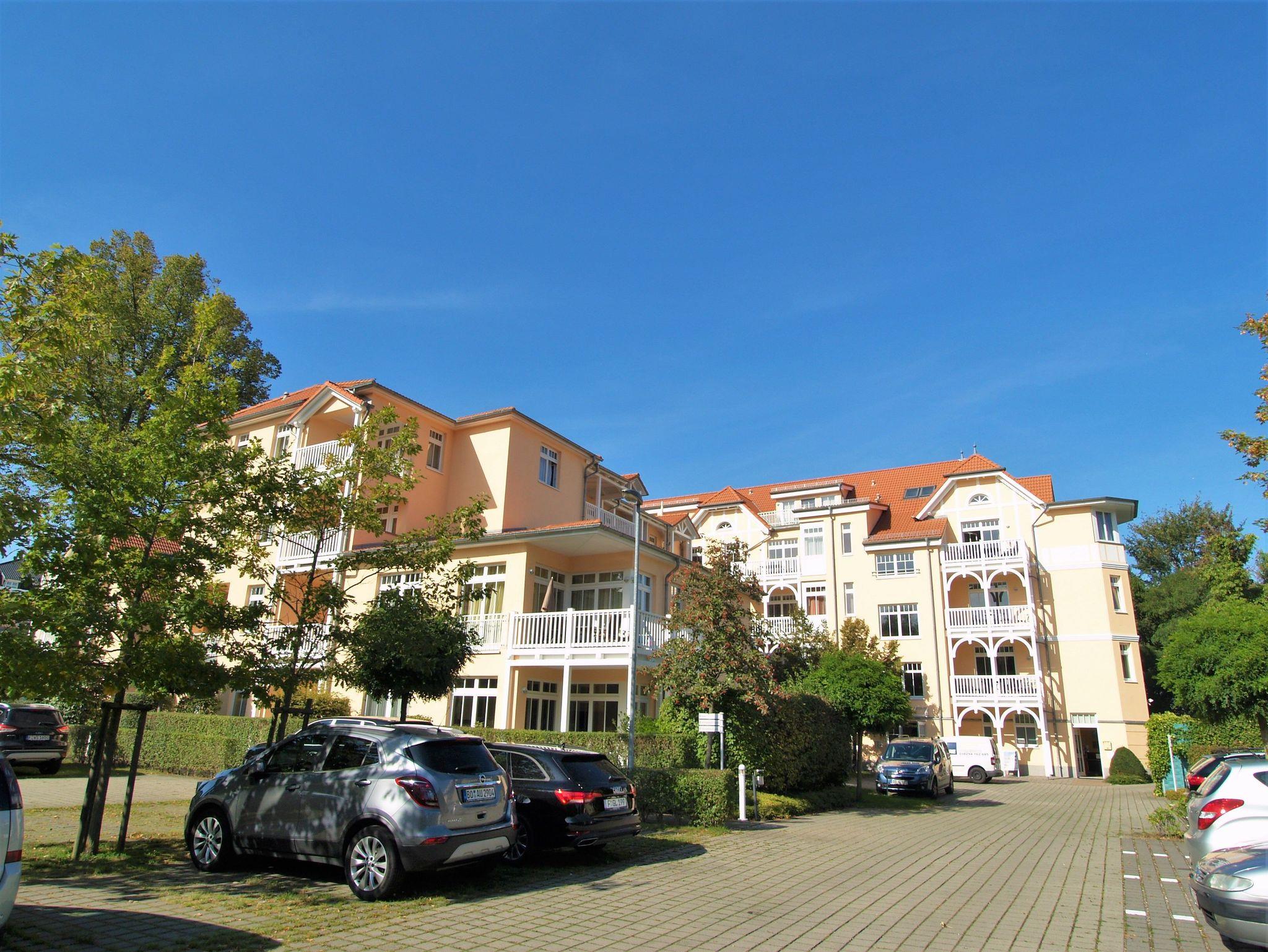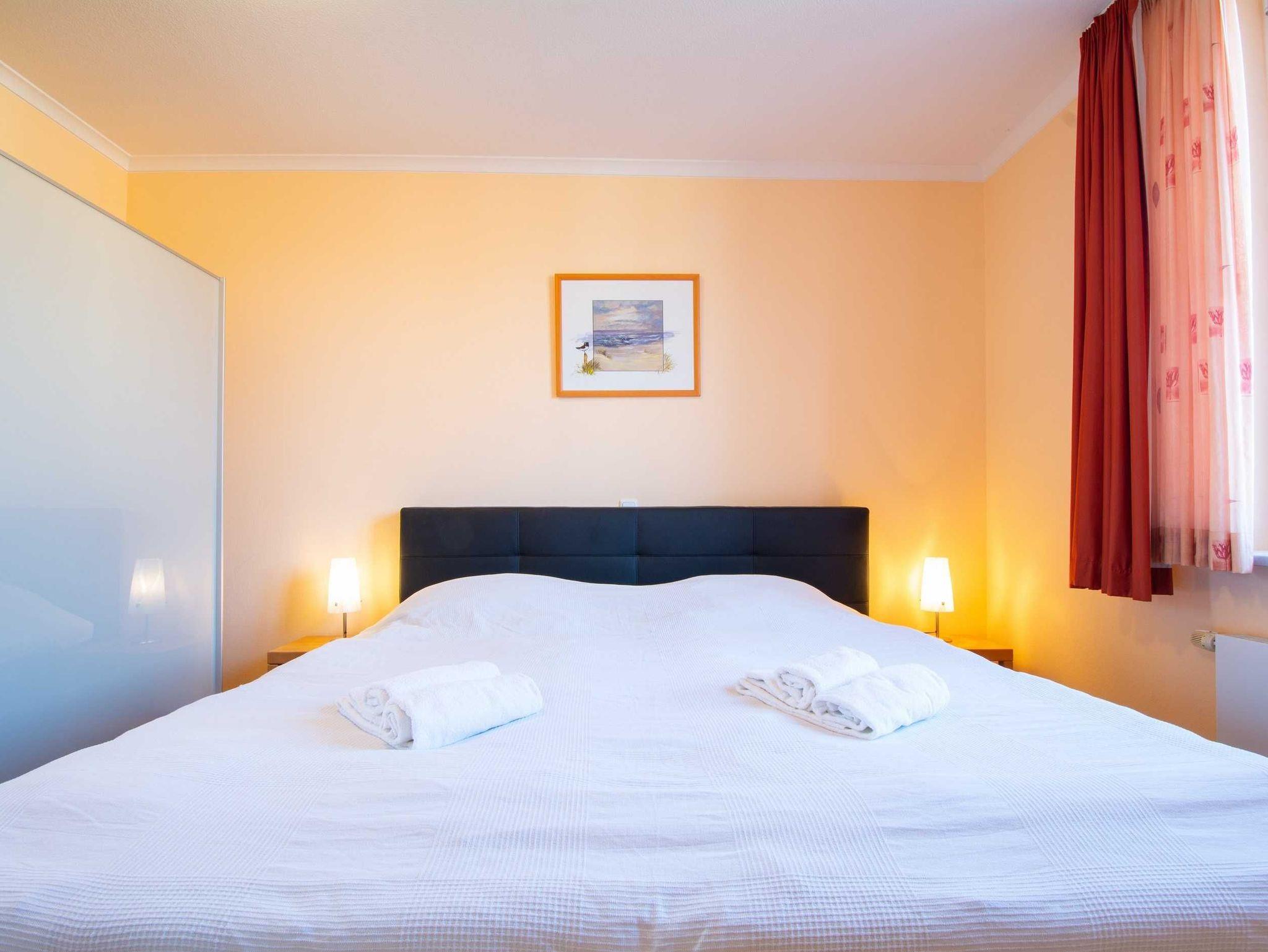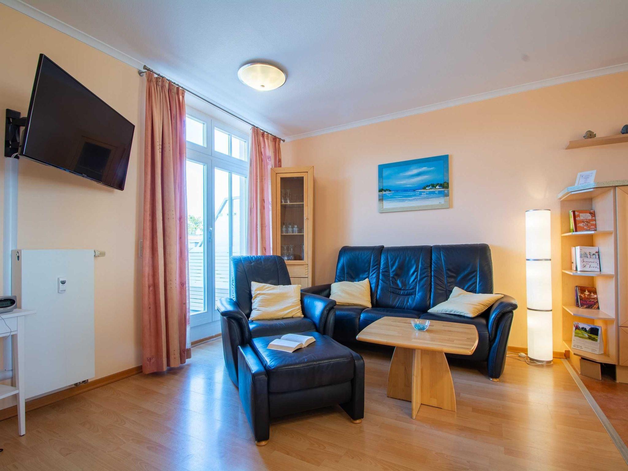 Das liebevoll eingerichtete 3-Raum-Appartement mit einer Gesamtfläche von 56 qm bietet Platz für 2 bis 4 Personen, befindet sich in der 3. Etage des Haupthauses und ist bequem über einen Fahrstuhl (Seiteneingang 1b) erreichbar. Es verfügt über einen Wohnbereich mit offener Küche (hier inklusive E-Herd mit Ceran-Kochfeld, Kühlschrank, Geschirrspüler, Dunstabzugshaube u.a.), ein Schlafzimmer mit Doppelbett, ein Schlafzimmer mit Tandembett, Sanitärbereich mit Badewanne und Duschmöglichkeit sowie je ein Balkon zur Ost- und Westseite. Zur Ausstattung gehört ein Flachbild-TV mit Radioempfangsteil. In den Allgemeinräumen des Hauses stehen Fahrradkeller, Münzwaschmaschine und -trockner zur Verfügung. Ein PKW-Stellplatz ist kostenfrei auf dem umzäunten Grundstück vorhanden. Die Benutzung des Schwimmbades sowie der beiden Saunen und der anderen Sport- und Fitnessräume ist inklusive!
