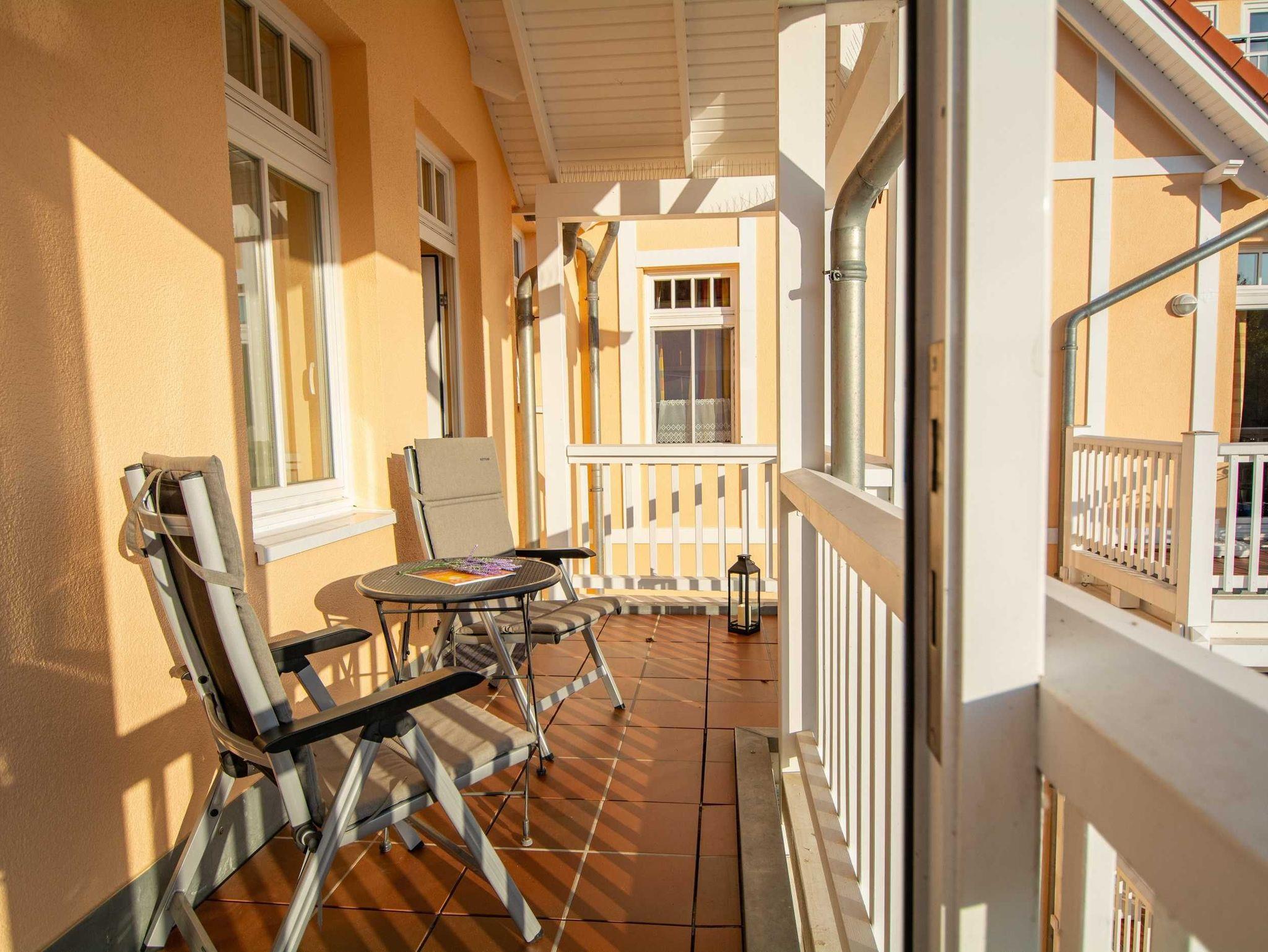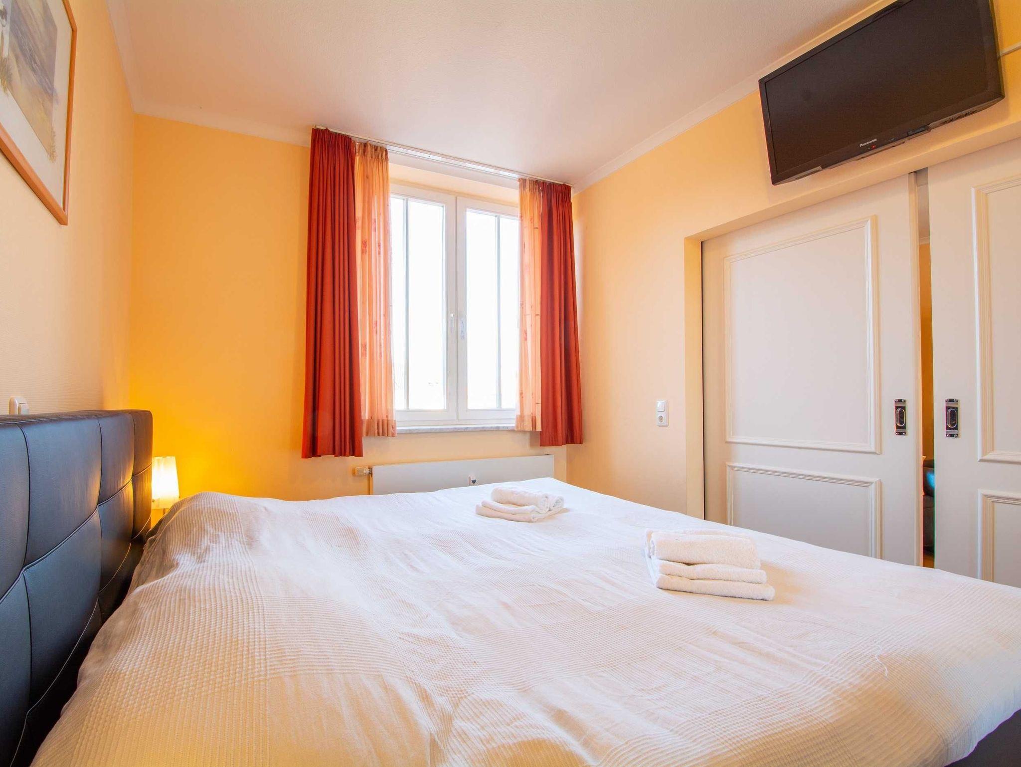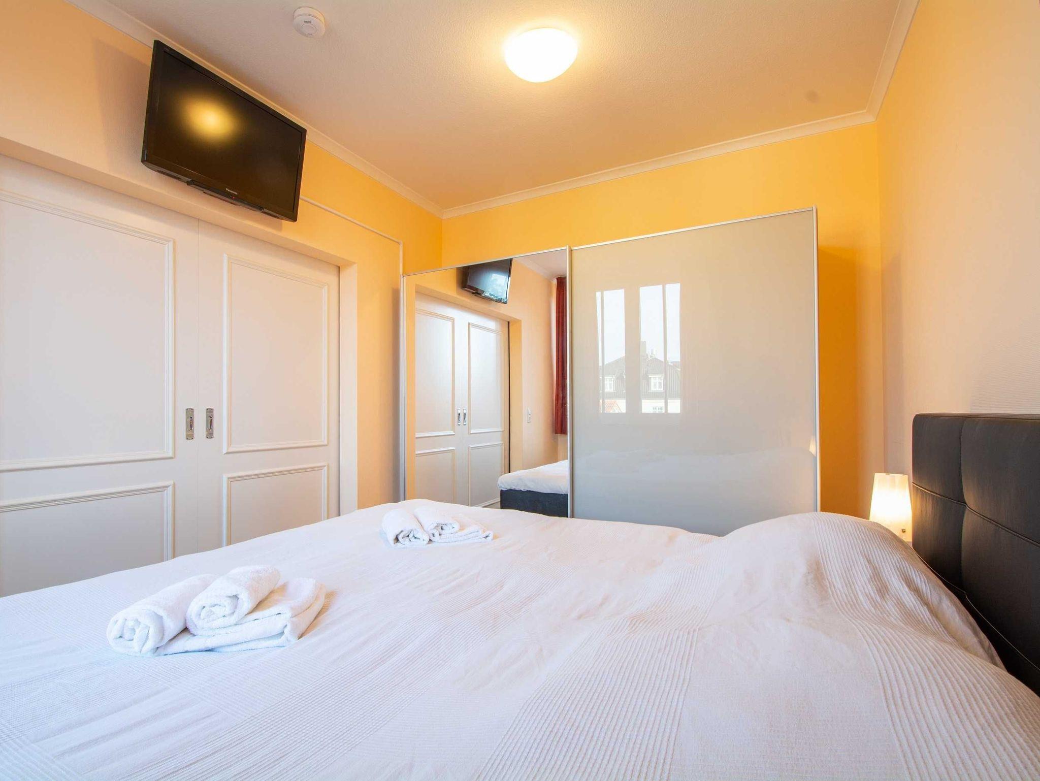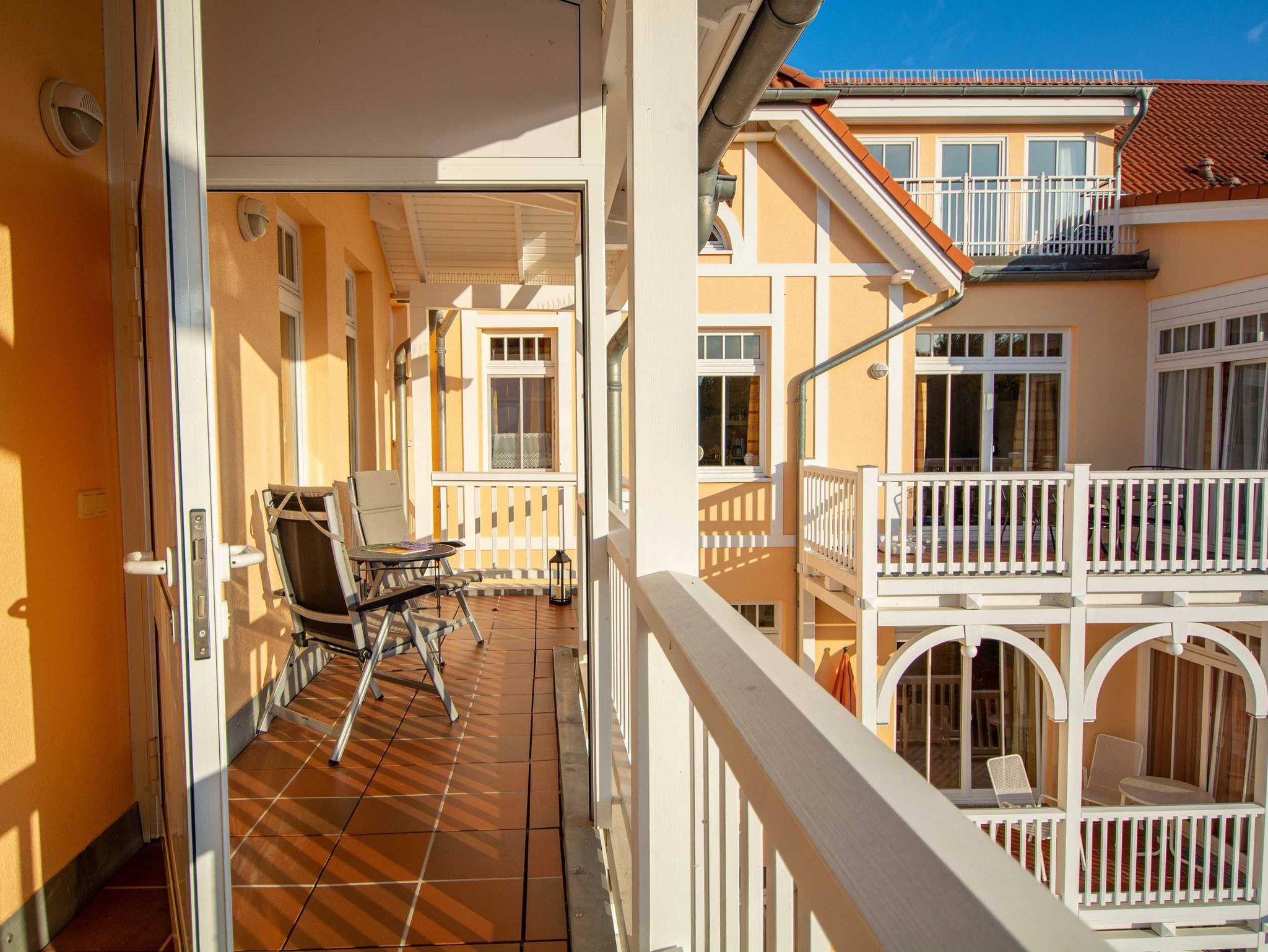 Das liebevoll eingerichtete 3-Raum-Appartement mit einer Gesamtfläche von 56 qm bietet Platz für 2 bis 4 Personen, befindet sich in der 3. Etage des Haupthauses und ist bequem über einen Fahrstuhl (Seiteneingang 1b) erreichbar. Es verfügt über einen Wohnbereich mit offener Küche (hier inklusive E-Herd mit Ceran-Kochfeld, Kühlschrank, Geschirrspüler, Dunstabzugshaube u.a.), ein Schlafzimmer mit Doppelbett, ein Schlafzimmer mit Tandembett, Sanitärbereich mit Badewanne und Duschmöglichkeit sowie je ein Balkon zur Ost- und Westseite. Zur Ausstattung gehört ein Flachbild-TV mit Radioempfangsteil. In den Allgemeinräumen des Hauses stehen Fahrradkeller, Münzwaschmaschine und -trockner zur Verfügung. Ein PKW-Stellplatz ist kostenfrei auf dem umzäunten Grundstück vorhanden. Die Benutzung des Schwimmbades sowie der beiden Saunen und der anderen Sport- und Fitnessräume ist inklusive!