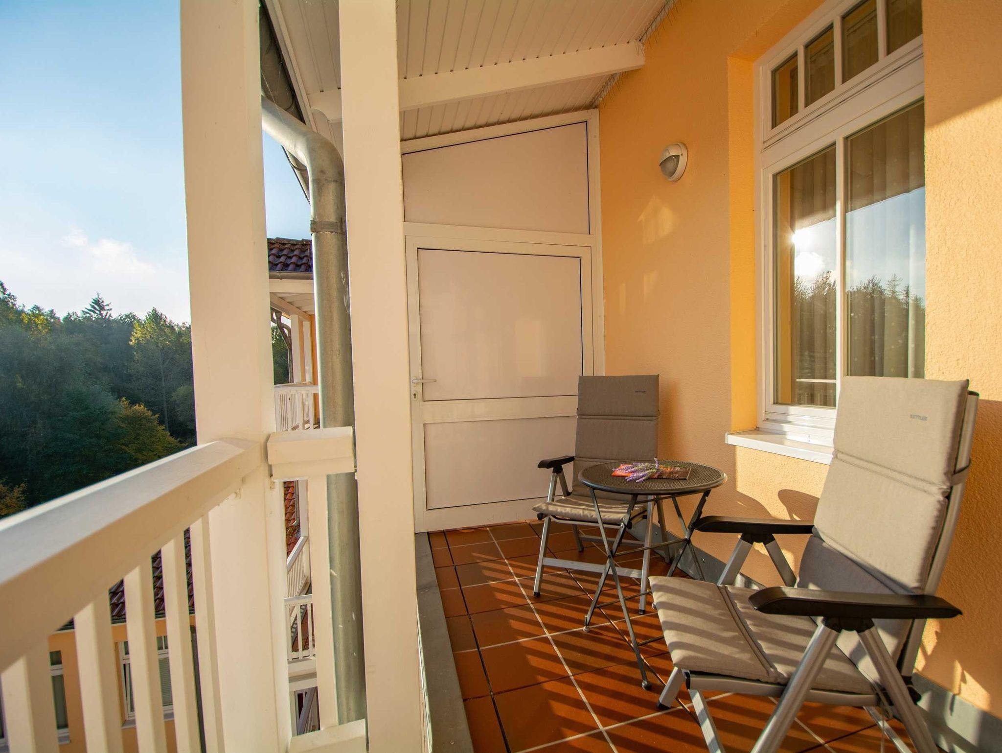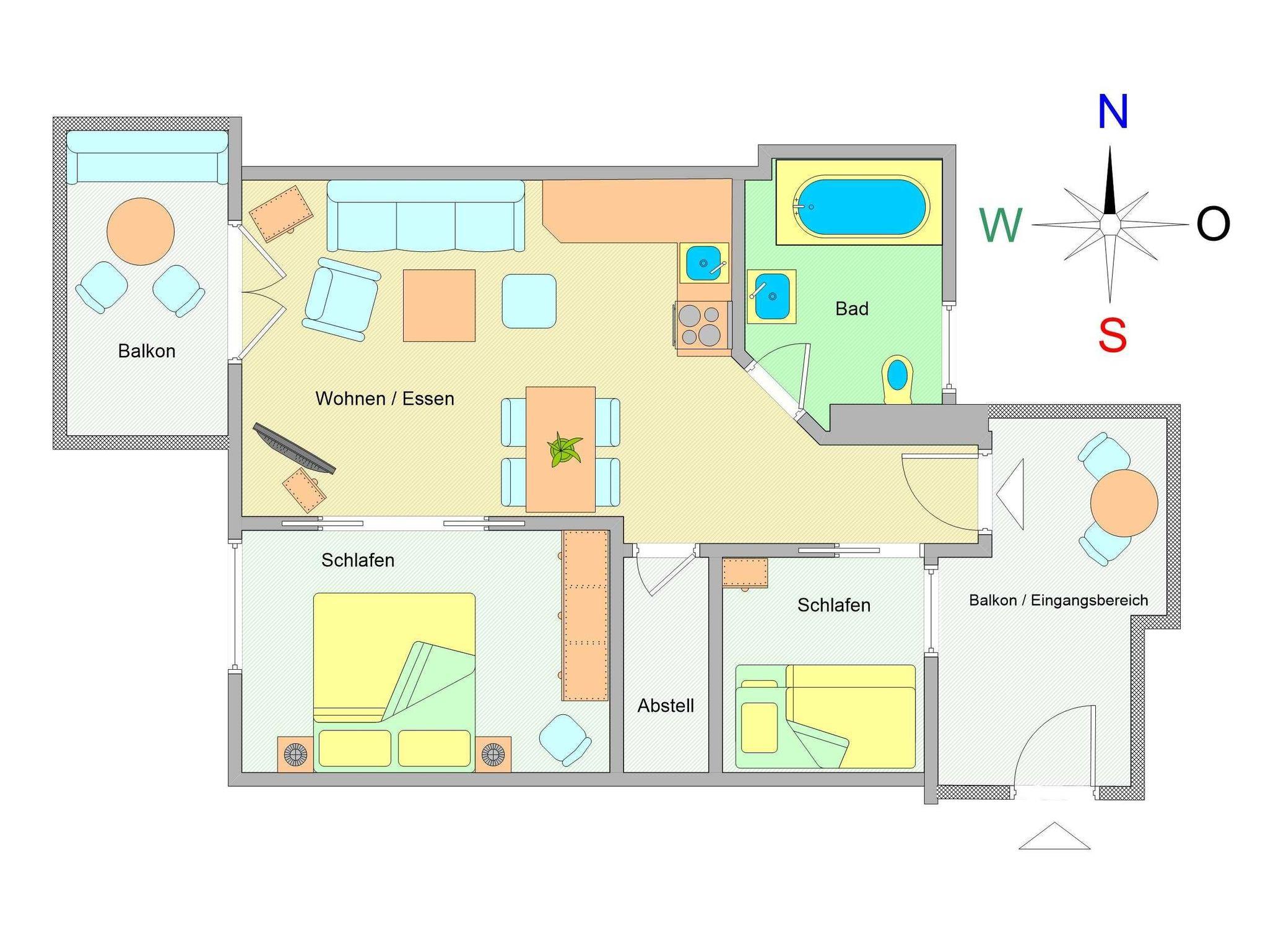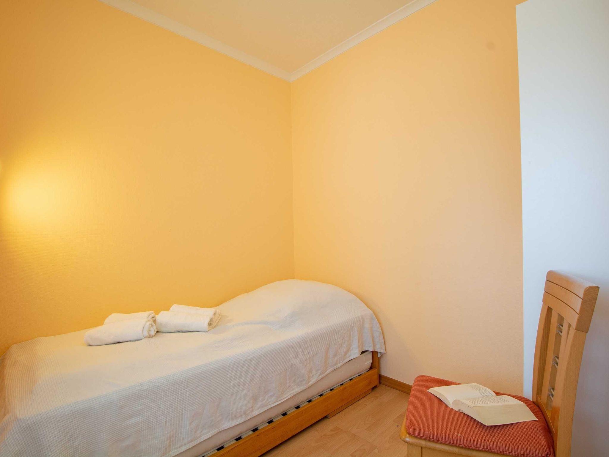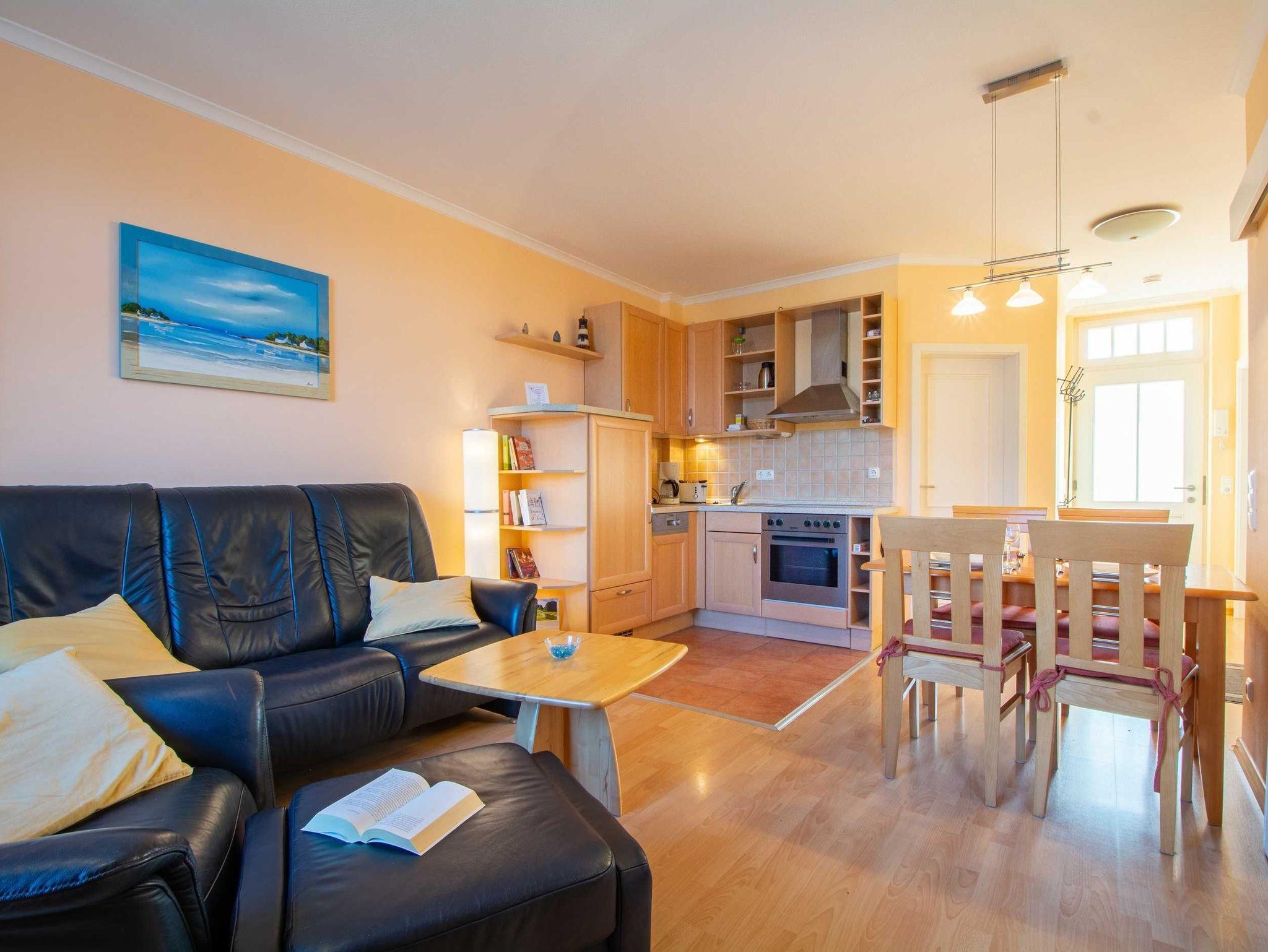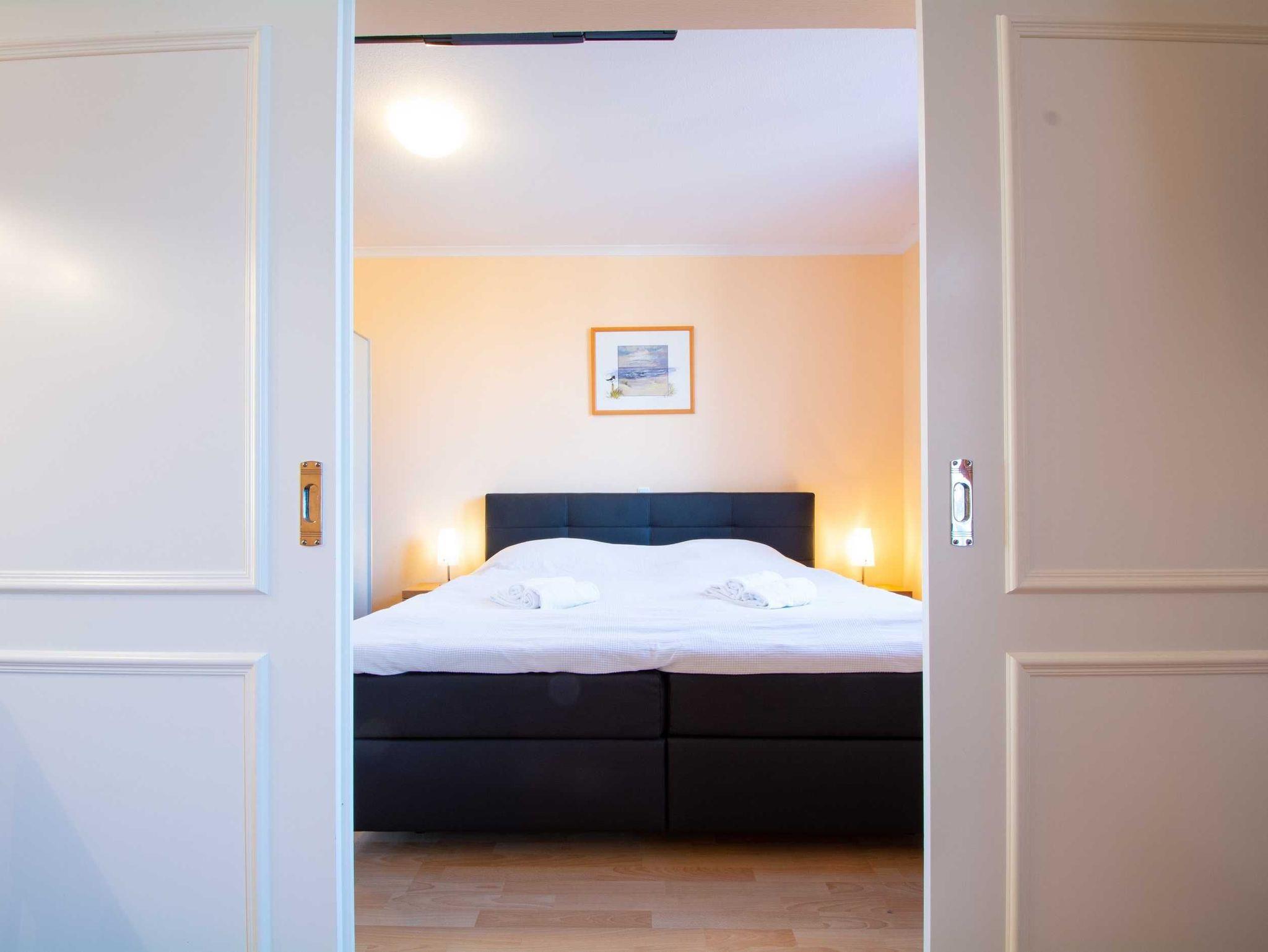Das liebevoll eingerichtete 3-Raum-Appartement mit einer Gesamtfläche von 56 qm bietet Platz für 2 bis 4 Personen, befindet sich in der 3. Etage des Haupthauses und ist bequem über einen Fahrstuhl (Seiteneingang 1b) erreichbar. Es verfügt über einen Wohnbereich mit offener Küche (hier inklusive E-Herd mit Ceran-Kochfeld, Kühlschrank, Geschirrspüler, Dunstabzugshaube u.a.), ein Schlafzimmer mit Doppelbett, ein Schlafzimmer mit Tandembett, Sanitärbereich mit Badewanne und Duschmöglichkeit sowie je ein Balkon zur Ost- und Westseite. Zur Ausstattung gehört ein Flachbild-TV mit Radioempfangsteil. In den Allgemeinräumen des Hauses stehen Fahrradkeller, Münzwaschmaschine und -trockner zur Verfügung. Ein PKW-Stellplatz ist kostenfrei auf dem umzäunten Grundstück vorhanden. Die Benutzung des Schwimmbades sowie der beiden Saunen und der anderen Sport- und Fitnessräume ist inklusive!