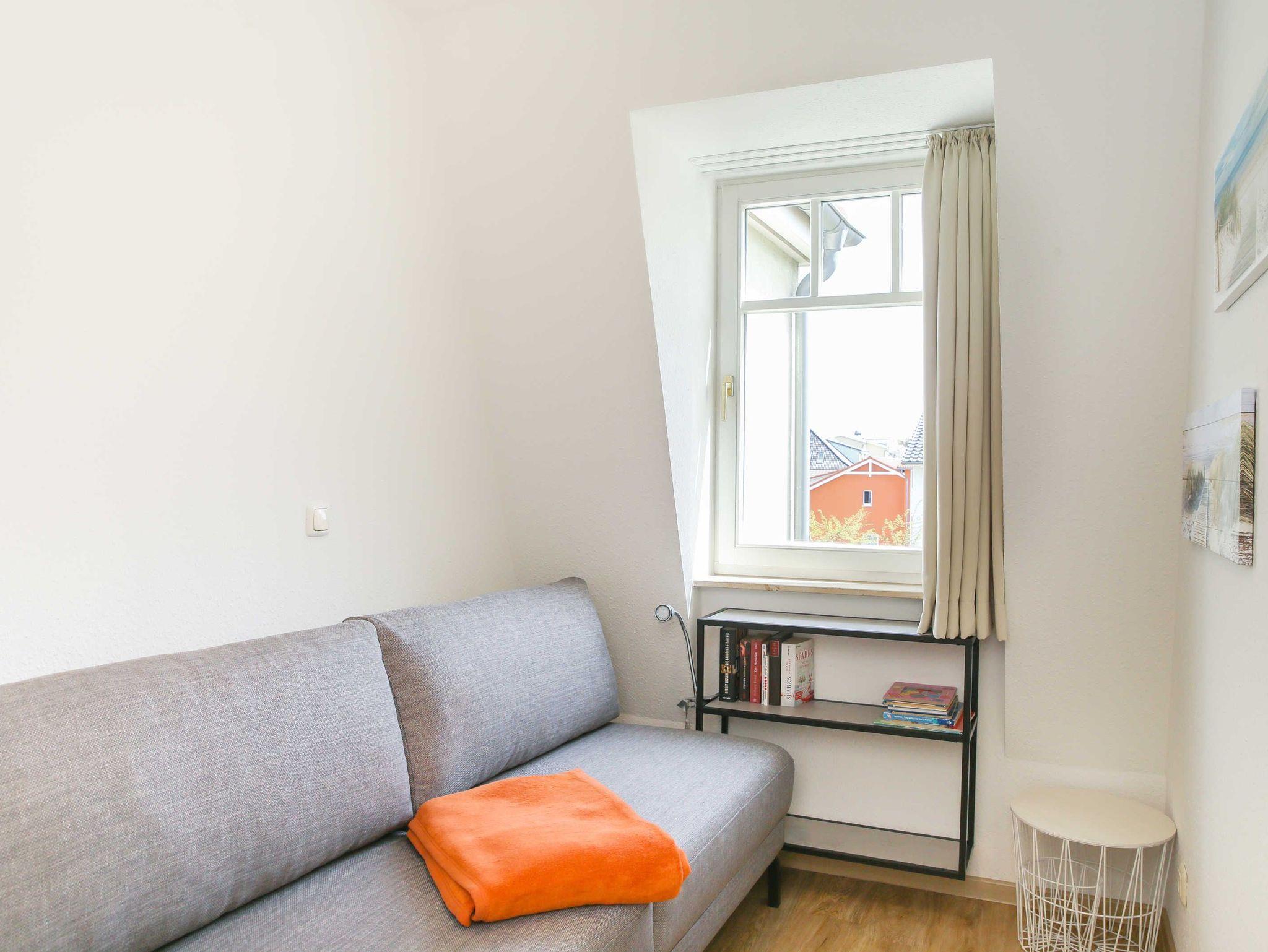 Die ca. 31 qm große Ferienwohnung liegt in der II. Etage hat neben dem Wohnzimmer noch ein Schlaf- und ein Gästezimmer, eine Küchenzeile sowie ein Duschbad und einen Balkon.