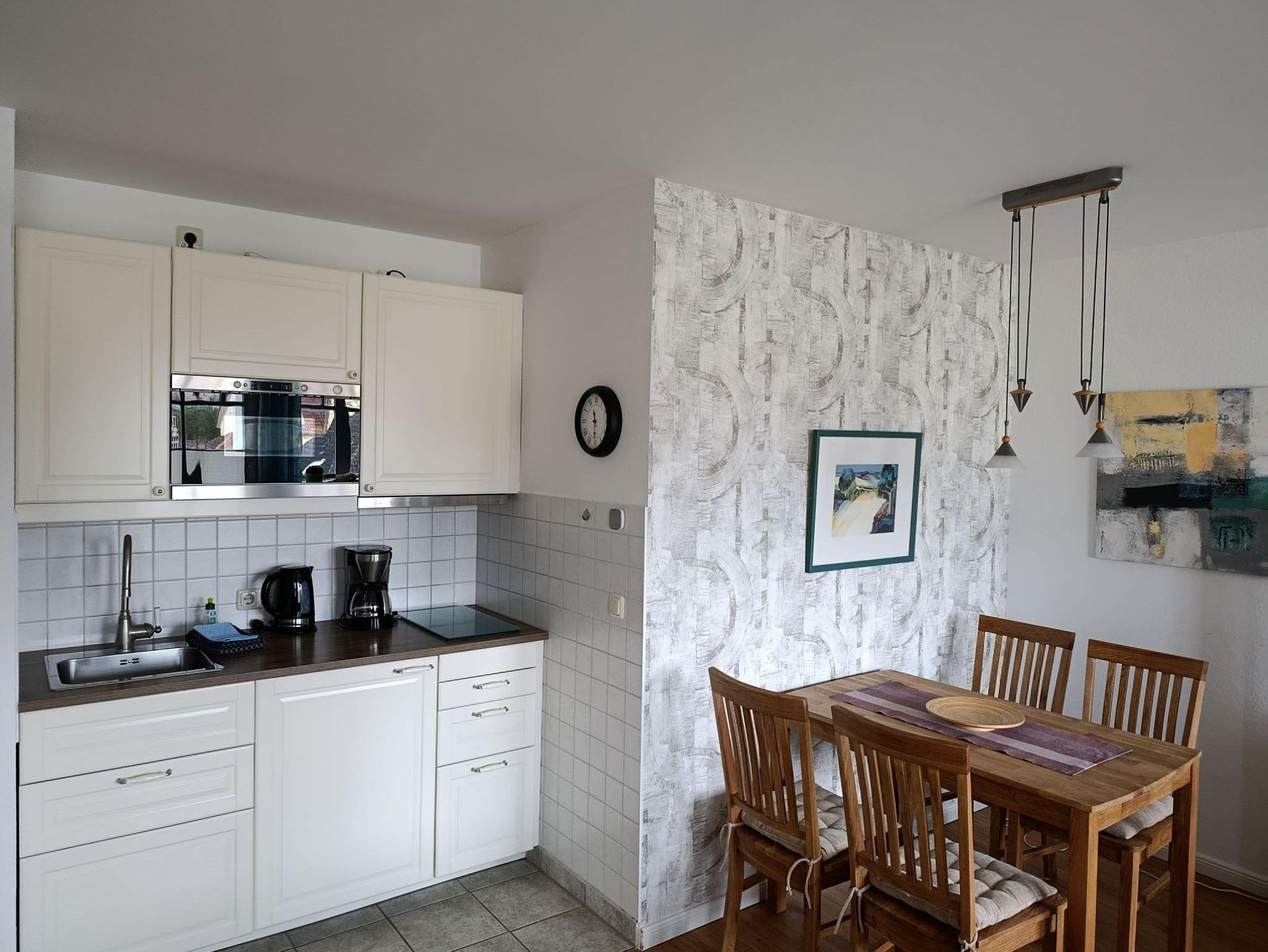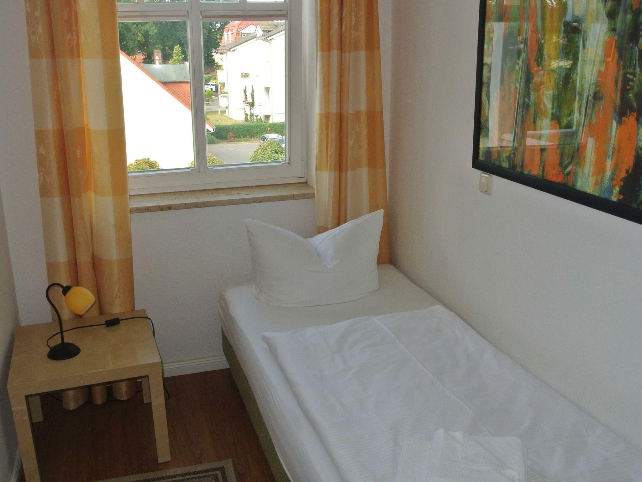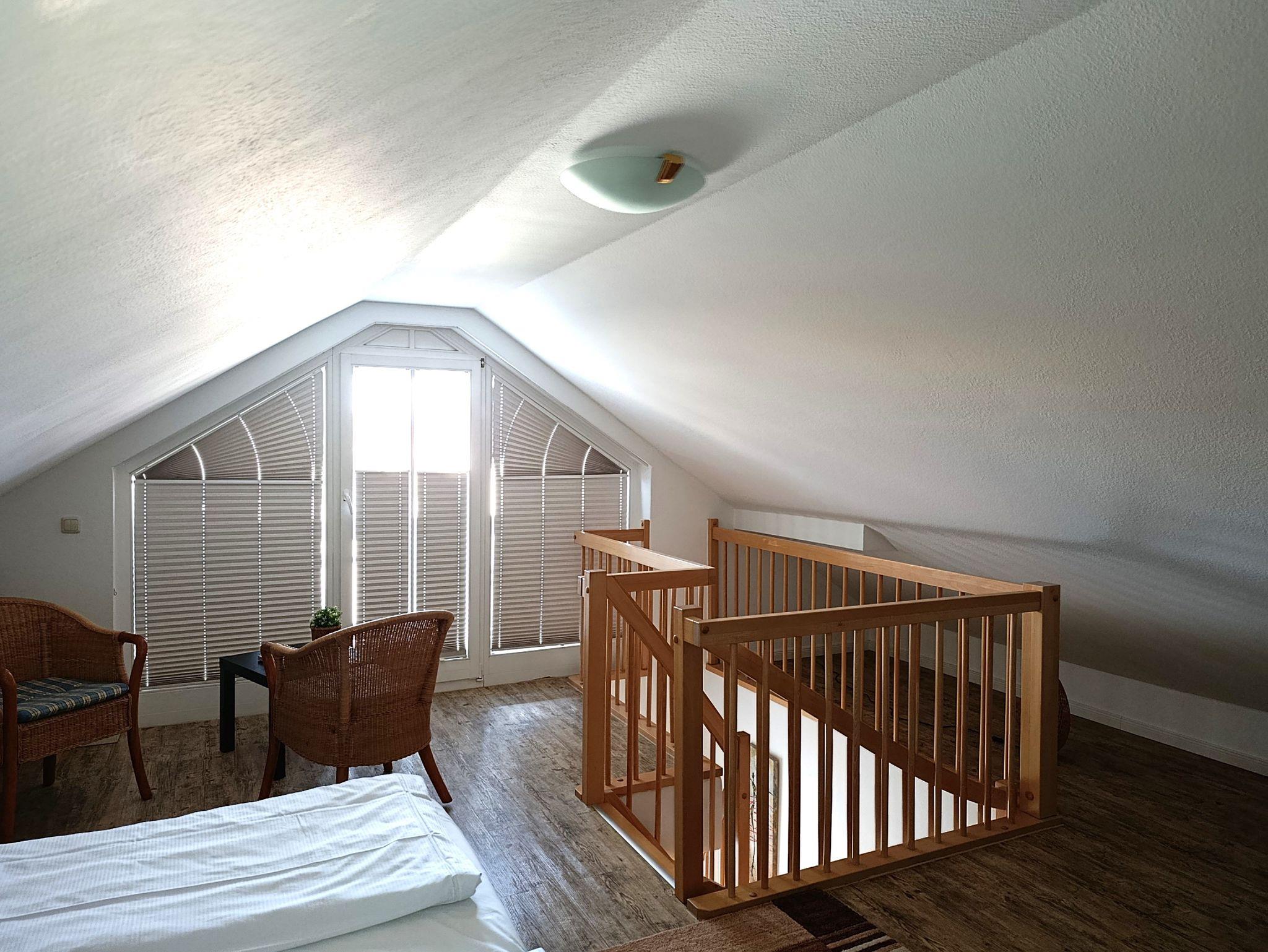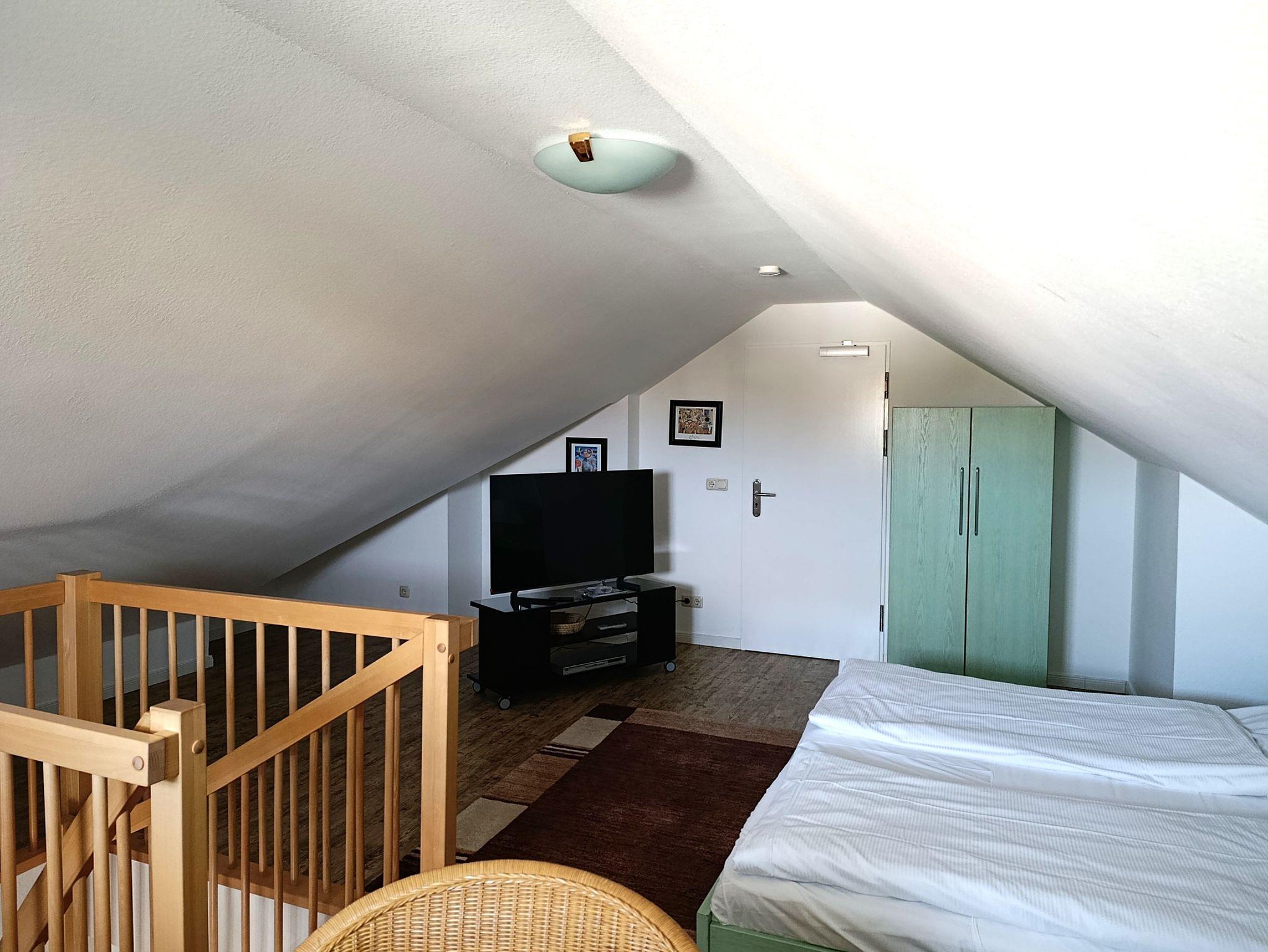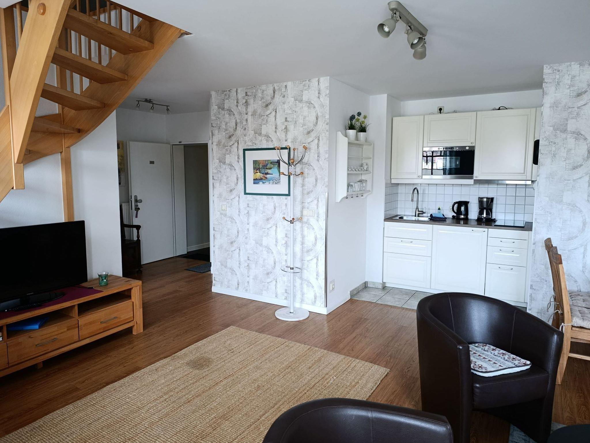 Die funktional gestaltete Ferienwohnung in der 2. Etage hat einen offenen Wohnbereich mit Küchenzeile und Essbereich, ein Schlafzimmer mit Doppelbett, FlachbildTV, Kleiderschrank und einer kleinen Sitzecke (über Treppe im Wohnbereich zu erreichen), ein Gästezimmer mit Einzelbett, Nachttisch und kleinen Kleiderschrank. Die funktionale Küchenzeile ist mit 2-Platten-Ceranfeld, Kühlschrank mit Gefrierfach, Mikrowelle, Kaffeemaschine, Wasserkocher, Toaster und div. Geschirr ausgestattet. Ein Bad mit Dusche, Waschbecken und WC komplettieren den guten Gesamteindruck der Wohnung.