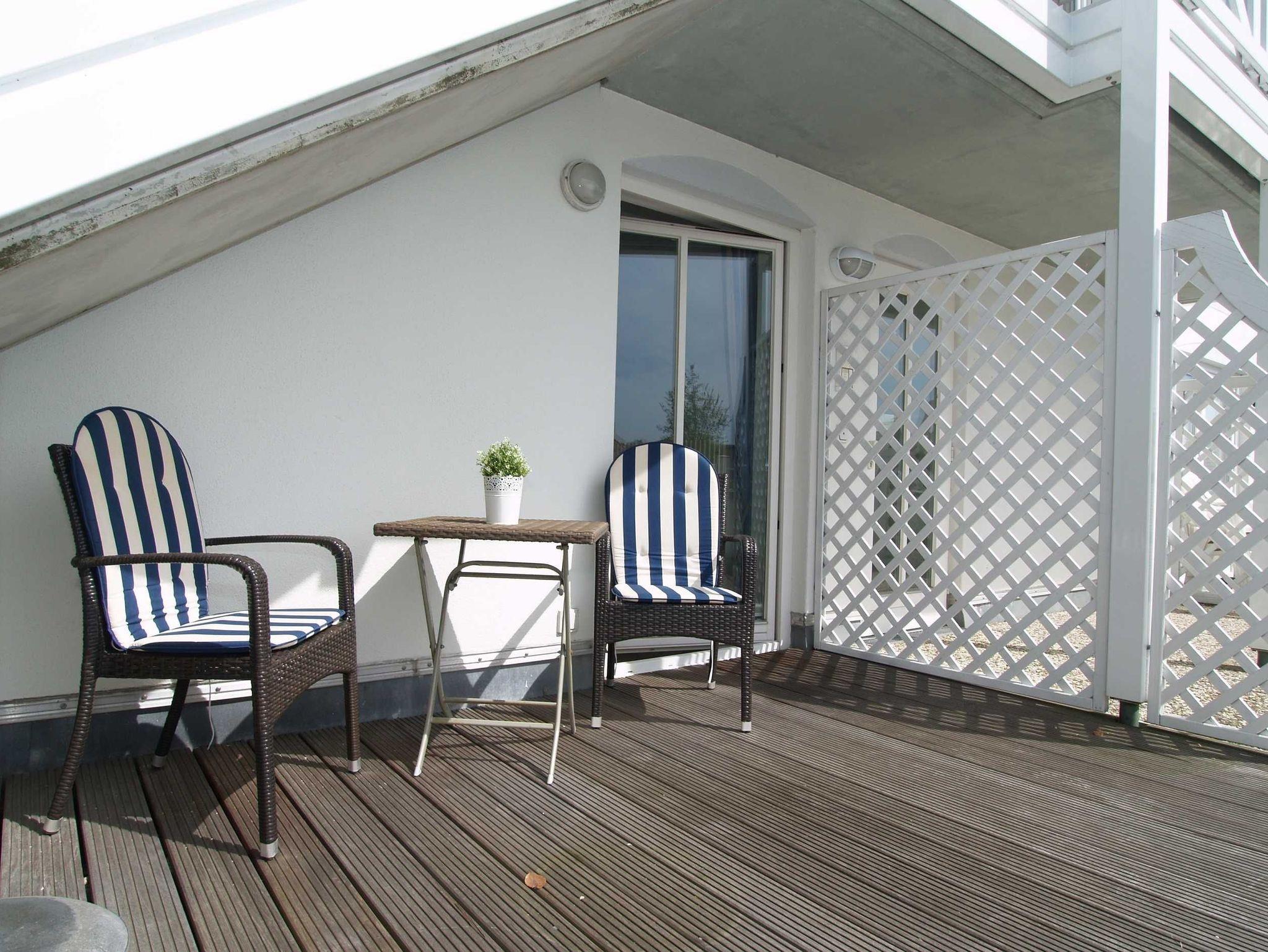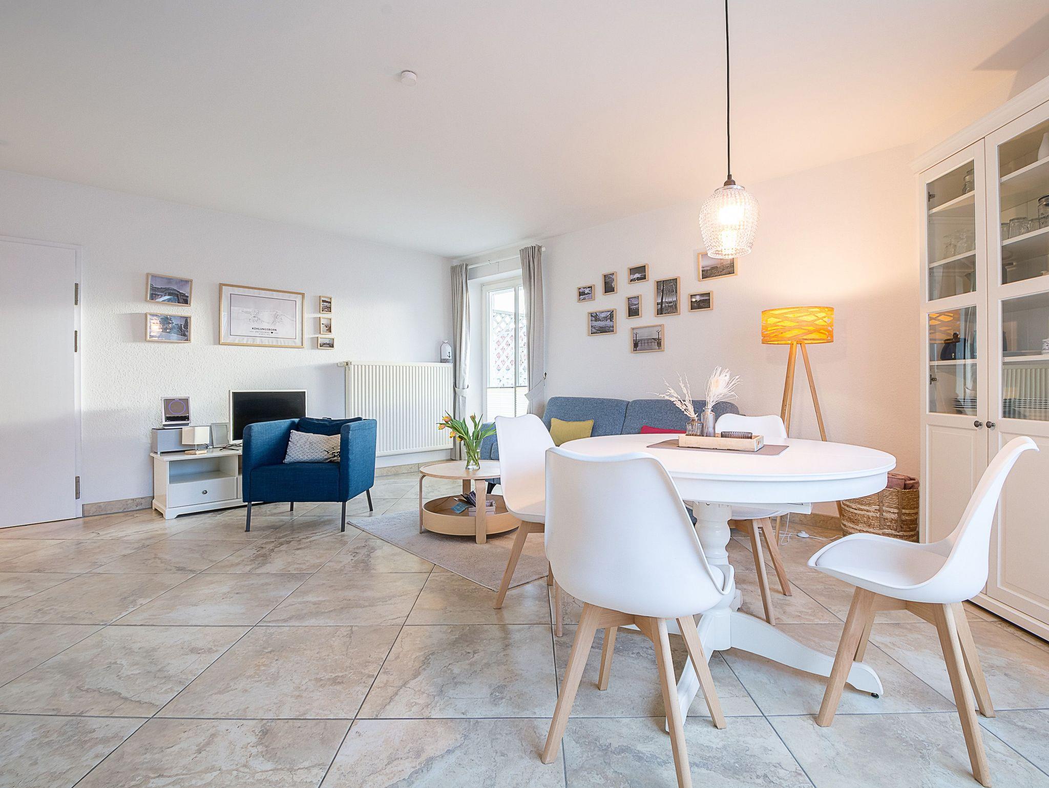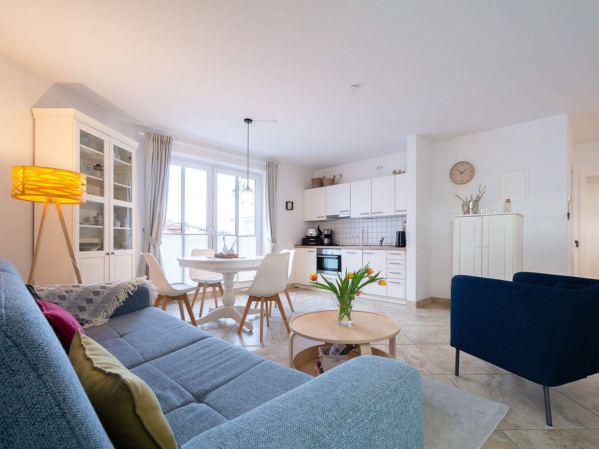 Der Wohnraum ist ausgestattet mit einer gemütlichen Couchgarnitur, 32-Zoll-Flatscreen-TV sowie einer Stereoanlage. Der angrenzende Essbereich bietet Ihnen reichlich Platz für gemeinsame Mahlzeiten. Vom Wohnraum aus erreichen Sie die nach Süden ausgerichtete Balkonterrasse. Hier können Sie Sonne tanken, relaxen und den Abend nach einem schönen Tag am Meer ausklingen lassen.