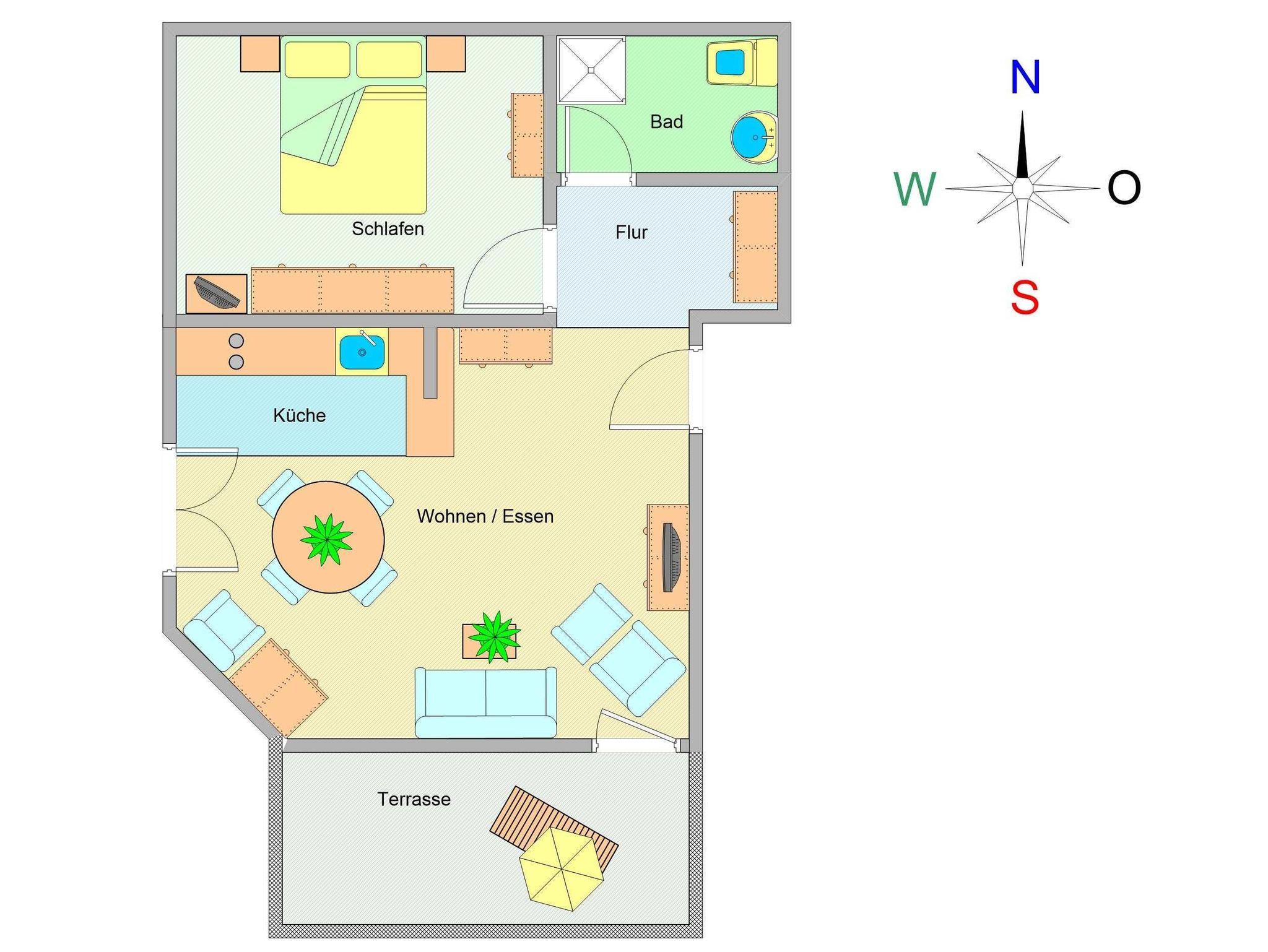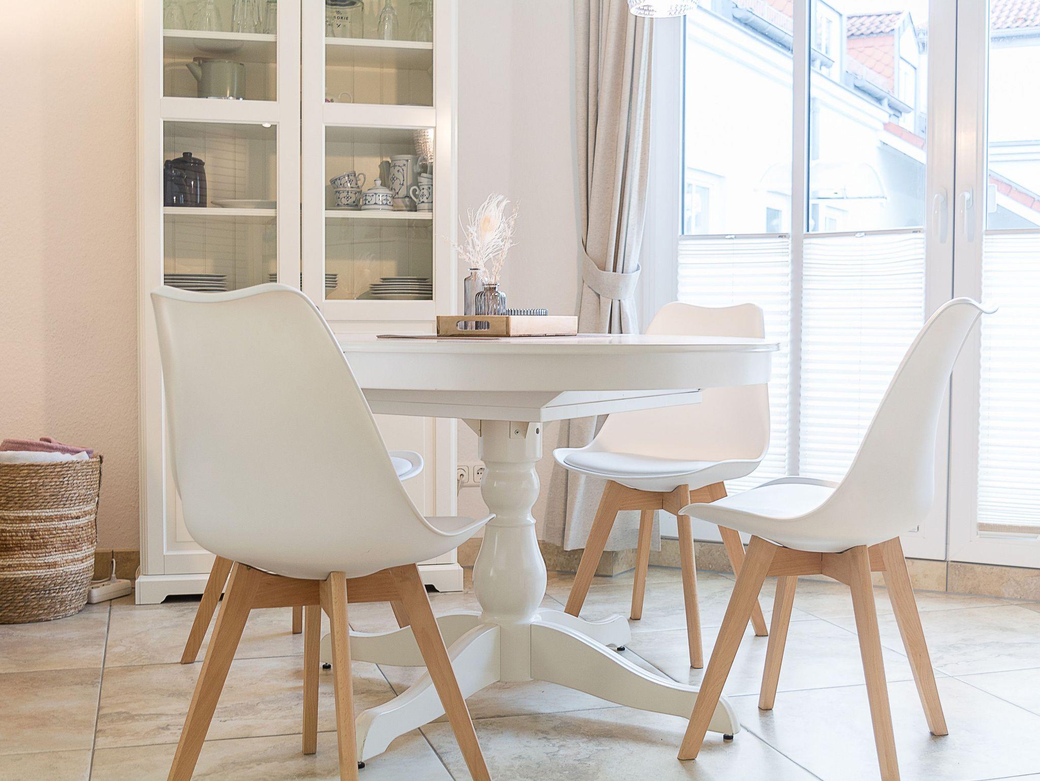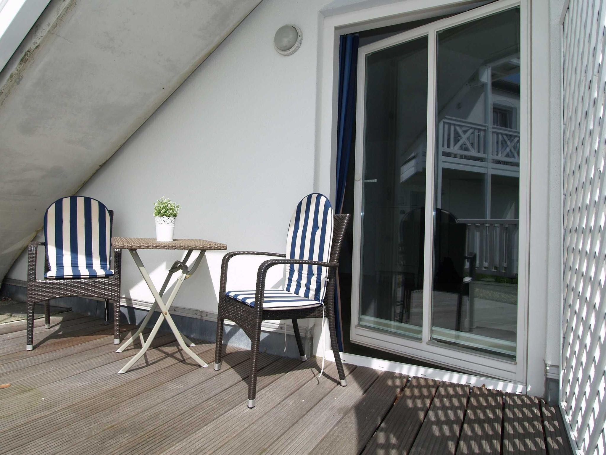 Der Wohnraum ist ausgestattet mit einer gemütlichen Couchgarnitur, 32-Zoll-Flatscreen-TV sowie einer Stereoanlage. Der angrenzende Essbereich bietet Ihnen reichlich Platz für gemeinsame Mahlzeiten. Vom Wohnraum aus erreichen Sie die nach Süden ausgerichtete Balkonterrasse. Hier können Sie Sonne tanken, relaxen und den Abend nach einem schönen Tag am Meer ausklingen lassen.