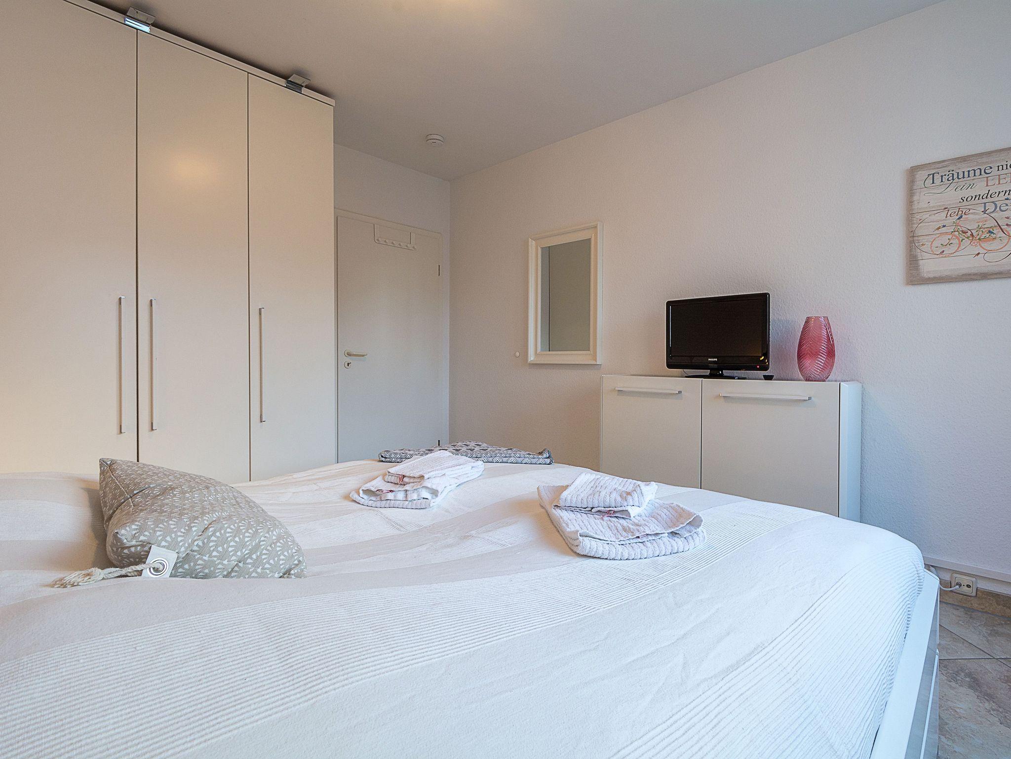 Im Schlafzimmer lädt Sie ein komfortables Doppelbett (2 x 90cm x 200 cm) zur Nachtruhe ein. Der geräumige Kleiderschrank bietet genügend Platz für Ihre Urlaubsgarderobe. Ein kleiner 22-Zoll-Fernseher befindet sich hier an der Wand. Das Bad mit Dusche und WC vervollständigt das Gesamtbild dieser Wohnung.