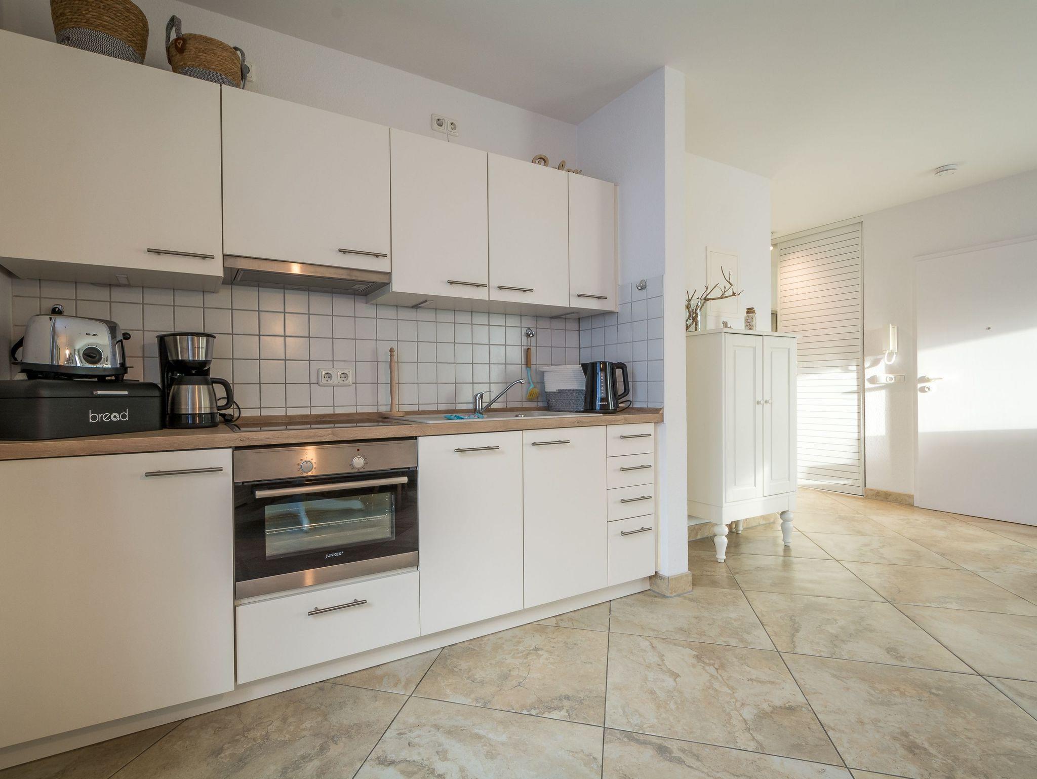 Die offene Küchenzeile im hält für Sie alle wichtigen Küchengeräte und -utensilien bereit, die Sie für Ihr perfektes Dinner benötigen: Ein 4-Zonen-Cerankochfeld mit Dunstabzug und Backofen, ein Geschirrspüler sowie ein Kühlschrank mit Gefrierfach befinden sich in der Küche. Eine Kaffeemaschine, ein Wasserkocher und ein Toaster sowie genügend Koch- und Essgeschirr vervollständigen die Kücheneinrichtung.