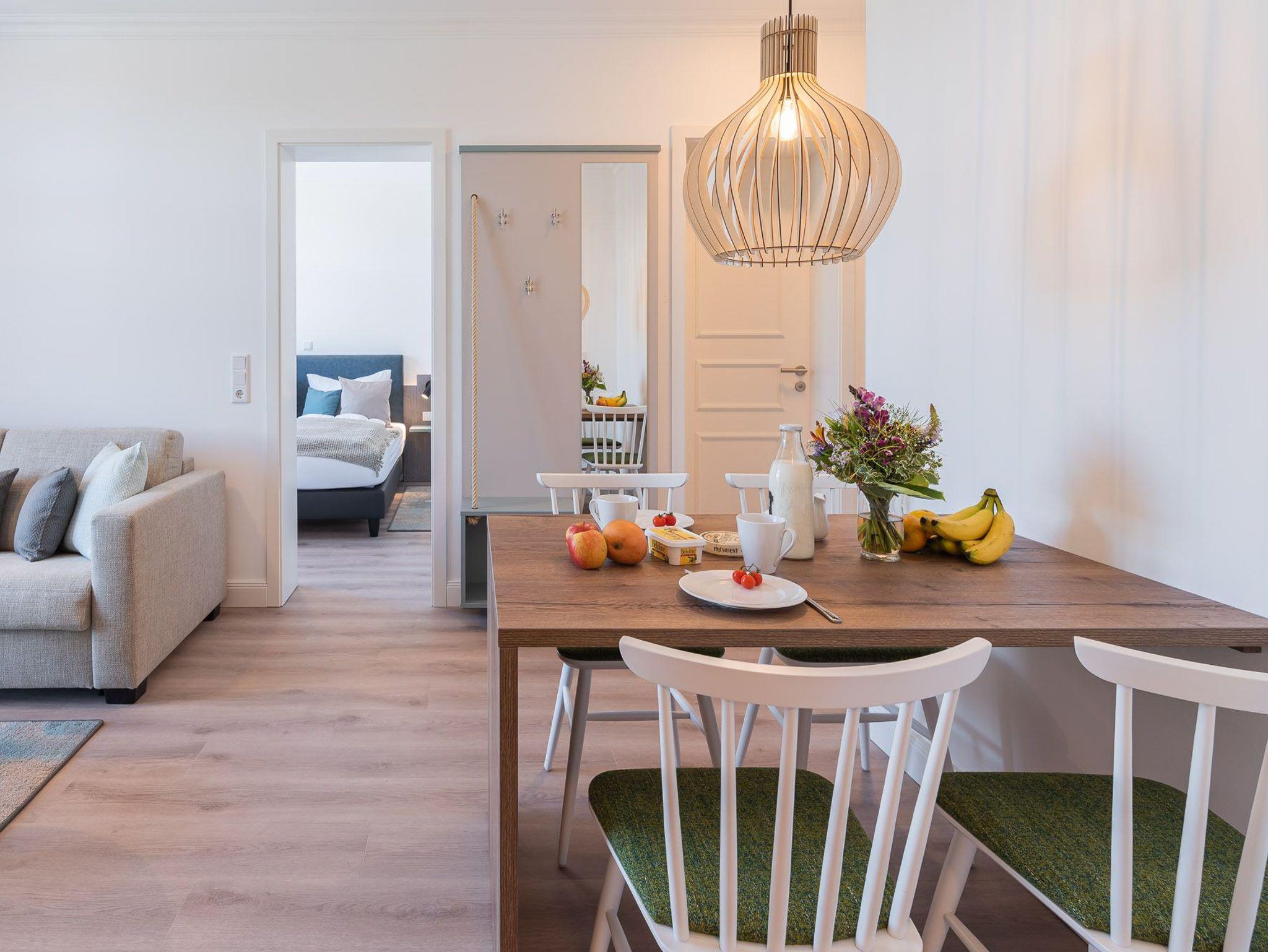 Das Bad verfügt über eine Dusche, einen Haartrockner, einen Handtuchtrockner und einen Kosmetikspiegel. Zu Ihrem Apartment gehört ebenfalls ein lichtdurchfluteter Wohn- und Essbereich mit offener Pantry-Küche. Das Sofa im Wohnbereich hat eine Schlaffunktion mit einer Liegefläche von 1,50 x 1,98 m.