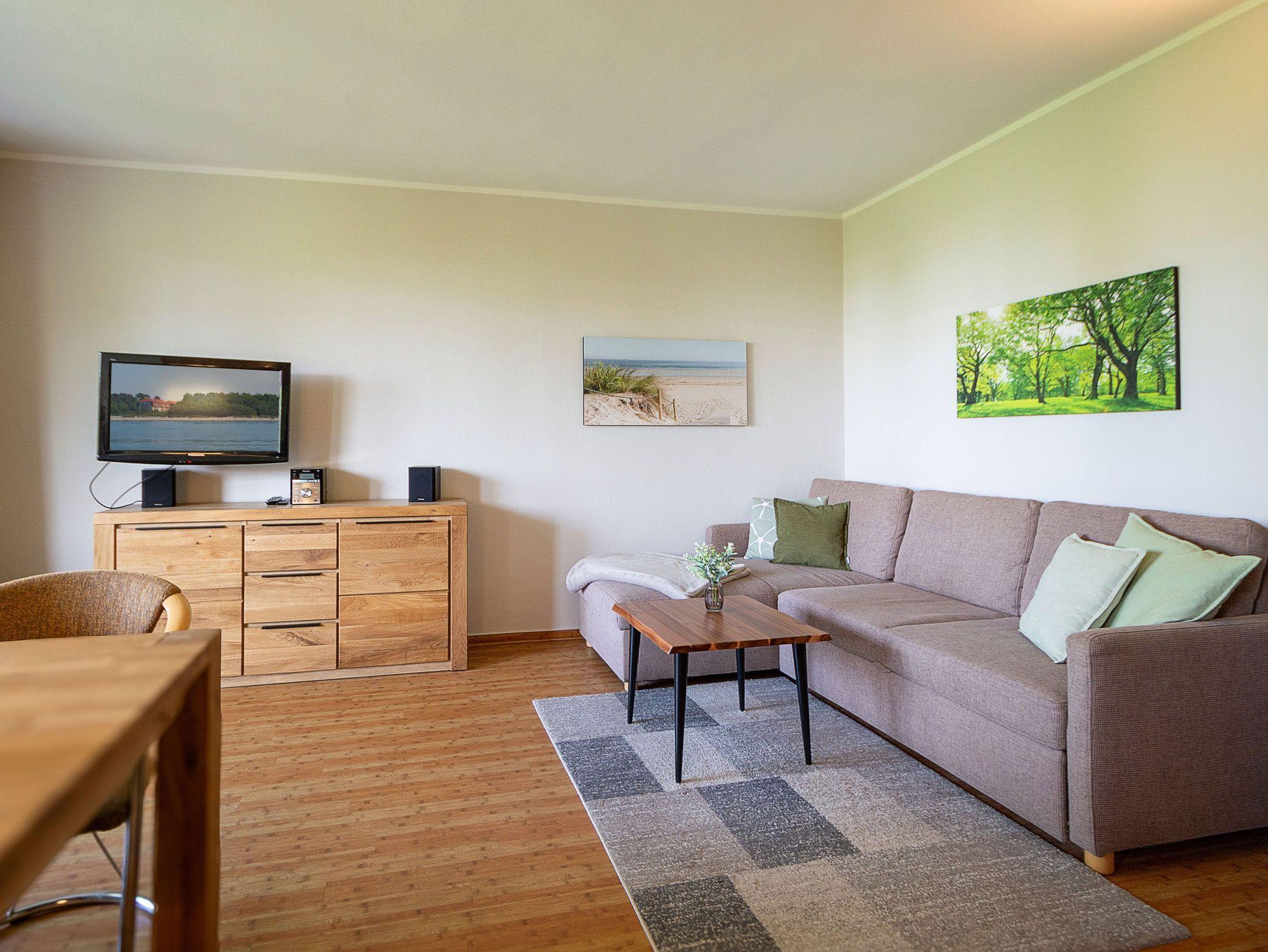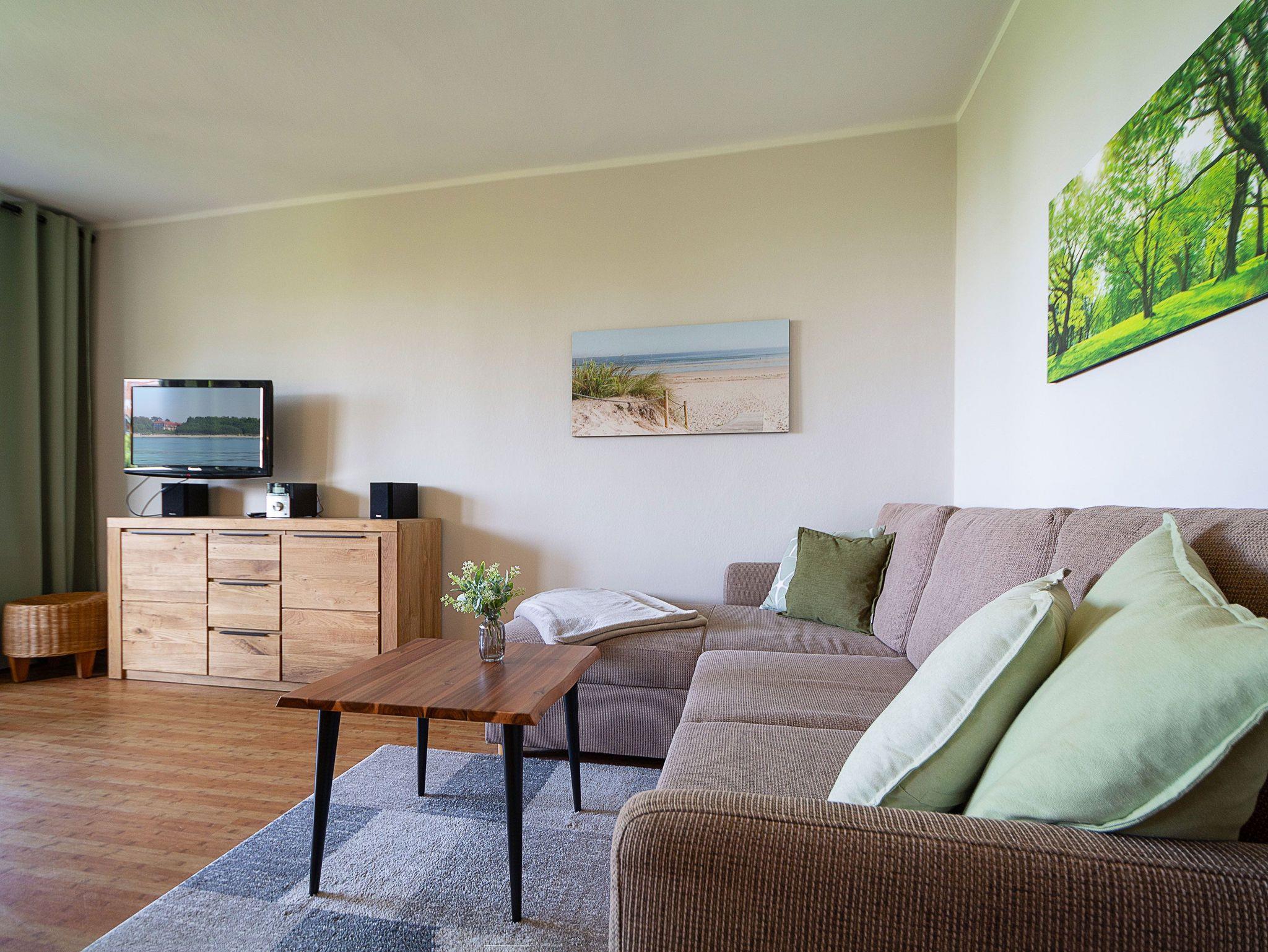 Der kombinierte Wohn- und Essbereich ist mit einer gemütlichen Schlafcouch (ausgezogen 150cm Breite) und einem 31-Zoll-TV sowie einer Radio/CD-Kompaktanlage inkl. DVD- und MP3-Player ausgestattet. Der angrenzende Essbereich bietet Ihnen reichlich Platz für gemeinsame Mahlzeiten. Die offene Küchenzeile hält für Sie alle wichtigen Küchengeräte und -utensilien bereit, die Sie für Ihr perfektes Dinner benötigen: Ein 4-Zonen-Cerankochfeld mit Dunstabzug, ein Backofen, ein Geschirrspüler, eine Mikrowelle sowie ein Kühlschrank mit Gefrierfach befinden sich in der Küche. Eine Kaffeemaschine, ein Wasserkocher und ein Toaster sowie genügend Koch- und Essgeschirr vervollständigen die Kücheneinrichtung.