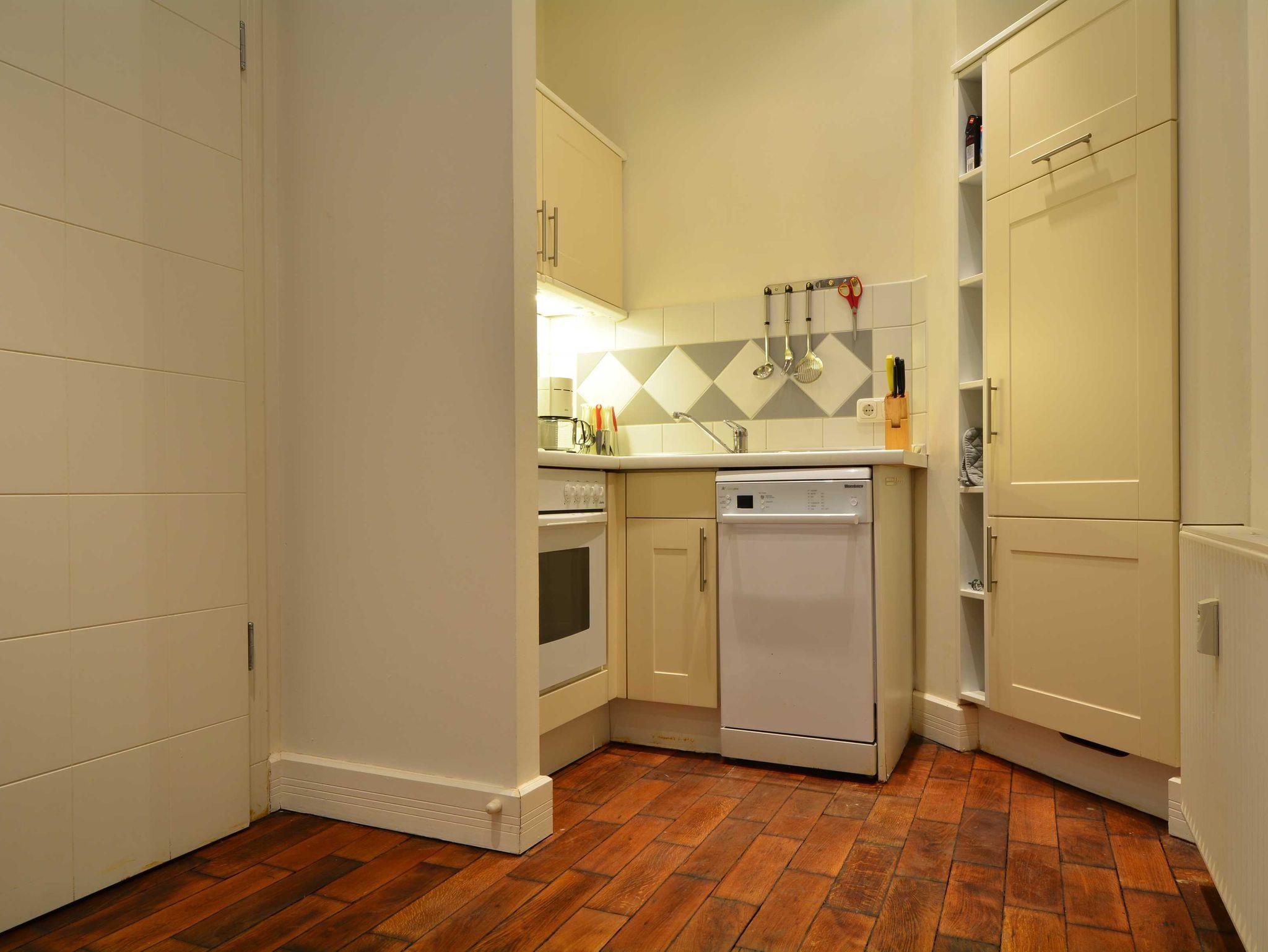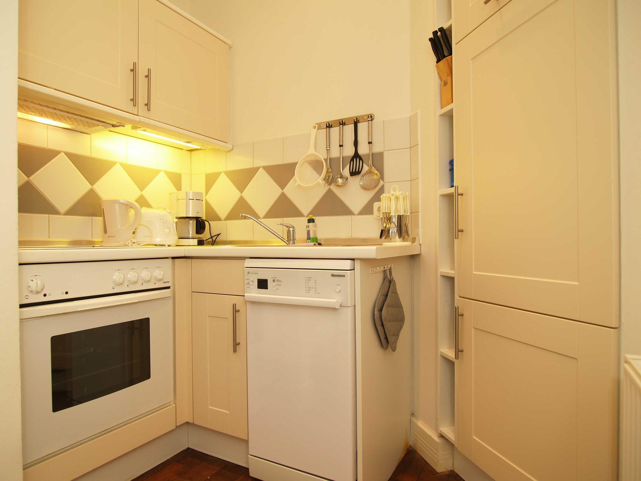 Die offene Küchenzeile befindet sich im Eingangsbereich in einer Nische. Sie bietet alle wichtigen Küchengeräte, die Sie für Ihren perfekten Urlaub an der Ostsee benötigen: Ein Backofen mit Dunstabzug und 4-Zonen-Ceranfeld, ein kleiner Geschirrspüler sowie ein Kühlschrank mit Gefrierfach befinden sich in der gut ausgestatteten Küche. Eine Kaffeemaschine, ein Wasserkocher, ein Toaster sowie genügend Geschirr und Kochutensilien komplettieren die Kücheneinrichtung.