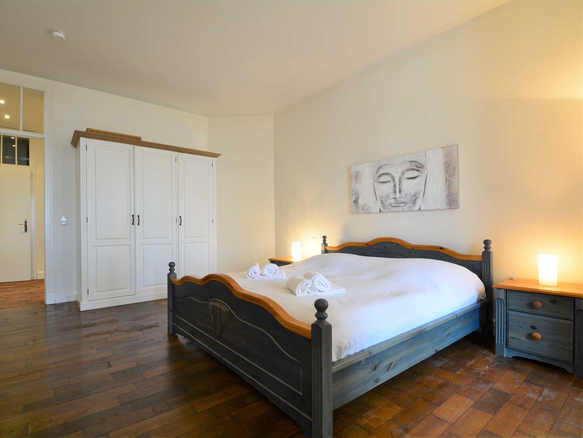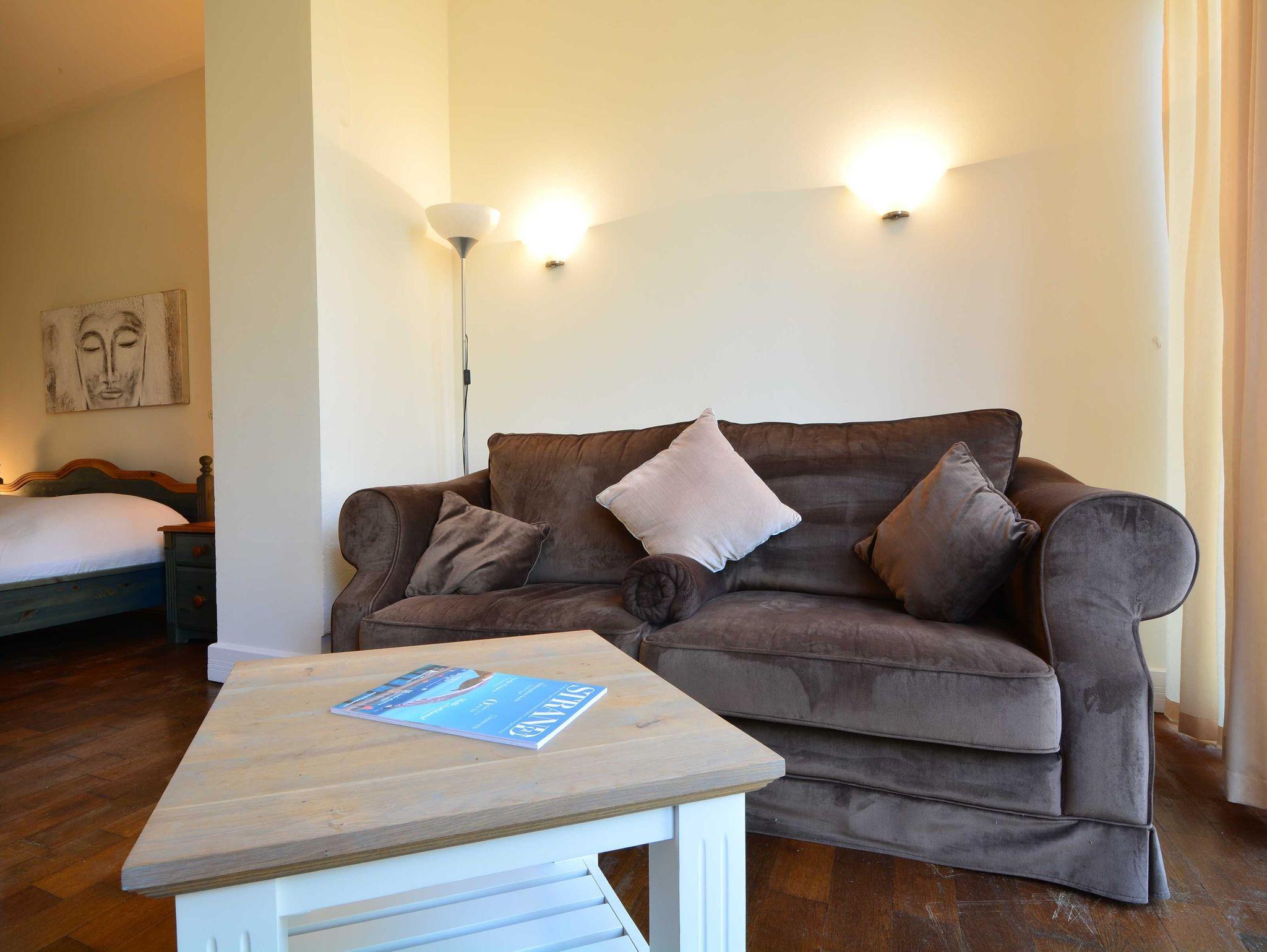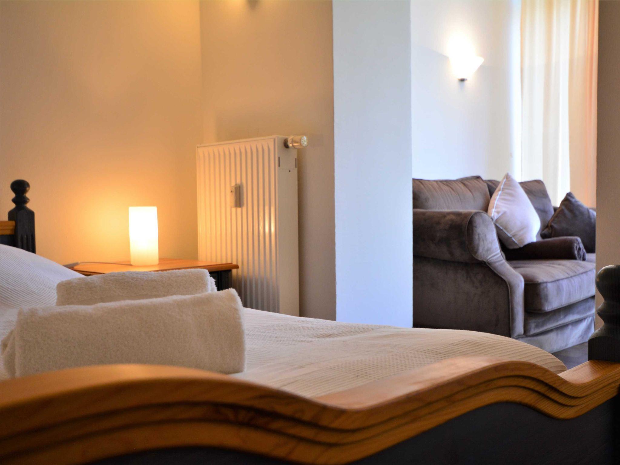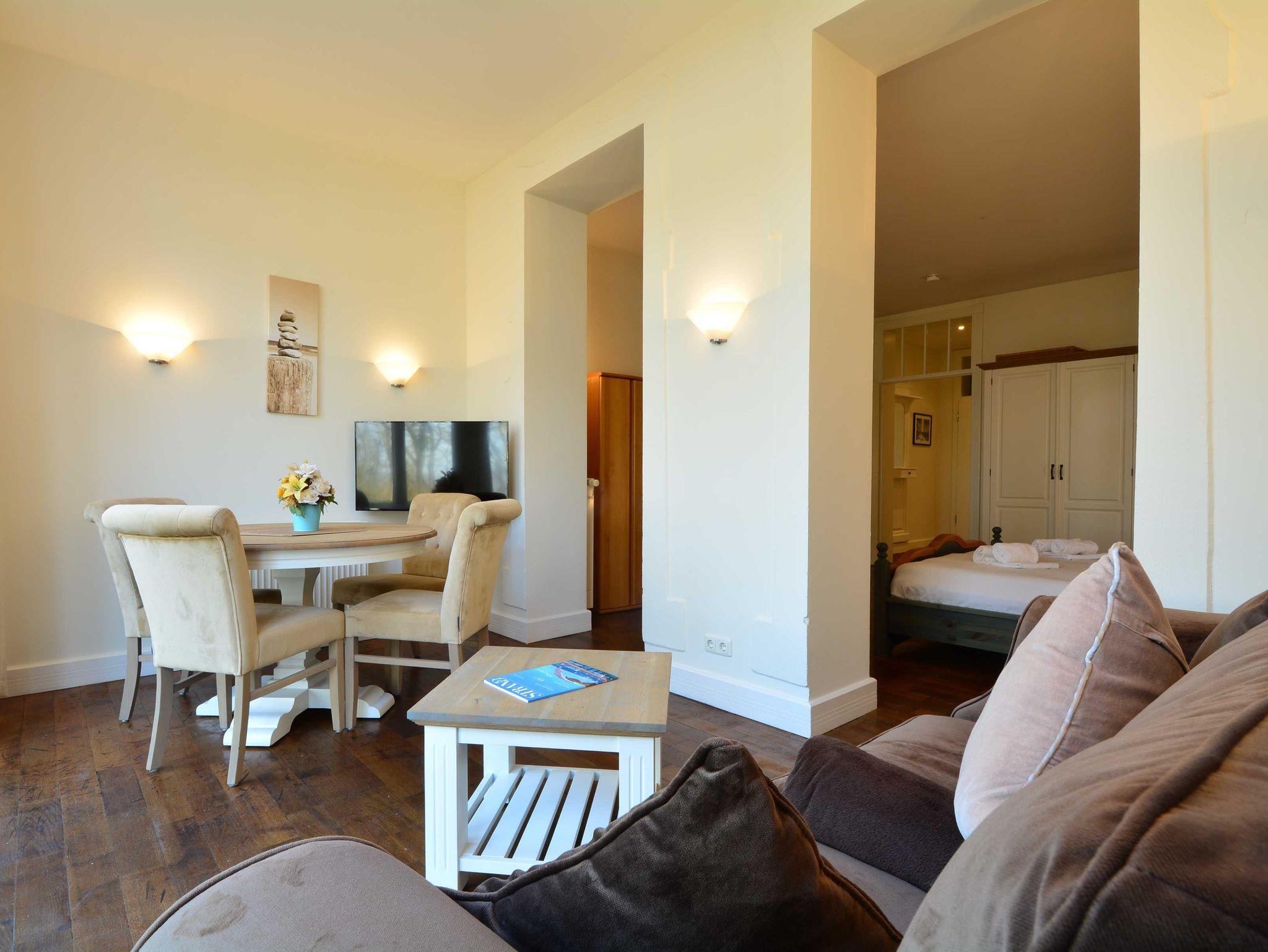 Der Wohn- und Essbereich ist am Fenster platziert und lädt mit einer gemütlichen Couch und einem Esstisch zum Verweilen ein. Von hier betreten Sie die möblierte Nord-Terrasse, die zum Verweilen und Sonnenbaden einlädt. Der Schlafbereich mit einem komfortablen Doppelbett schließt sich direkt an, wirkt jedoch angenehm abgetrennt. Die Aufteilung sorgt insgesamt für ein harmonisches und wohnliches Ambiente.