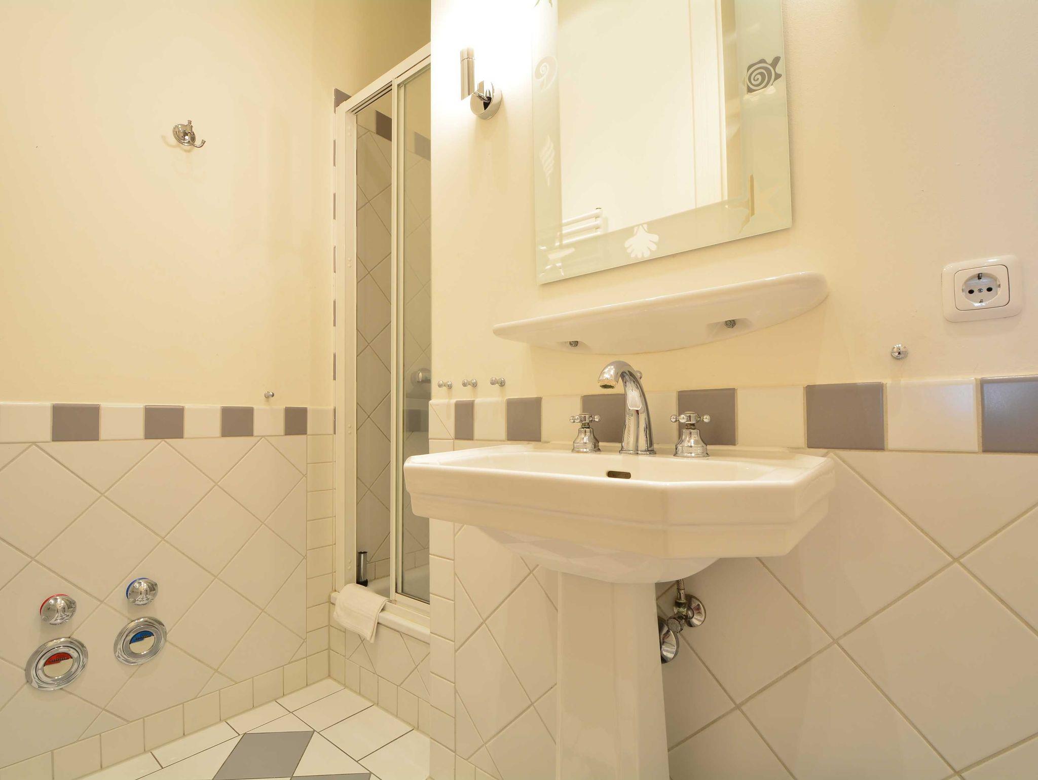 Das Bad mit Dusche und WC vervollständigt das Gesamtbild dieser Wohnung.