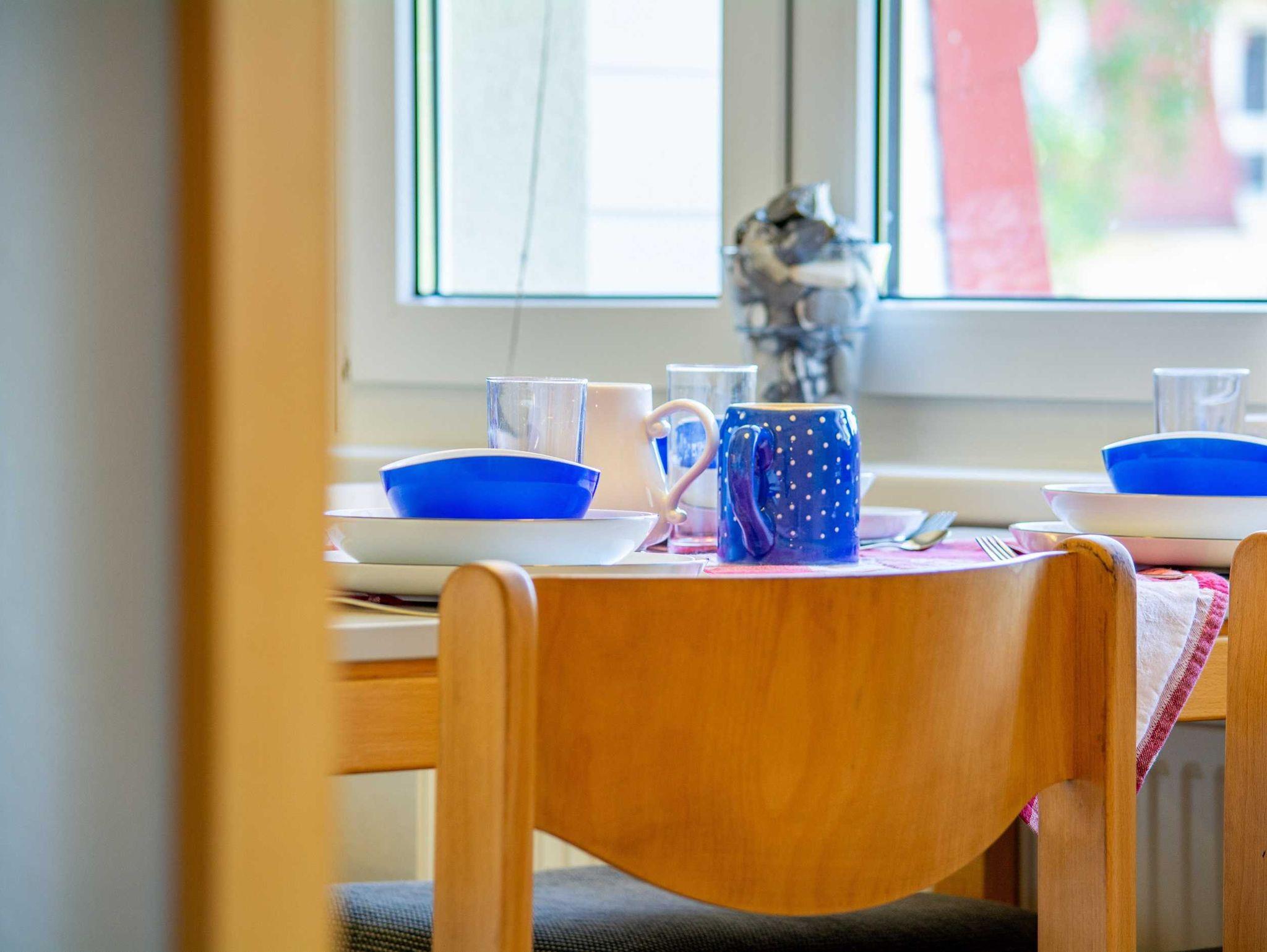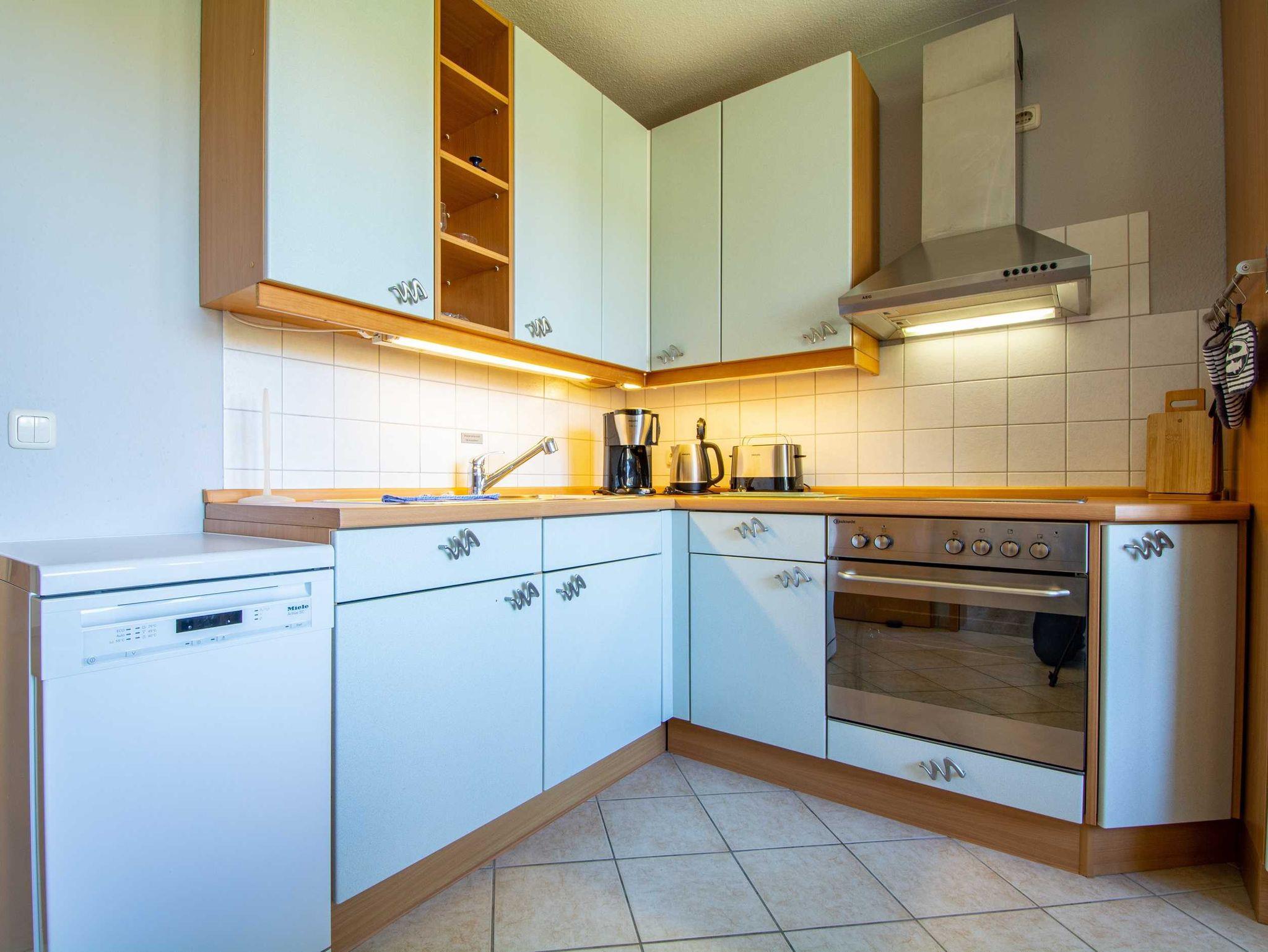 In der separaten Küche steht Ihnen alles zur Verfügung, was Sie zum Kochen und Genießen brauchen: ein 4-Zonen-Cerankochfeld mit Backofen, Mikrowelle, Kühlschrank, Kaffeemaschine, Wasserkocher, Toaster sowie ausreichend Koch- und Essgeschirr. Ein Esstisch bietet Platz für gemeinsame Mahlzeiten mit Familie oder Freunden.