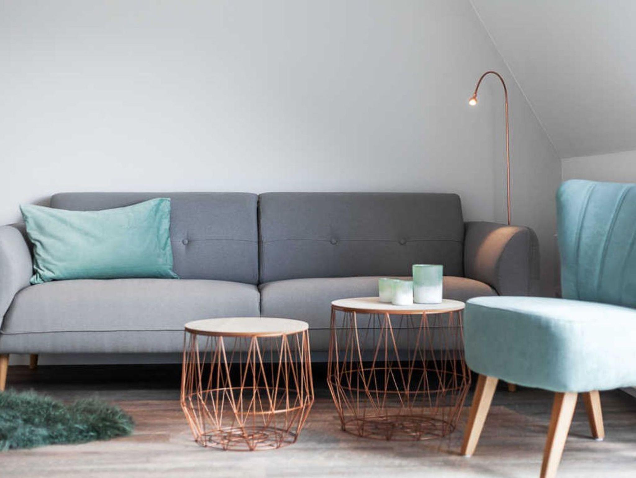 Wohnzimmer mit Couch, Esstisch, Küchenzeile, Kabel-TV, Radio und passwortgeschütztes WLan
