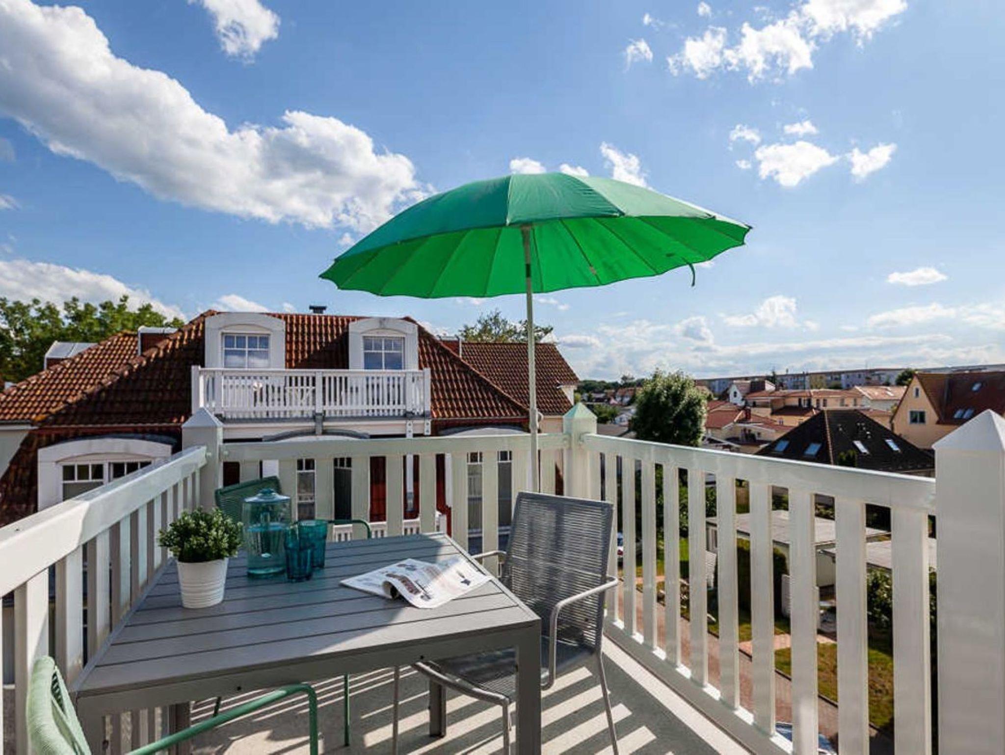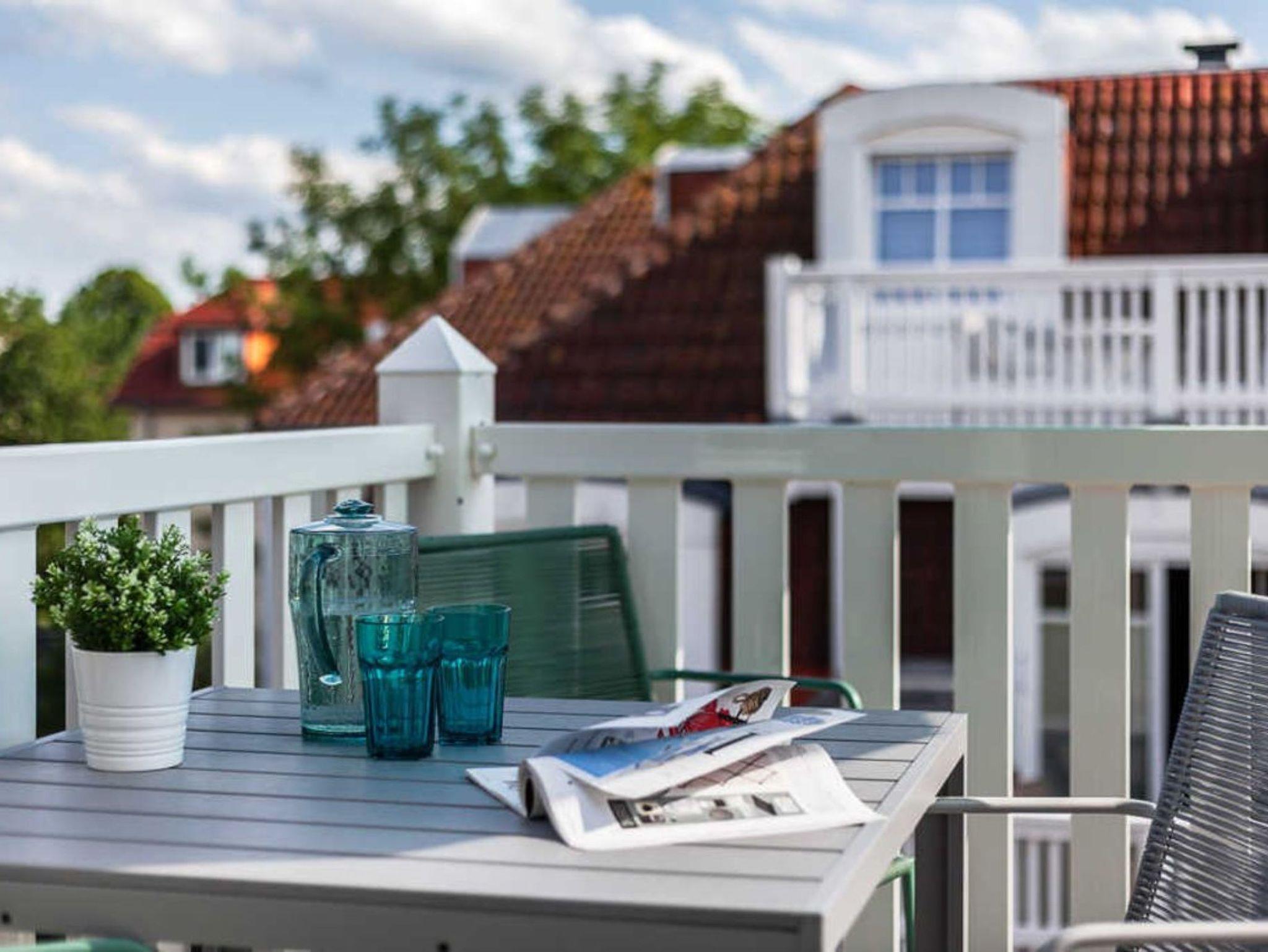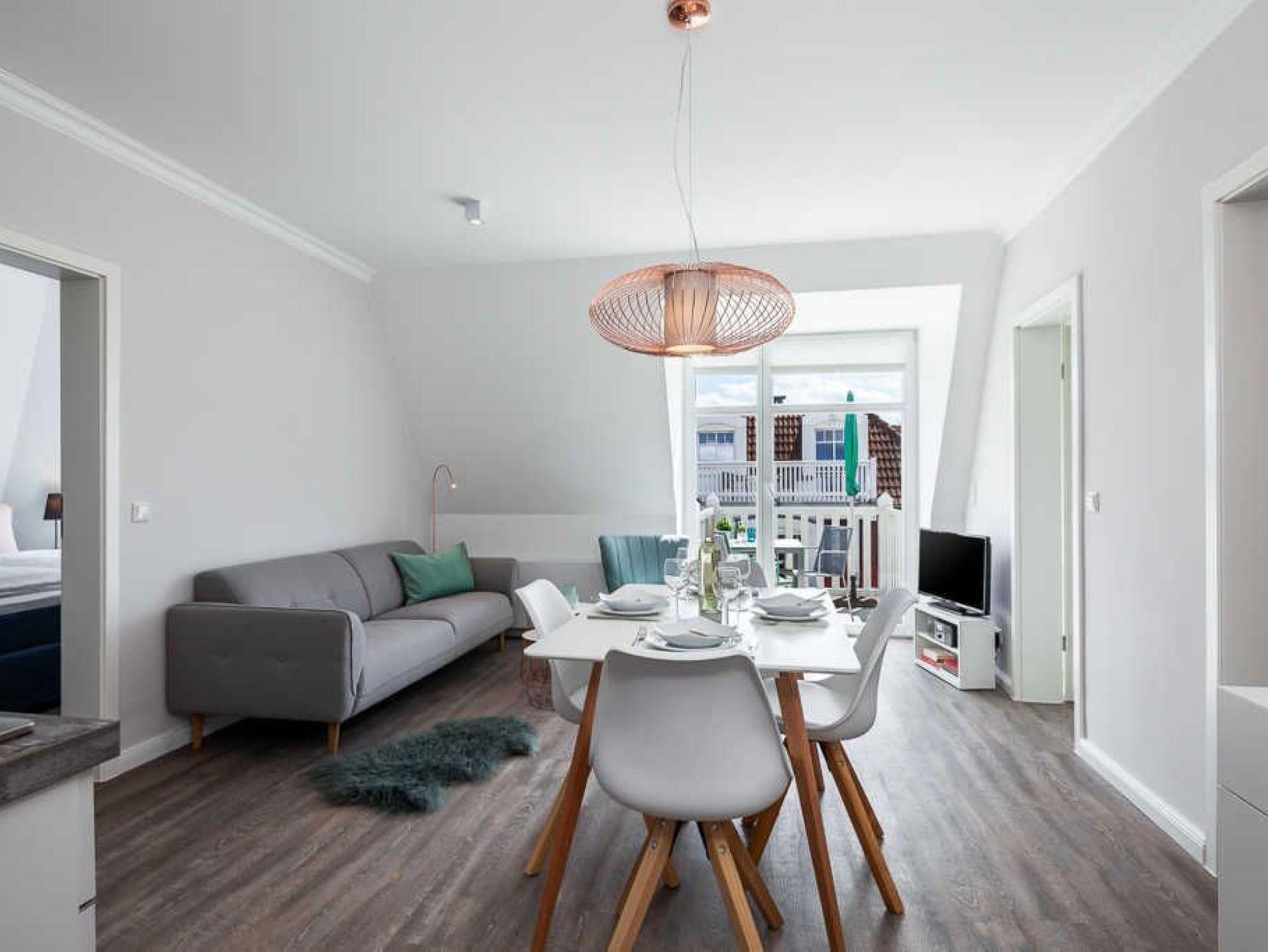 Nur 150 m vom Strand wohnen Sie in einer 3-Raum-Ferienwohnung. Die 42 qm große Wohnung liegt in der 2. Etage. Das Wohnzimmer ist mit einer Couch, Couchtisch, Sessel, Anrichte, mit Kabel-TV, Radio, Essbereich (Tisch und Stühle) und Küchenzeile ausgestattet. Der Balkon mit Tisch und Stühle geht zur Südseite. Im Schlafzimmer stehen ein Doppelbett und ein Kleiderschrank. Die Küchenzeile wurde ausgestattet mit Mikrowelle, Kühlschrank, Kaffeemaschine, Ceran-Kochfeld, Geschirrspüler, Toaster und Wasserkocher. Das Bad mit Dusche und WC komplettiert die Wohnung.