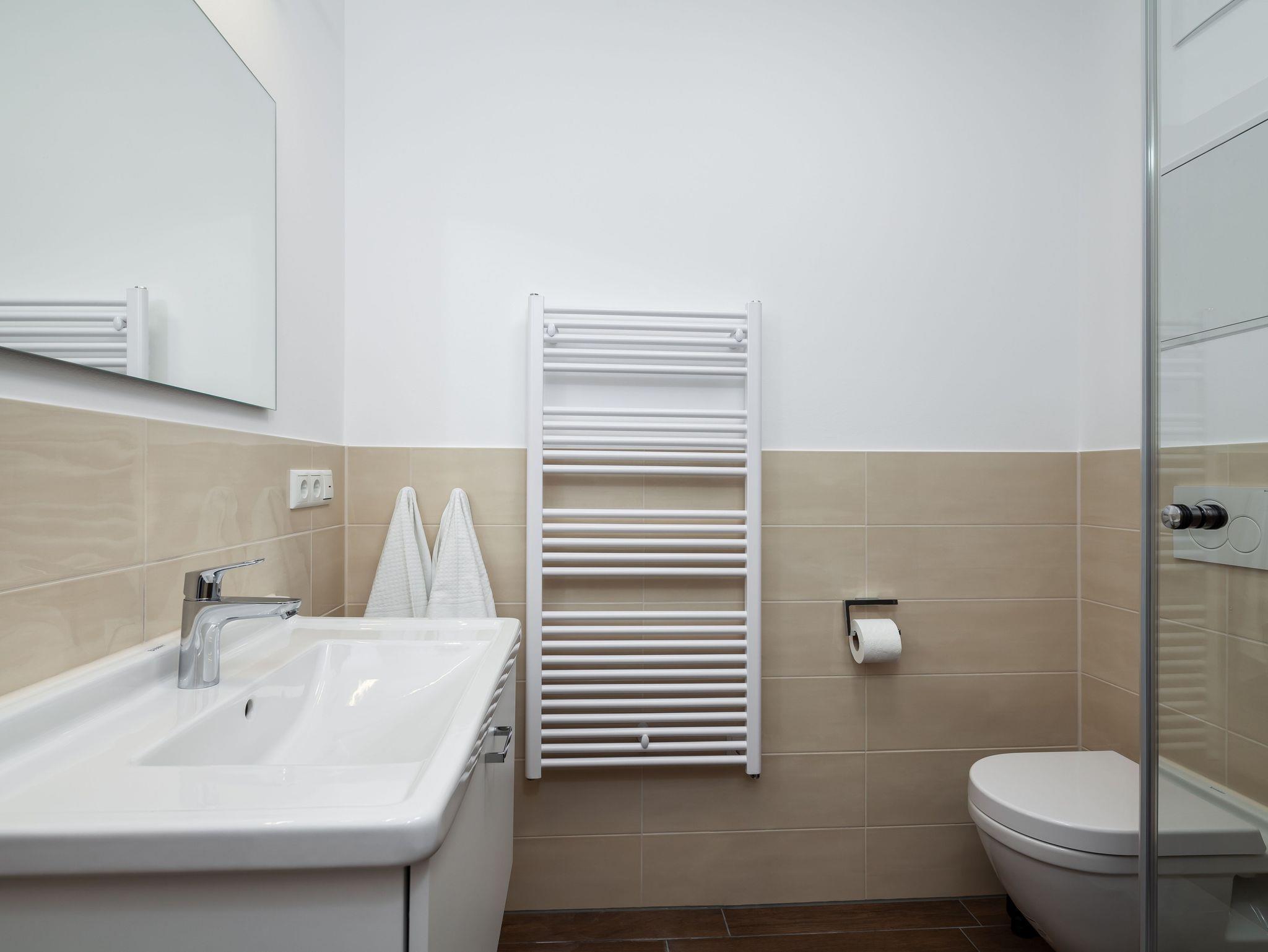 I. Badezimmer mit ebenerdiger Dusche, WC und Anrichte