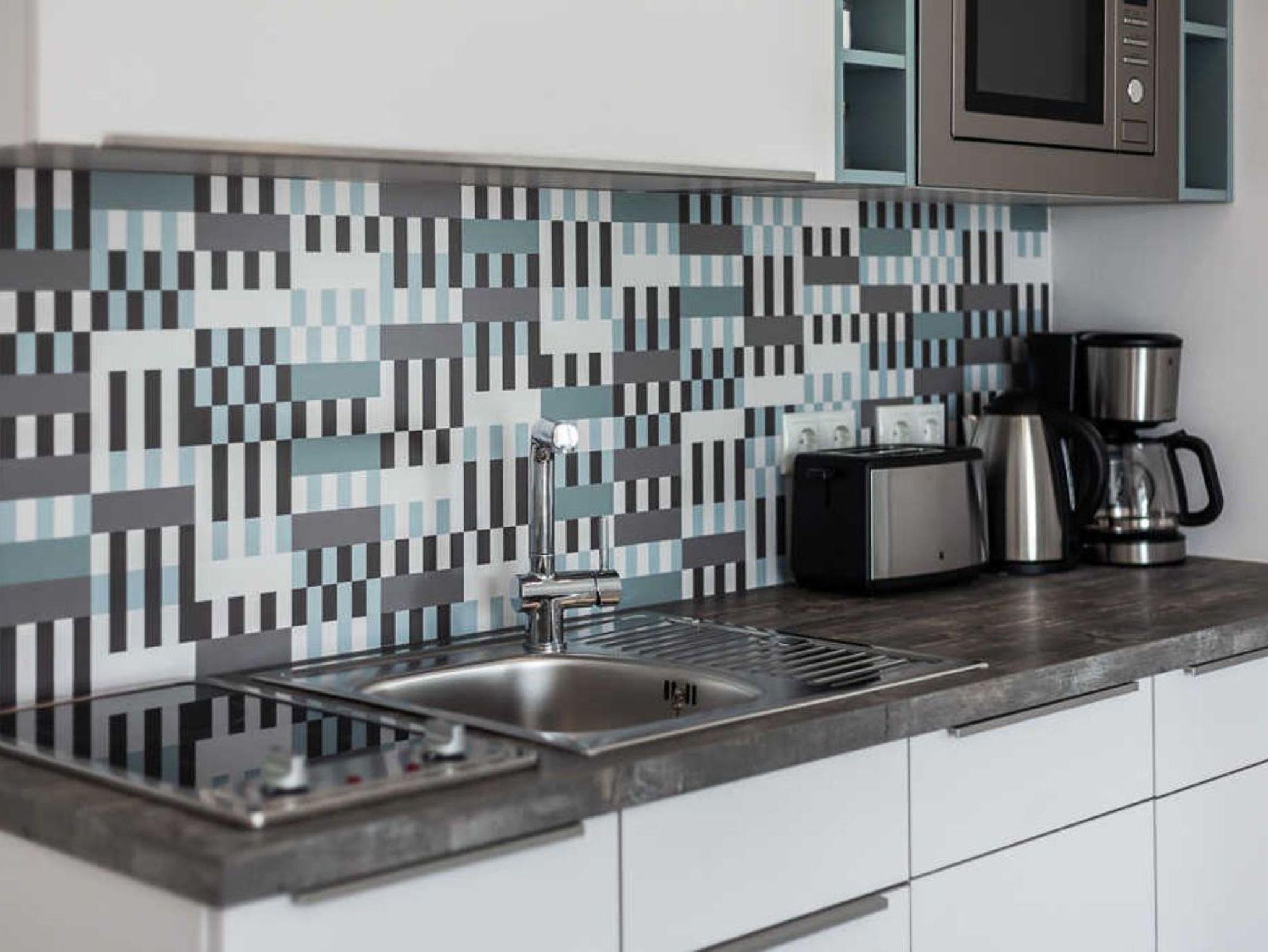 Küchenzeile mit Mikrowelle, Zweiplattenceranfeld, Kühlschrank mit Gefrierfach, Kaffeemaschine, Wasserkocher, Toaster, Geschirrspüler
