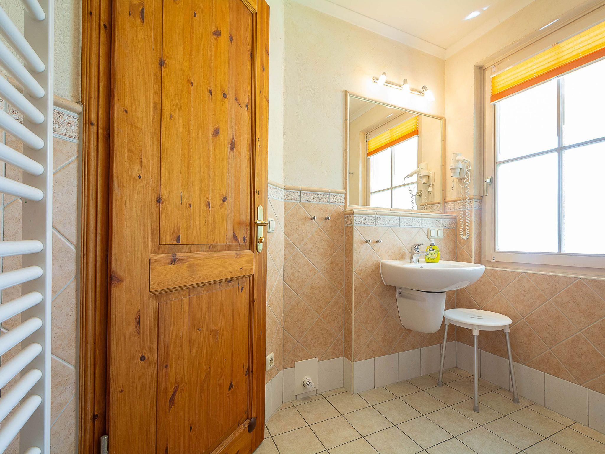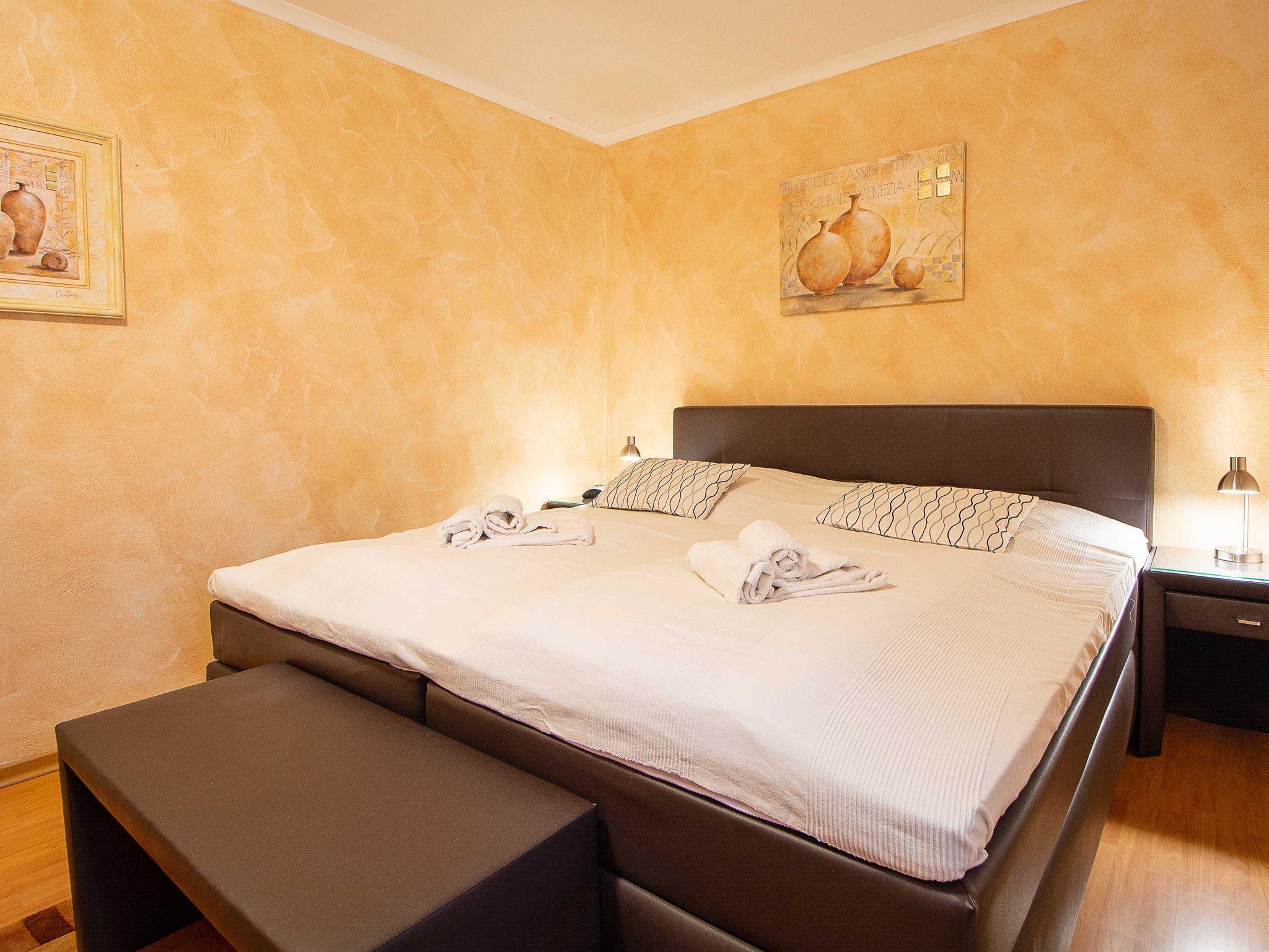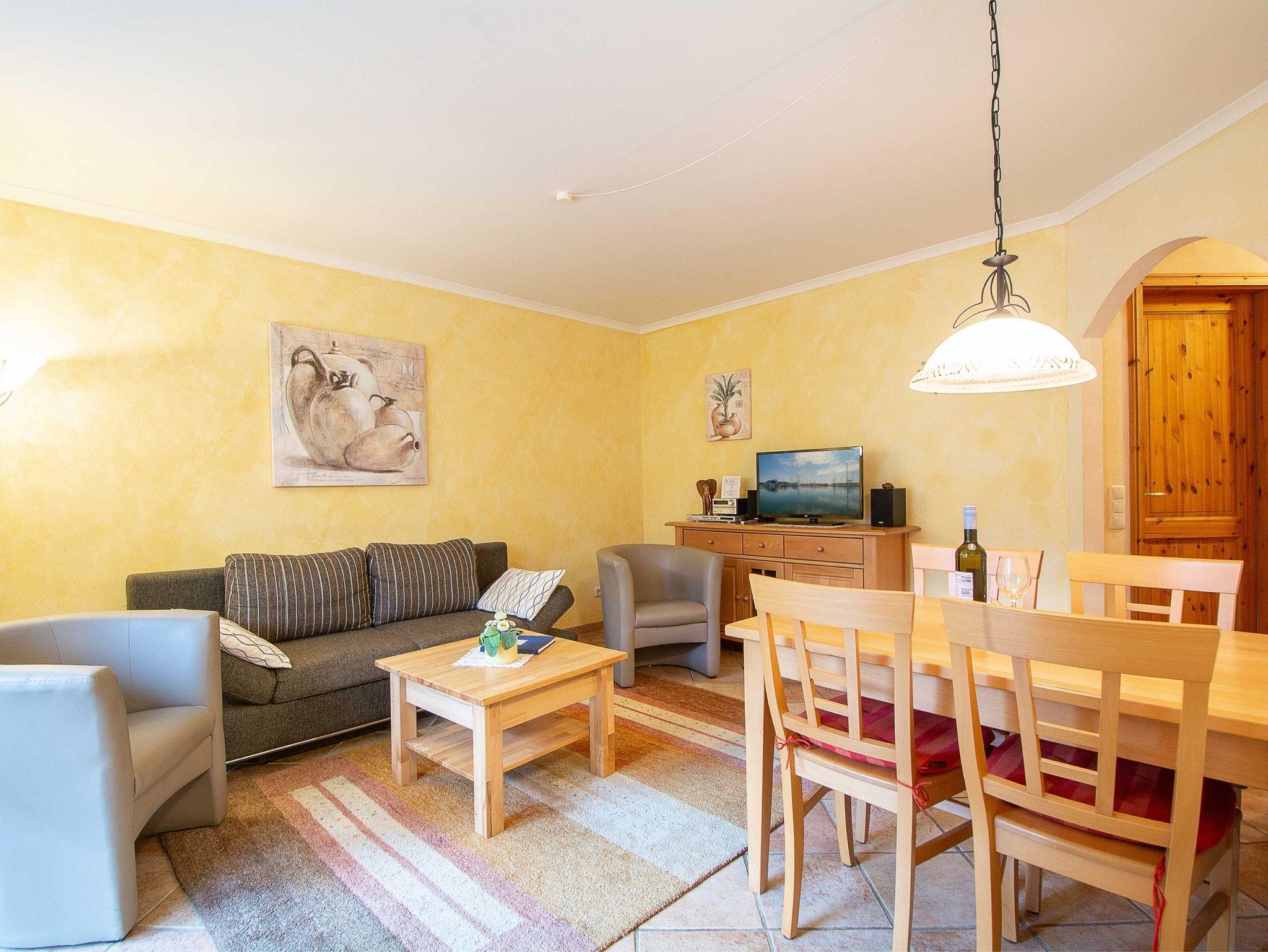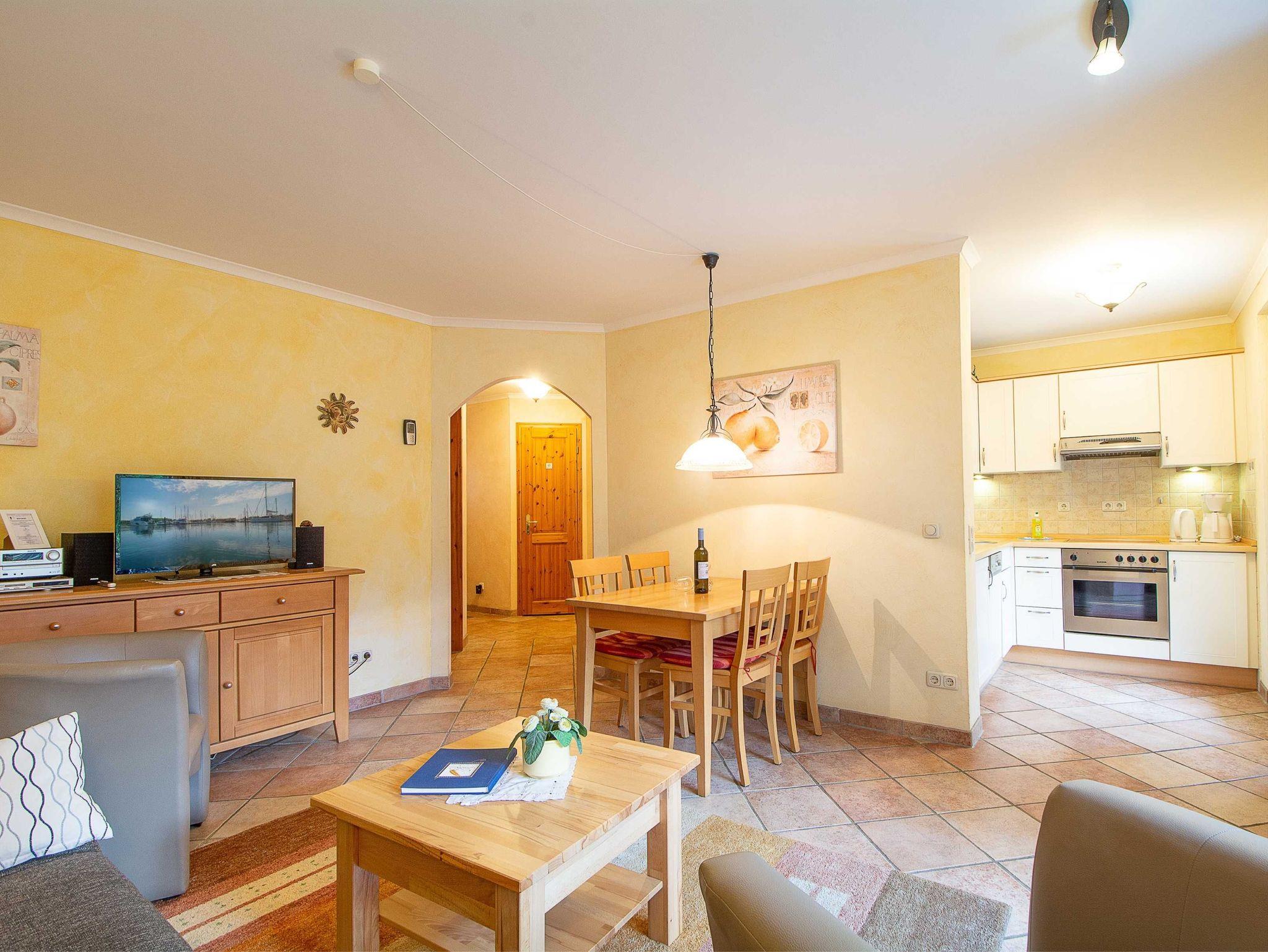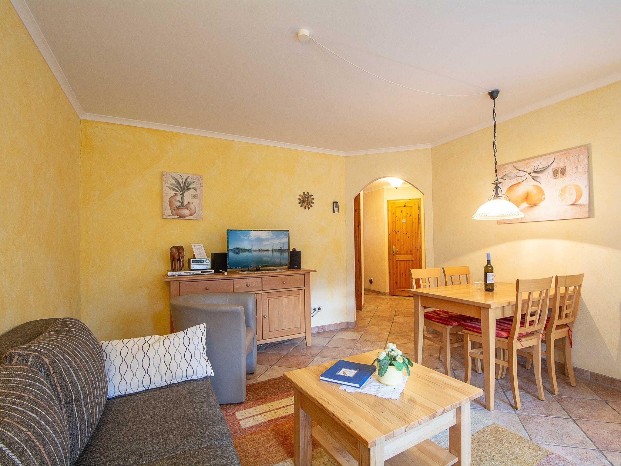 Die liebevoll eingerichtete 2-Raum-Ferienwohnung befindet sich im Erdgeschoss der Residenz Laguna und ist mit einer Größe von 54 qm ideal für 2-4 Personen geeignet. Die Wohnung ist komplett im mediterranen Stil gefliest - nur im Schlafzimmer befindet sich Laminat. Es empfängt Sie ein kombinierter Wohn- und Essbereich mit bequemer Schlafcouch (für 2 Personen) und Essecke sowie eine vollständig ausgestattete Küchenzeile mit allen wichtigen Küchengeräten (4-Platten-Ceran-Kochfeld, Backofen mit Dunstabzug, Kühlschrank mit Gefrierfach, Mikrowelle, Geschirrspüler, Kaffeemaschine, Wasserkocher, Toaster u.v.m.). Zu Ihrem Entertainment finden Sie hier einen 32 Zoll-LED-Fernseher, einen DVD-Player und eine HiFi-Anlage. Zur Auswahl stehen diverse Musik-CDs, Film- und Musik-DVDs. Vom Wohnbereich betreten Sie die schöne 18qm große Balkonterrasse, die zu 2/3 überdacht ist. Hier können Sie in der Sonne oder unterm Sonnenschirm auf einem der gemütlichen Gartenmöbel oder den beiden Sonnenliegen entspannen und den wundervollem Ausblick auf die faszinierende Wasserlandschaft im Innenhof der Anlage genießen. Das Schlafzimmer ist ausgestattet mit einem großen Boxspringbett (Liegefläche 2m x 2m) und einem großen Kleiderschrank, der genügend Platz für Ihre Urlaubsgarderobe bietet. Im gefliesten Tageslichtbad mit Dusche und WC steht Ihnen ein Handtuchheizkörper und Fußbodenheizung sowie ein Wandhaartrockner zur Verfügung. Ein Bügeleisen inkl. Bügelbrett sind ebenfalls vorhanden.