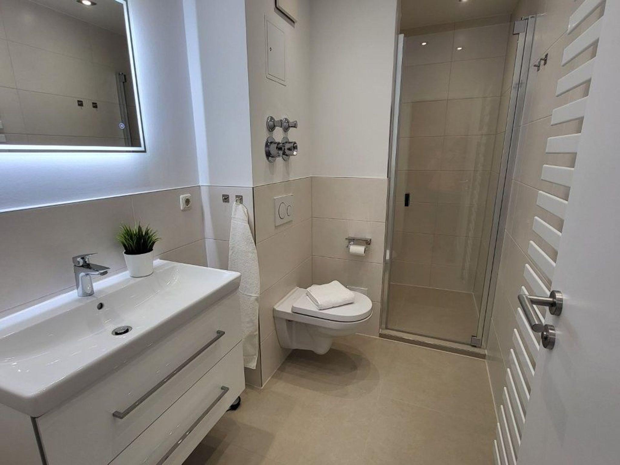 Die Wohnung verfügt über ein Badezimmer mit großzügiger Dusche und einem
